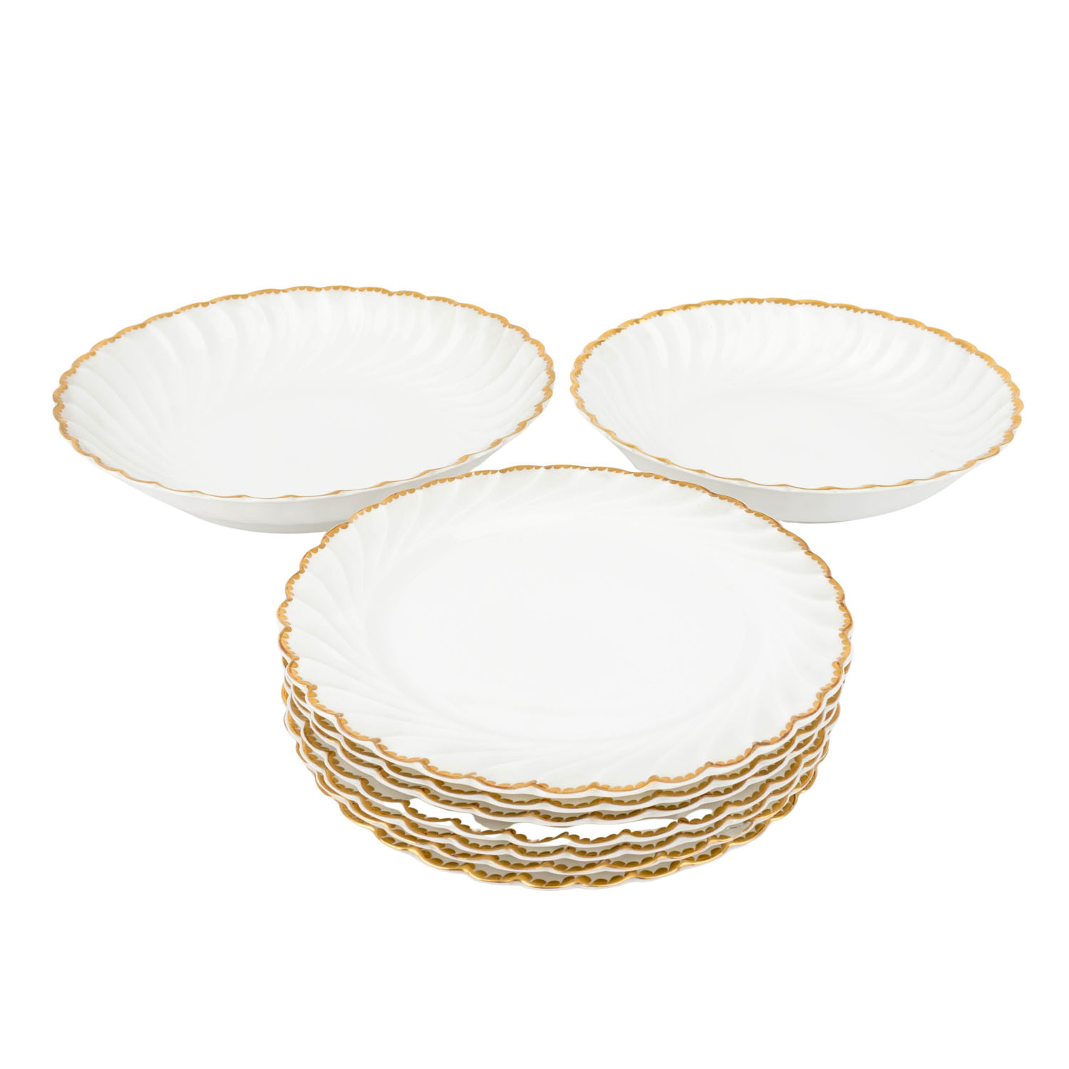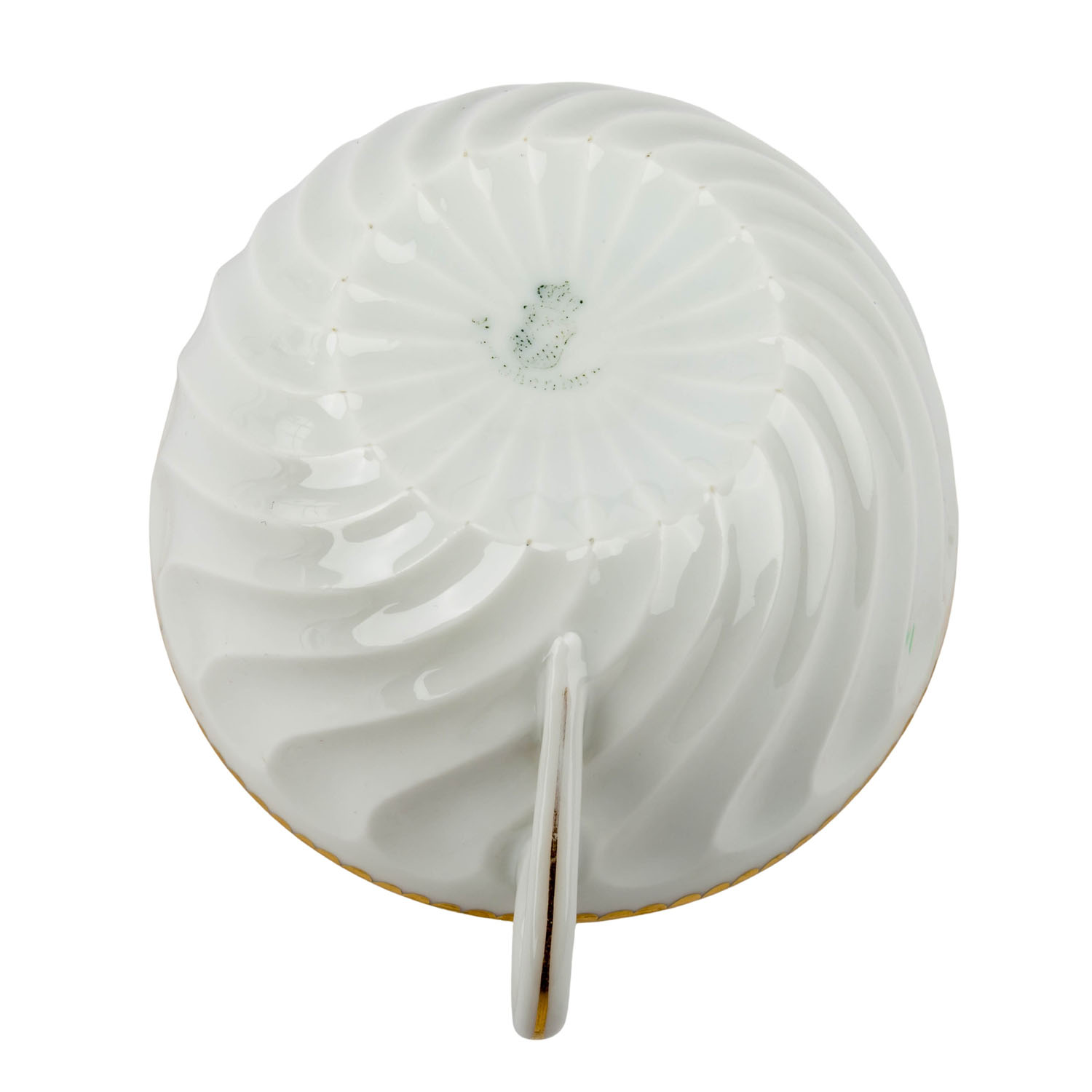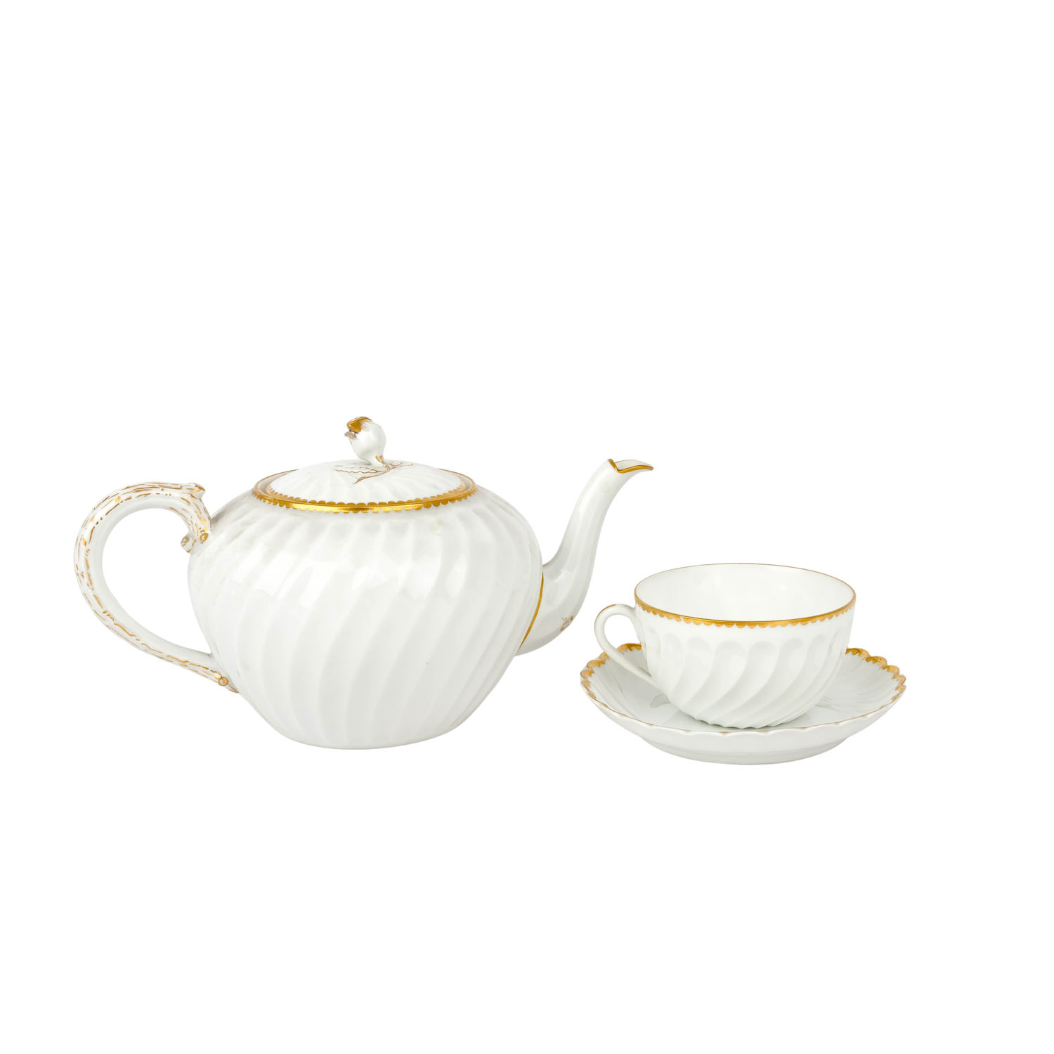 NYMPHENBURG tea service for 6 persons ‘Wave ribbed, gold edge’, 20th cent. 6 teacups, 7 saucers, 7 cake plates, 1 teapot (bumped lid rose) and 2 bowls (d. approx. 20.5-23). A total of 23 pieces, rubbed in places, slight signs of age and use.