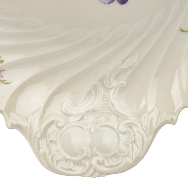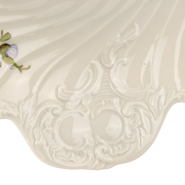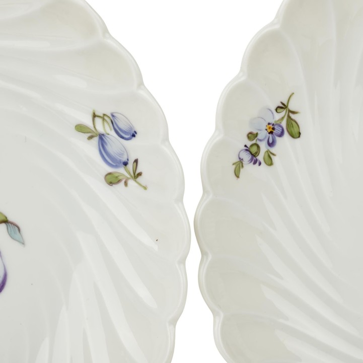 NYMPHENBURG two bowls, 20th century, white porcelain with fan relief and floral decoration, each with handle, D 23 cm, slight signs of age, 1st choice.
