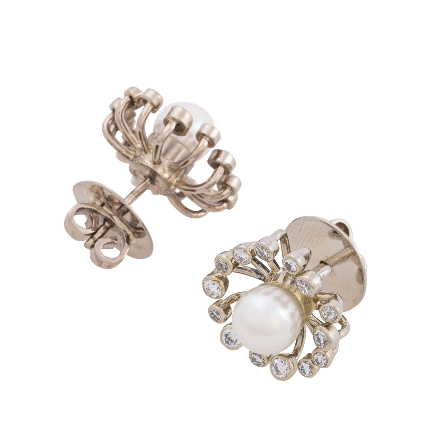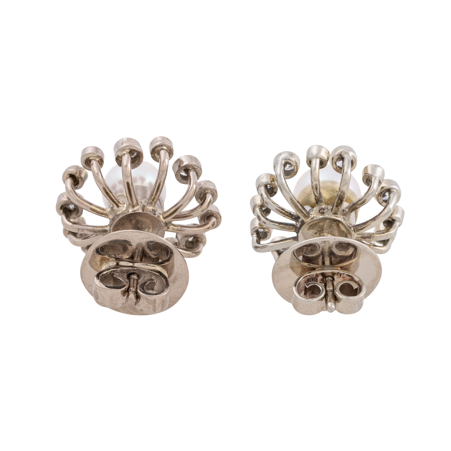 Stud earrings with 2 Akoya pearls and 28 brilliant-cut diamonds totalling ca. 0.48 ct, ca. WHITE (H)/SI-P, cultured pearls: white-rose-colored pearl, fine luster, round shape, D: ca. 6 mm, 18K white gold, 7 g, surface slightly blackened, D: ca. 15.4 mm, 20th/21st century, minor signs of wear.