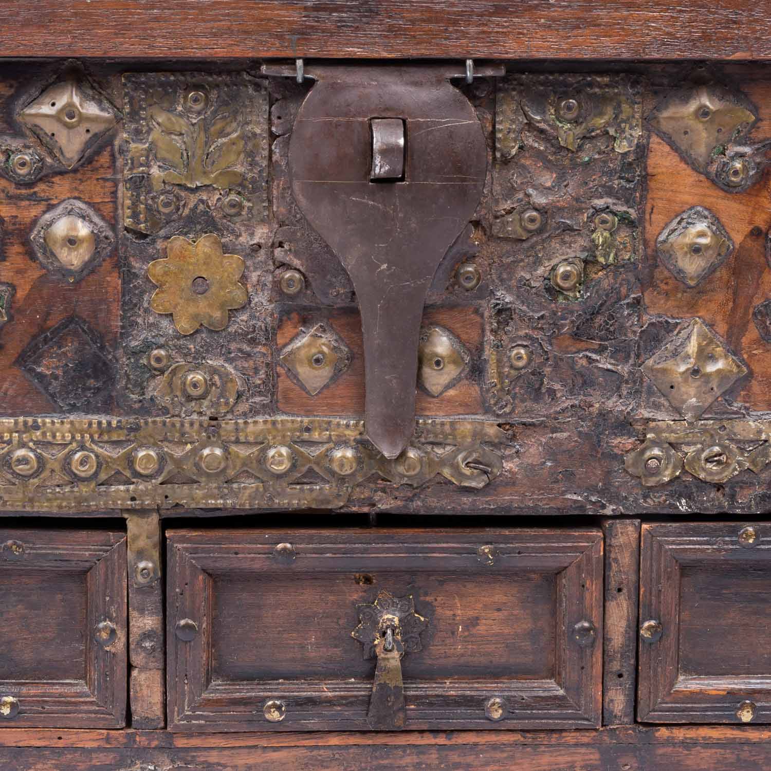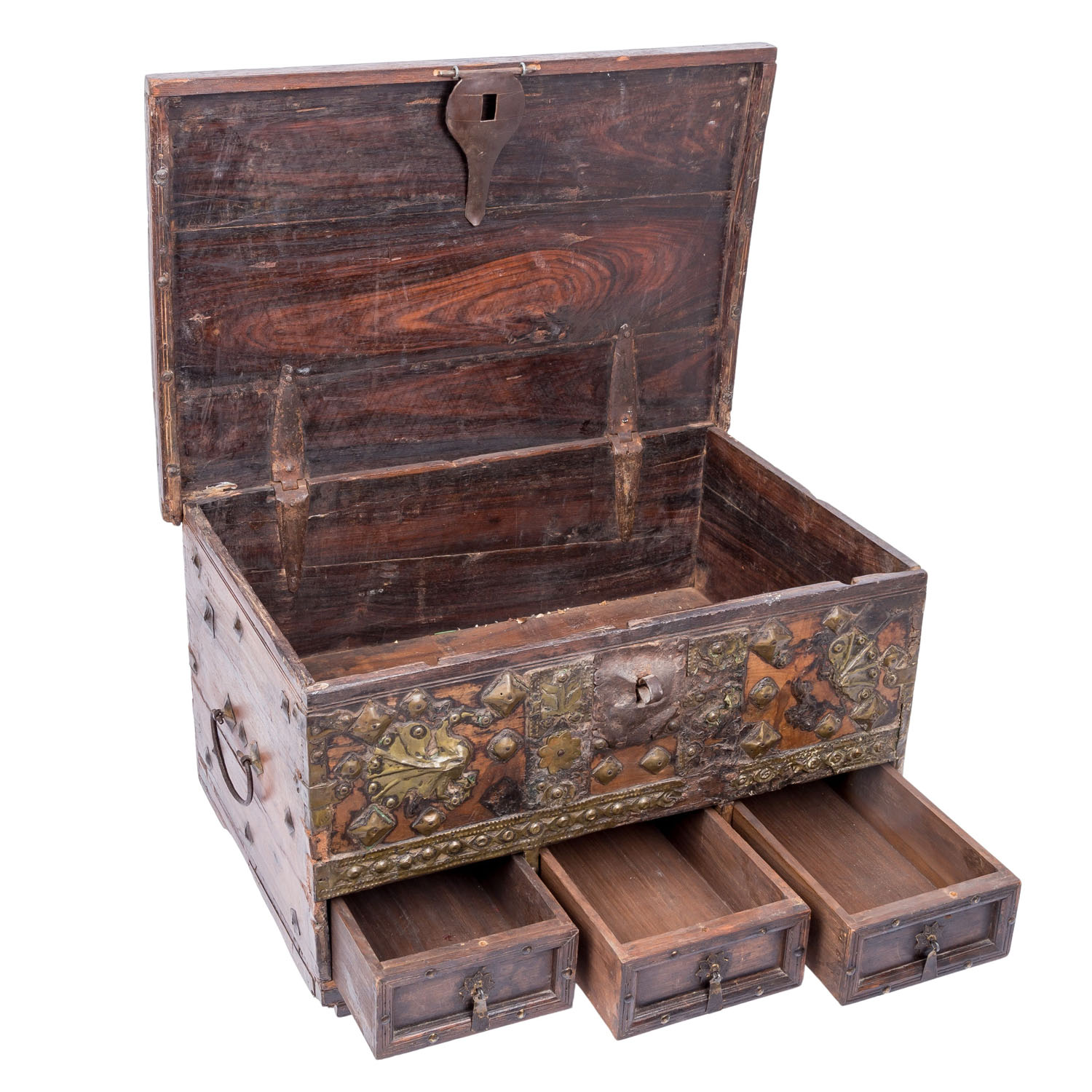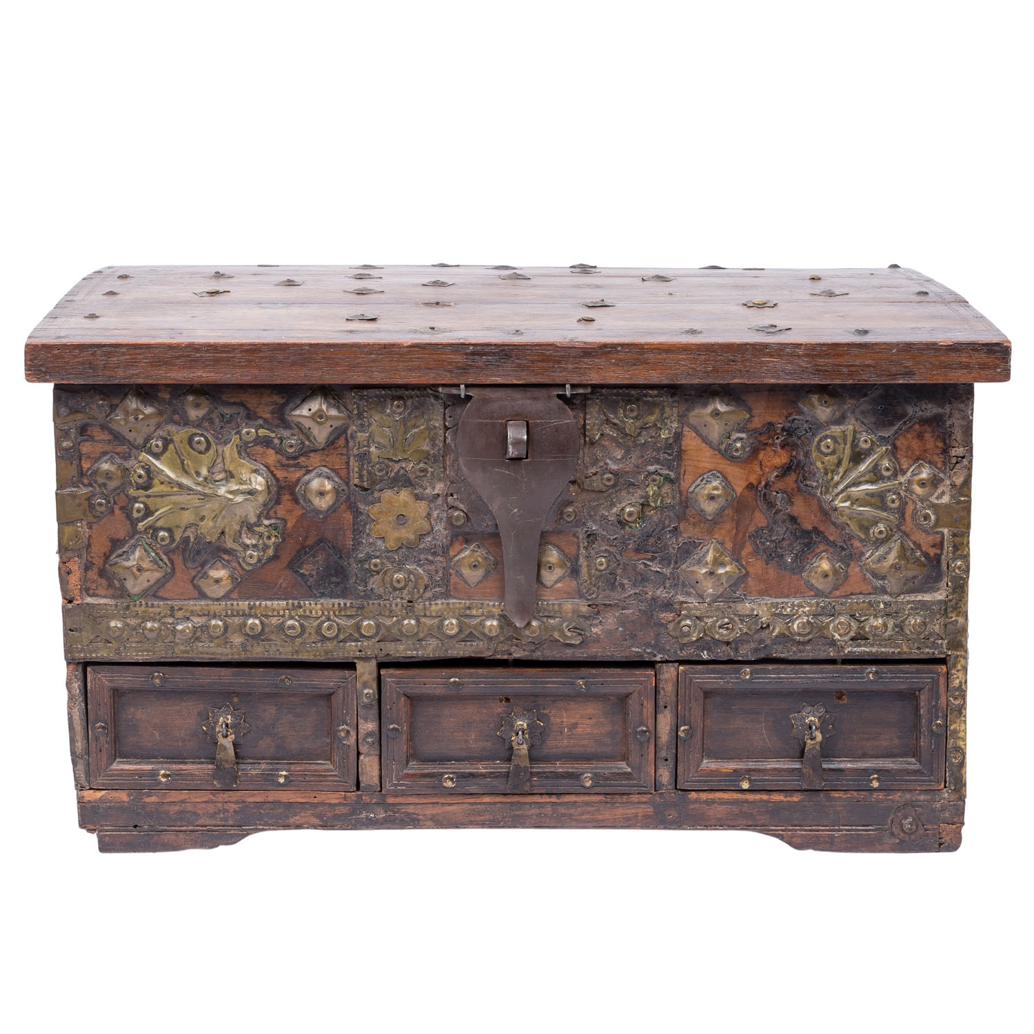 Wood/brass, flat-lidded chest with three pedestal drawers, rectangular body with hinged lid, hinged lid compartment inside, all visible sides with ornamentally punched sheet metal fittings and pattern with decorative nail fittings, hinged handles on the sides, HxWxD: approx. 28/51/35 cm. Signs of age and wear.