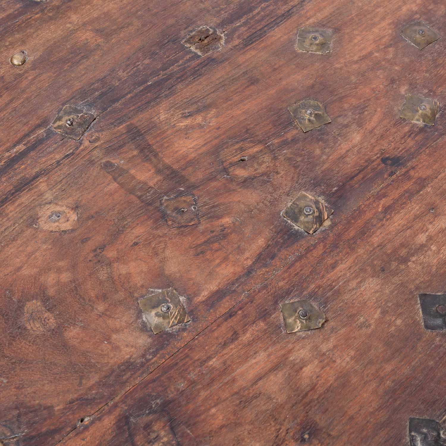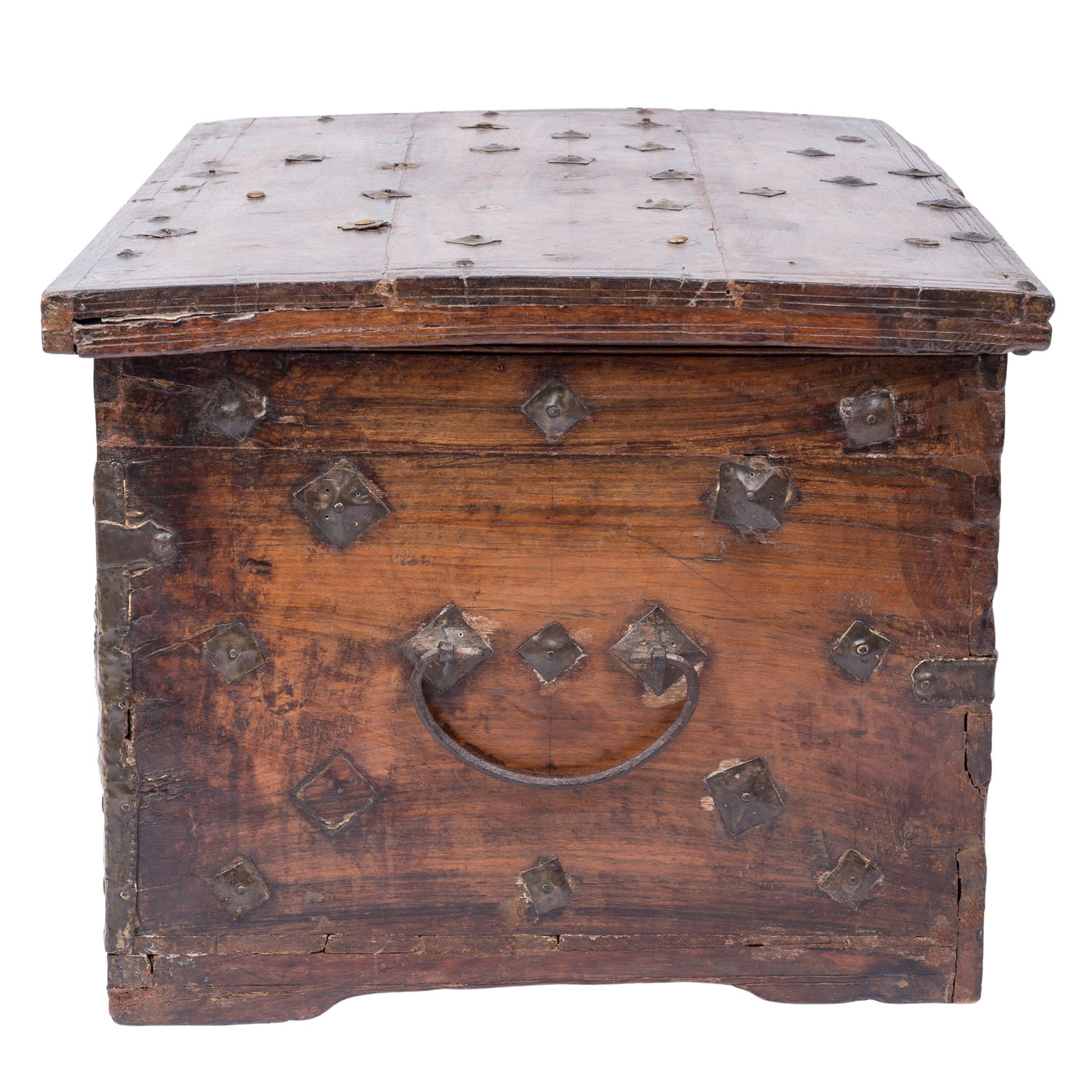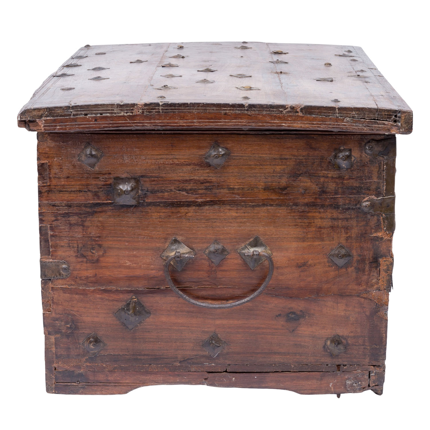 Wood/brass, flat-lidded chest with three pedestal drawers, rectangular body with hinged lid, hinged lid compartment inside, all visible sides with ornamentally punched sheet metal fittings and pattern with decorative nail fittings, hinged handles on the sides, HxWxD: approx. 28/51/35 cm. Signs of age and wear.