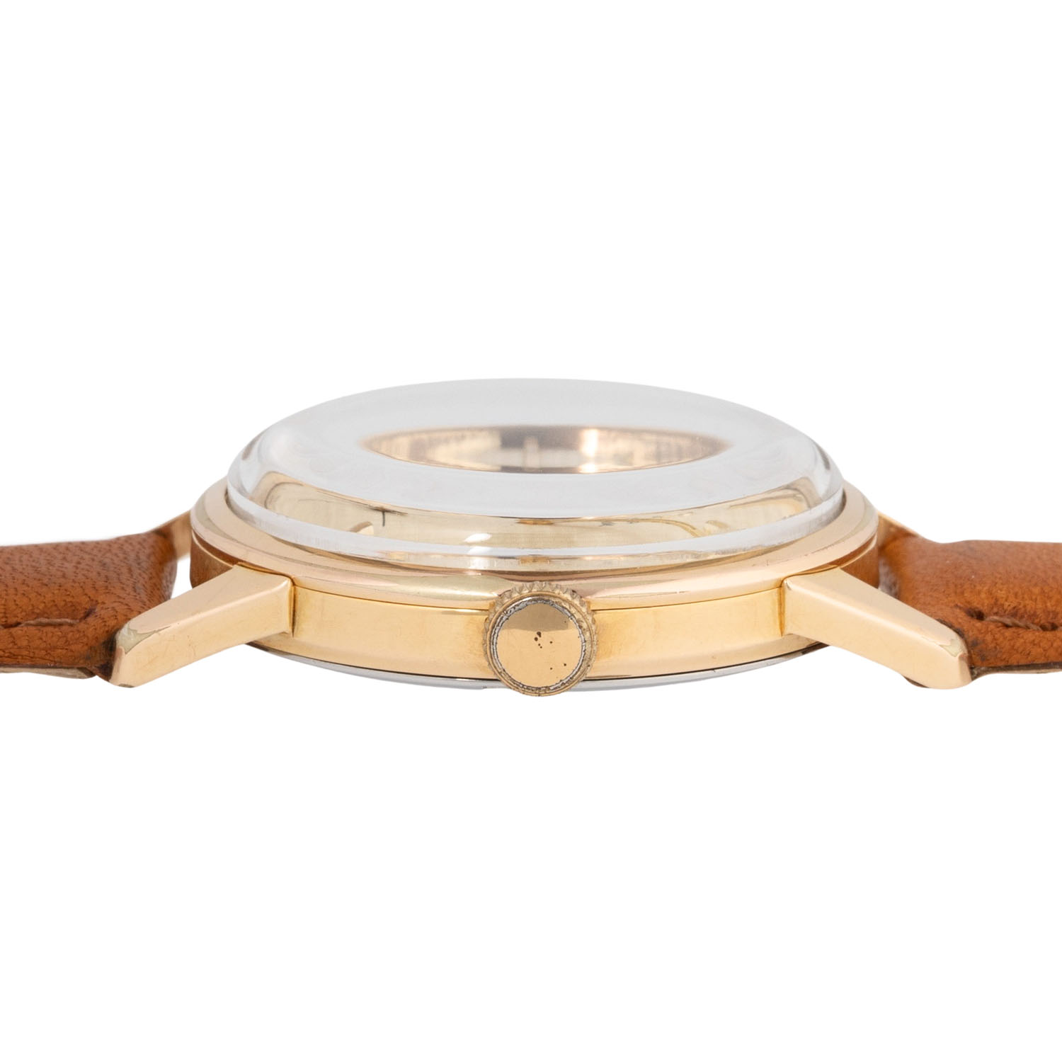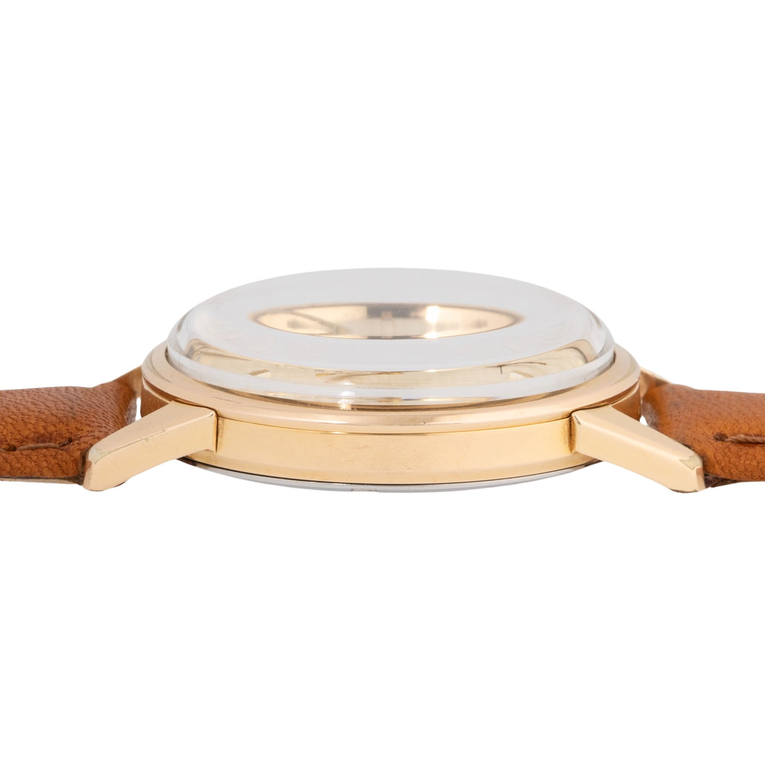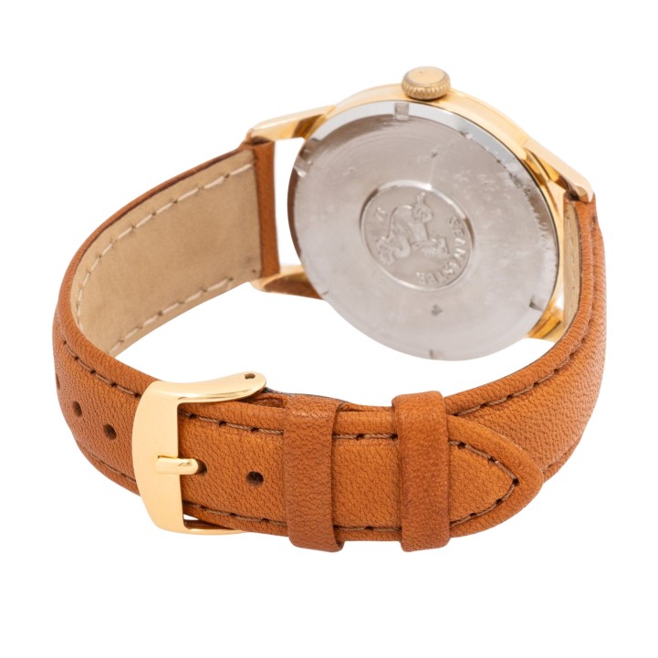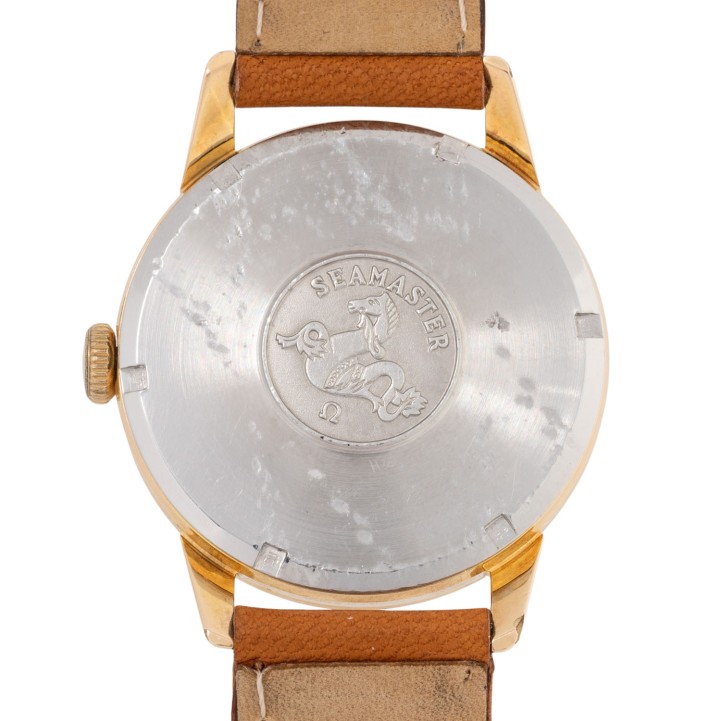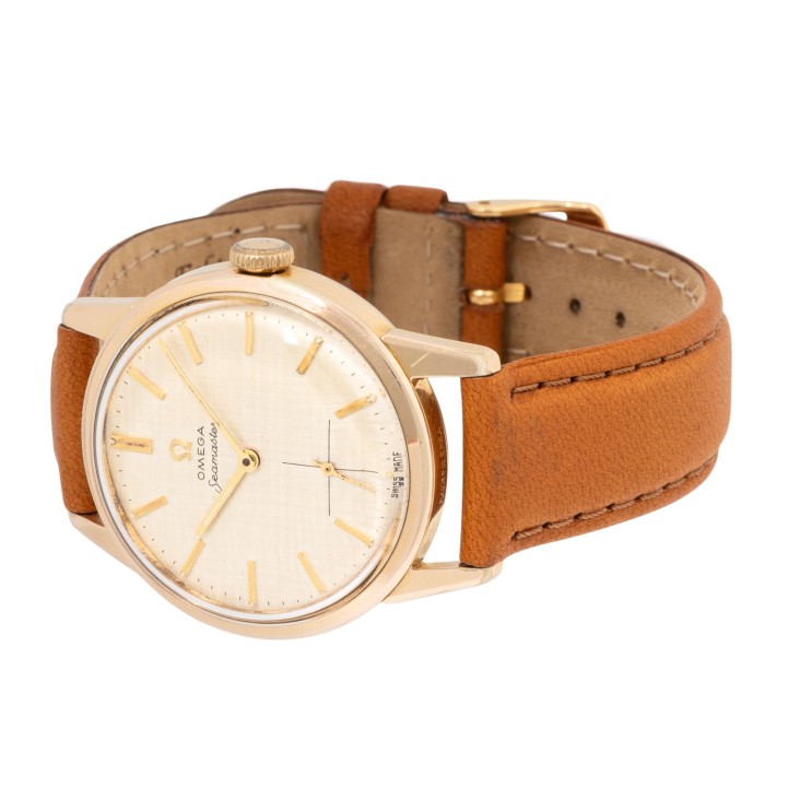 OMEGA Seamaster vintage men's watch Ref. 14389-11-CSP circa 1962. Gold-plated with steel back. Hand-wound movement Cal. 269 with very good timekeeping (+2 sec., 287° amplitude). Silver linen dial with small seconds at 6 o’clock. New leather strap with gold-plated pin buckle. Good condition on the gold-plated case, case back with noticeable wear marks. Diameter approx. 35mm, measured without crown.