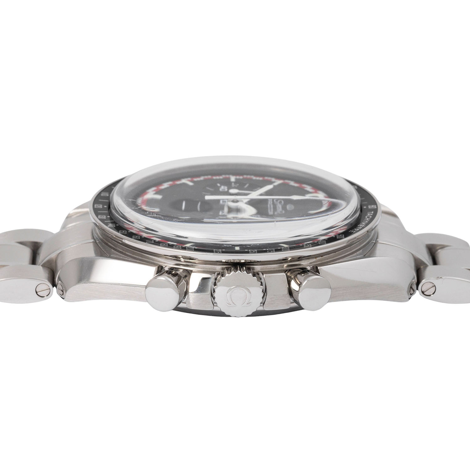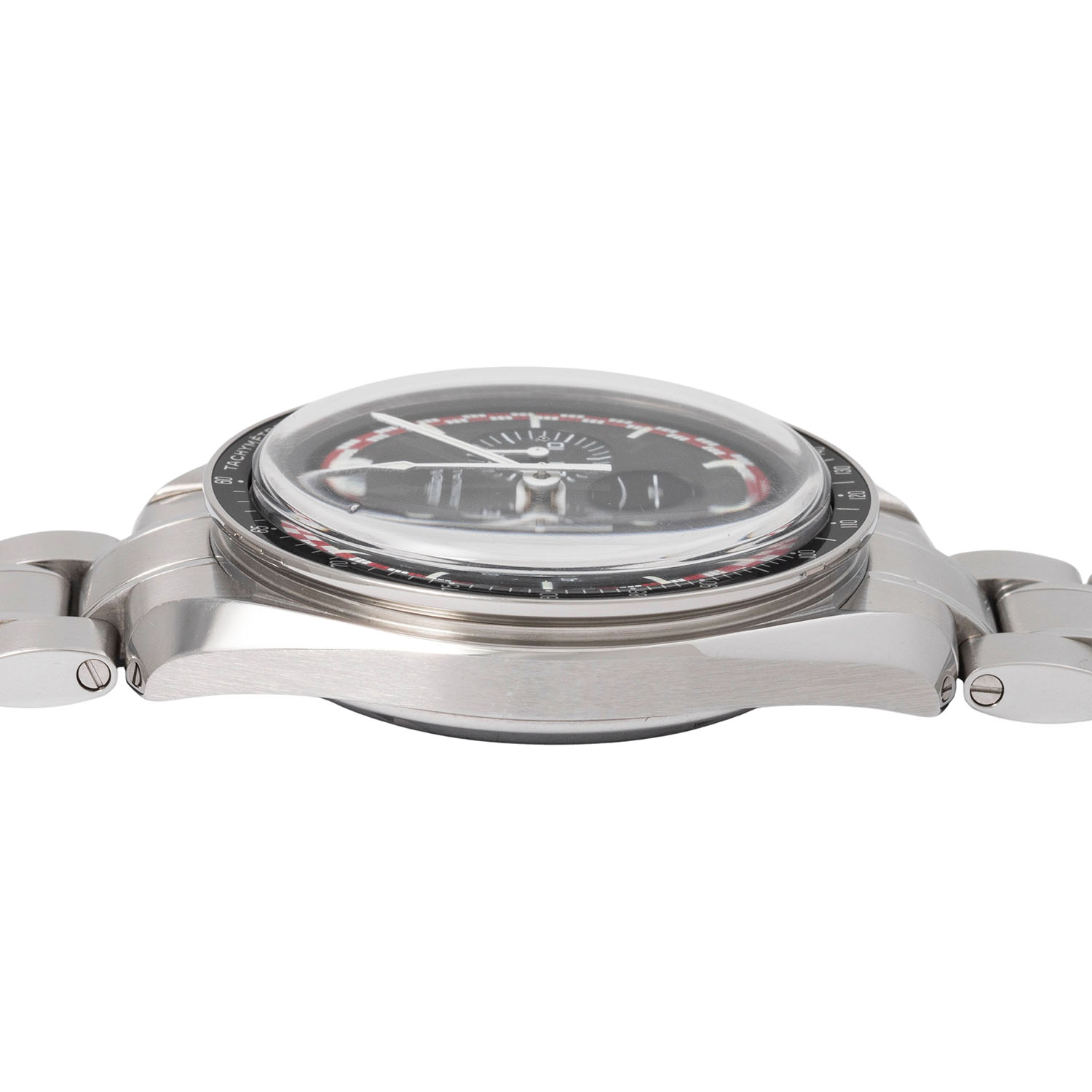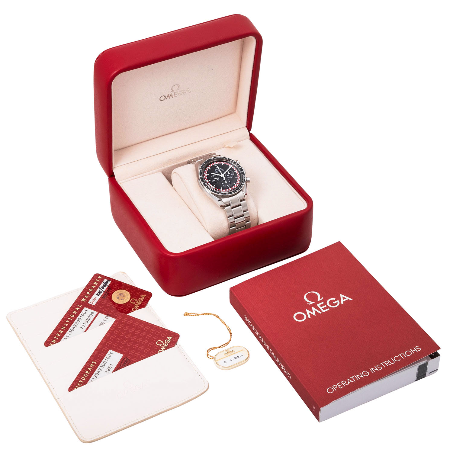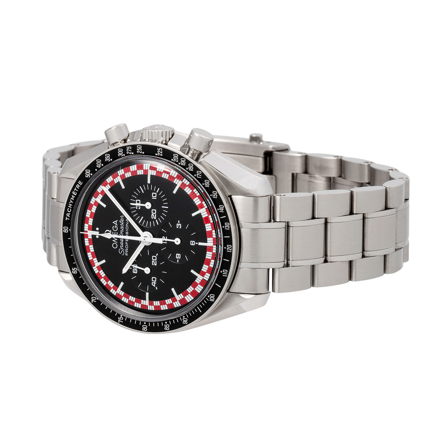 OMEGA Speedmaster Professional 'Tin Tin', Ref 311.30.42.30.01.004 men's chronograph. Box and papers. Stainless steel. Hand-wound cal. 1861 movement with very good performance (+9s/d. 330°). Black dial with 3 sub dials and small seconds. The red and white border on the dial is inspired by Tin Tin's red and white rocket, which he used to visit the moon. Bezel with tachymeter scale. Omega steel bracelet with folding clasp. Very good condition with signs of wear. Original box, card folder, hang tag with original retail price, Pictograms card and warranty card enclosed. Purchased in June 2014 from jeweler Böhnlein in Chemnitz. Diameter approx. 42 mm without crown. Fits up to approx. 20 cm wrist size.