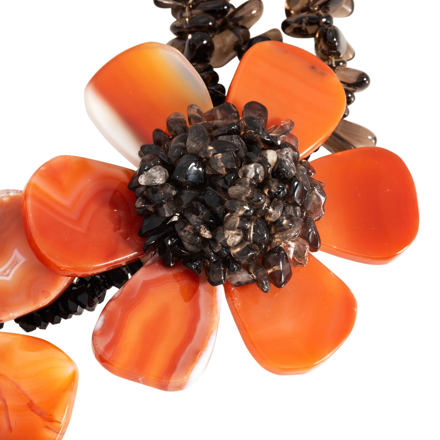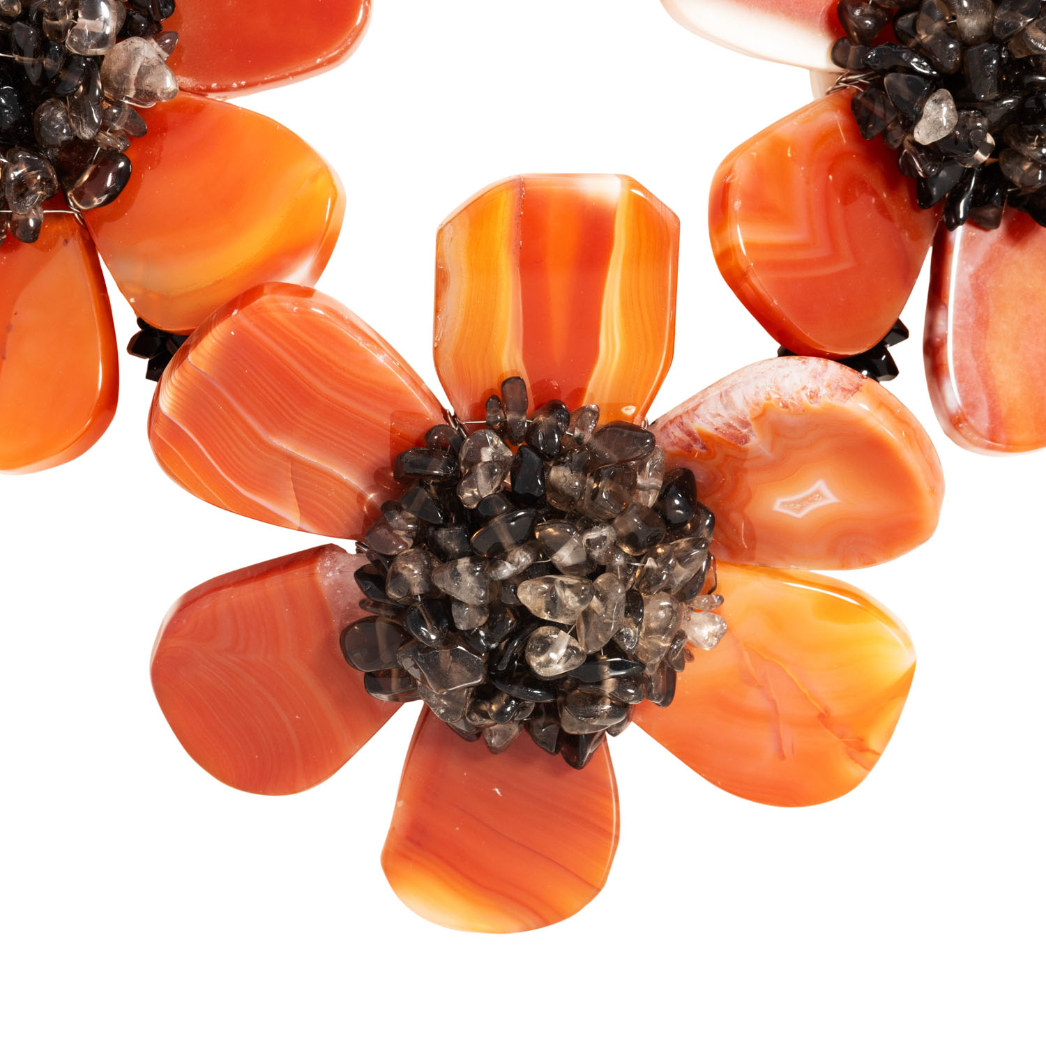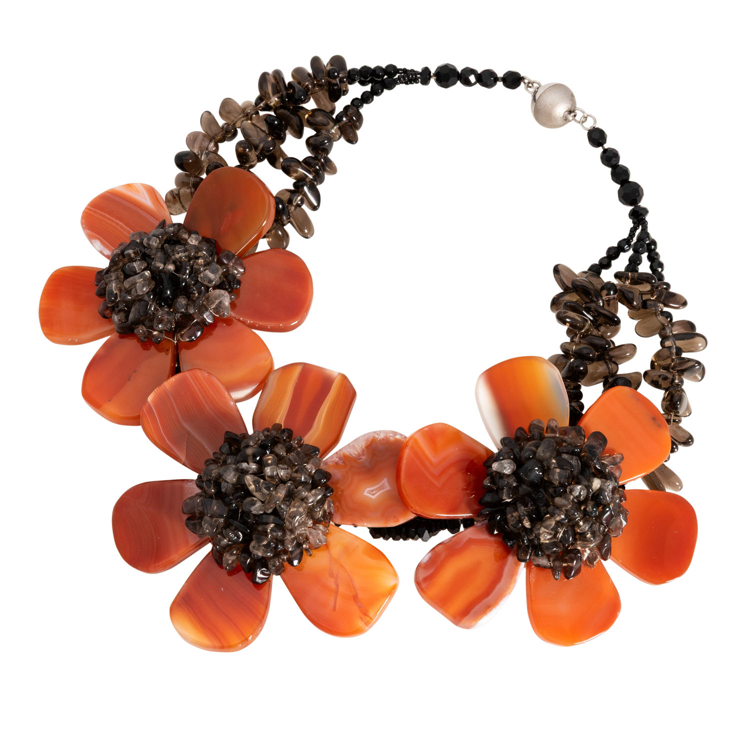 Opulent 'Flowers' stone necklace adorned with agate, smoky quartz and partially imitation or dyed stones, ca. 310.6 g, L: ca. 49 cm, 20th/21st century, signs of wear, with magnetic clasp.