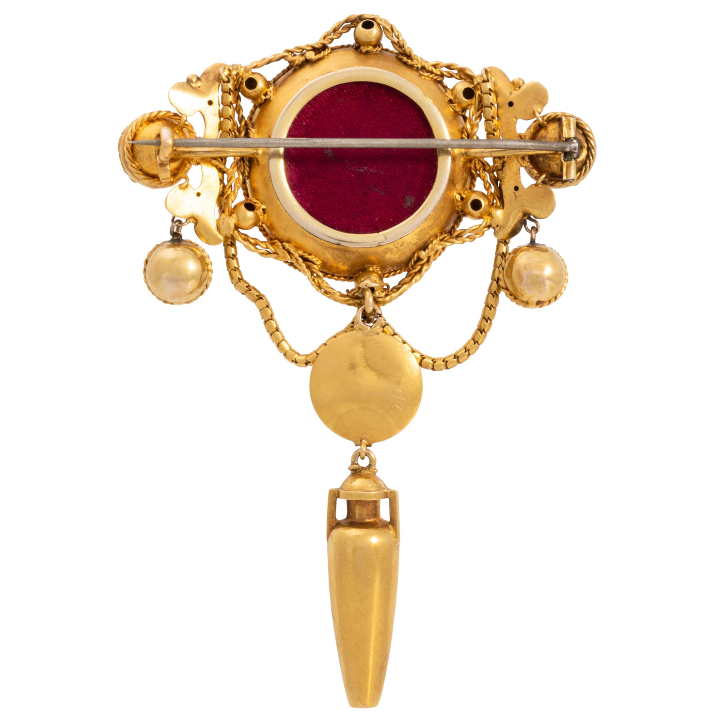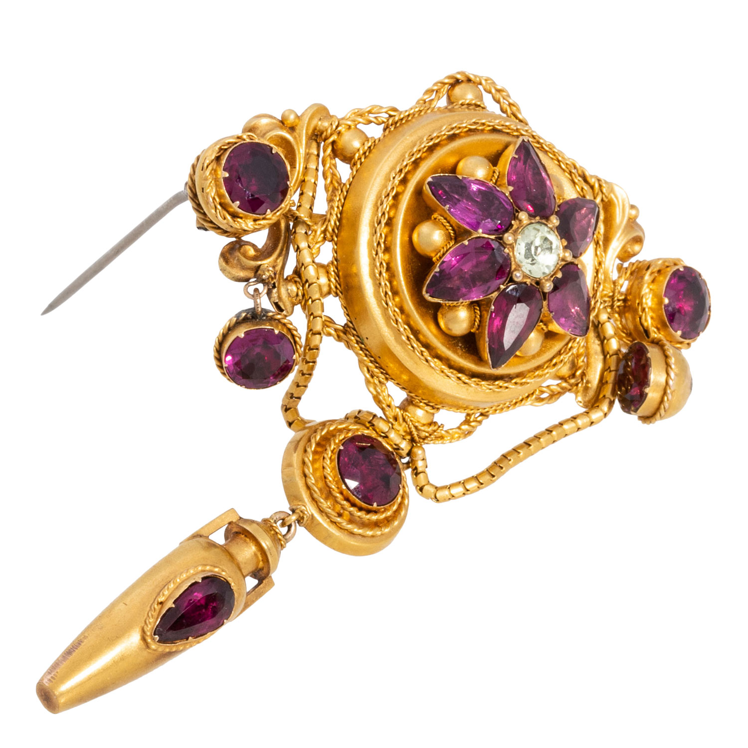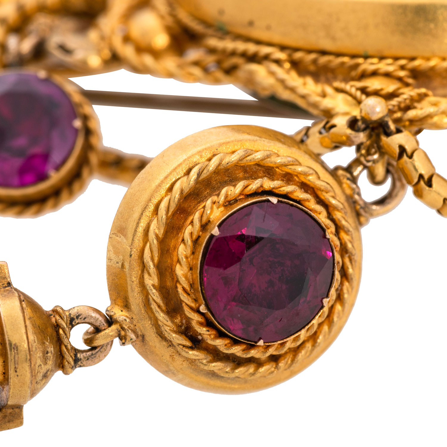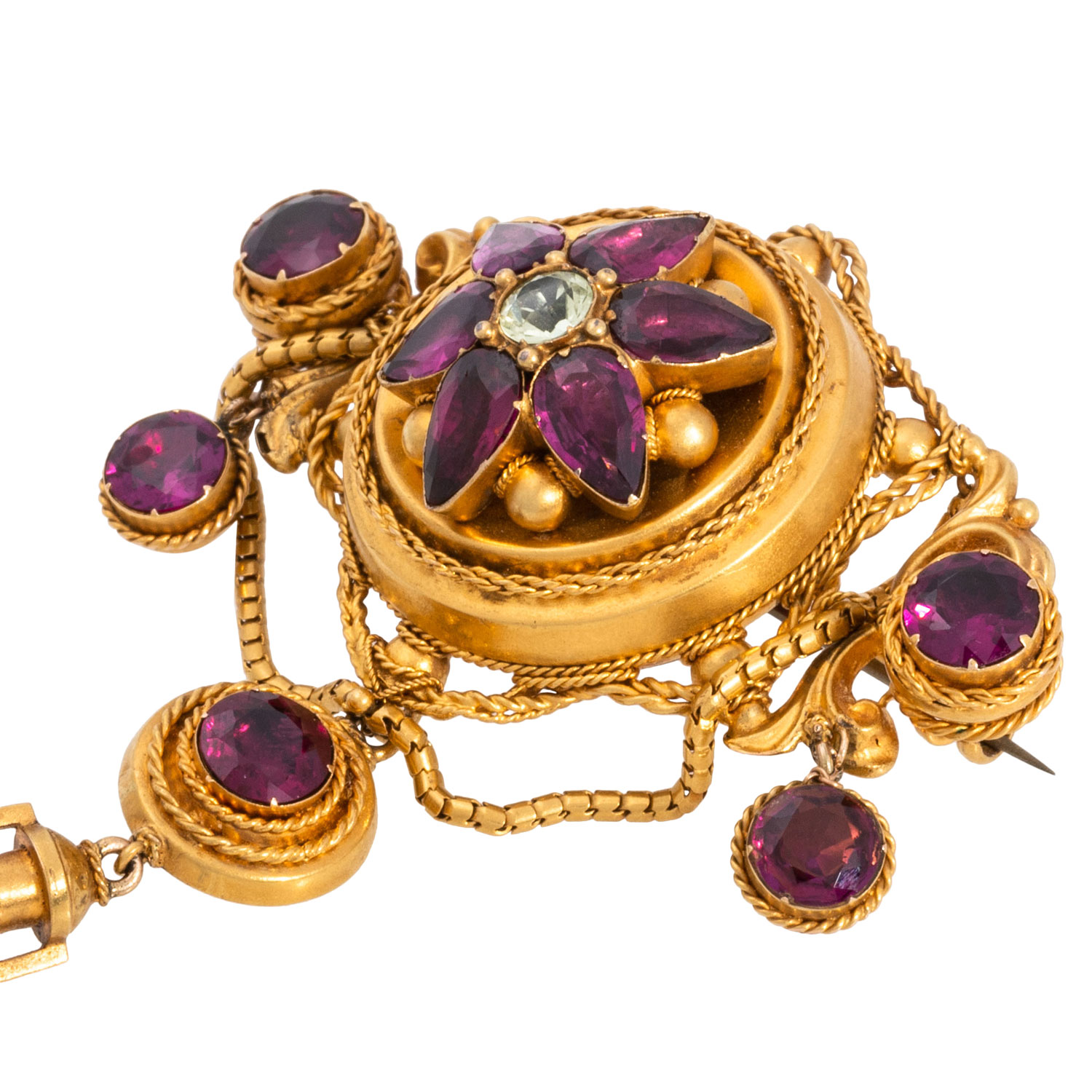 Opulent historistic memory brooch: elaborately and detailed designed, with various suspensions, set with 1 pale gemstone and 12 foiled garnets. YG 14K, fine gold plated, needle base metal. Width: 5.8 cm. Last quarter of the 19th century. Different signs of age, pressure marks, traces of soft soldering, missing glass lid. Typical of the period.