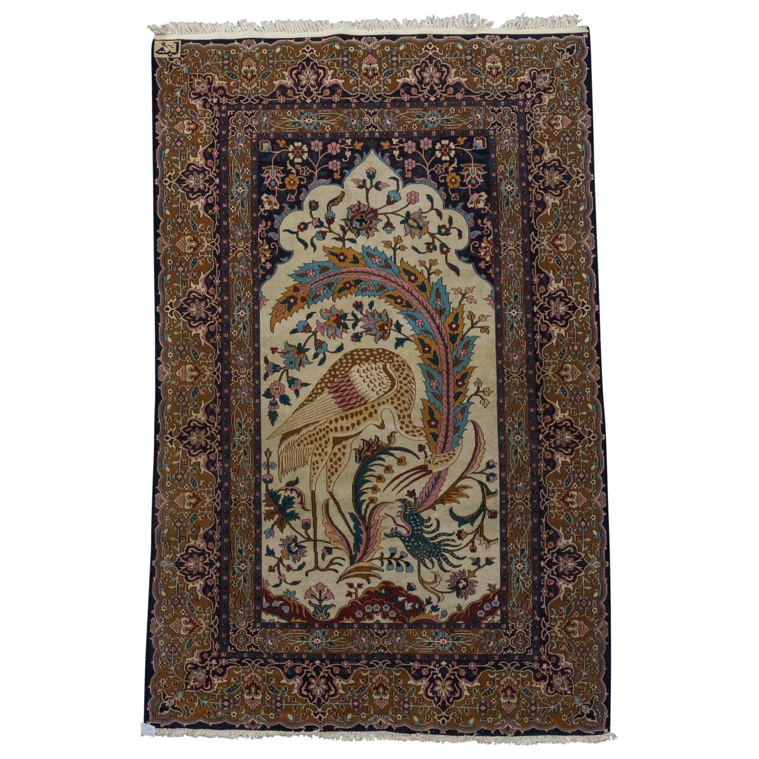Oriental carpet, 223x138 cm. The camel-colored gable field shows a large crane, wrapping its neck around a palm frond decorated with flowers. The head of a dragon approaches it from below. The upper two corner niches are dark blue. The border consists of two interlocking floral decorated friezes, one blue and one cognac. Signed on the top right.
