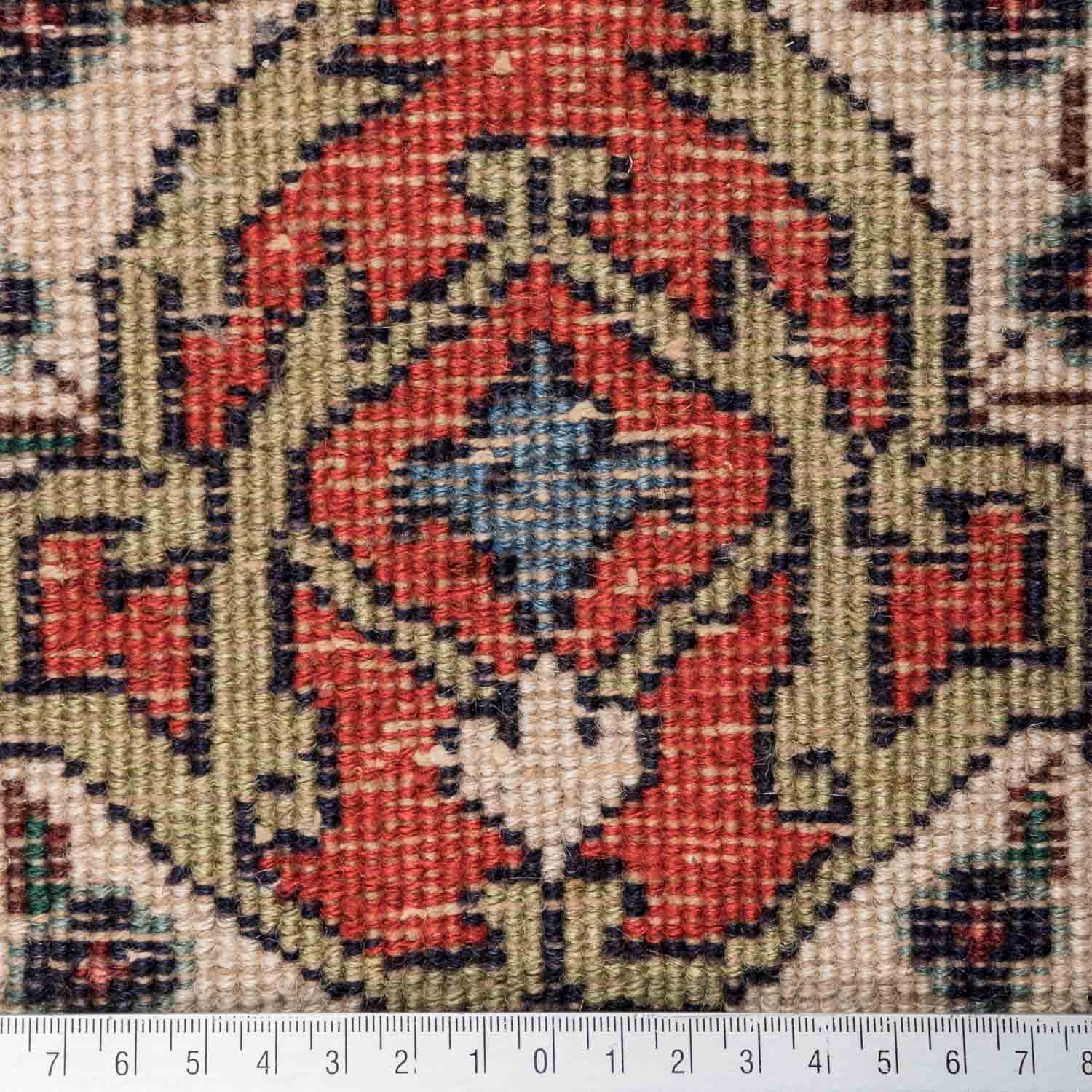 The cream-coloured ground of the central field is covered by a lattice-like design of cartouches and rosettes, interspersed with paradise garden motifs such as blossoming trees, the main border is also cream-coloured. Signs of age and wear, the carpet is worn in some areas.