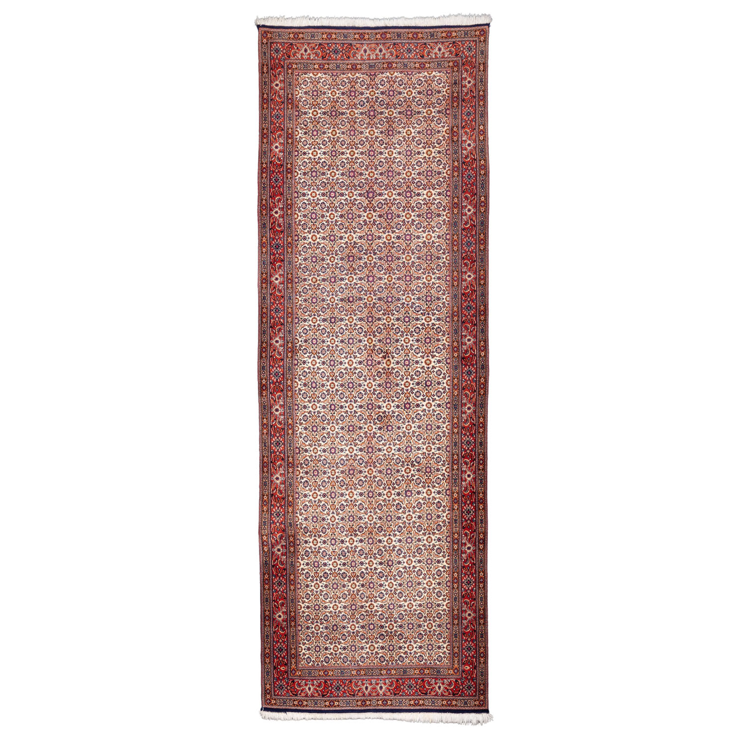 Oriental carpet gallery. BIDJAR/IRAN, 20th century, 305x110 cm. The entire light beige field is patterned with a Herati diamond pattern (fish in a pond pattern). The red main border is patterned with a turtle pattern. Signs of age and wear. NO SHIPPING TO THE USA