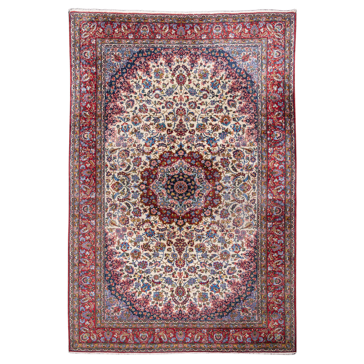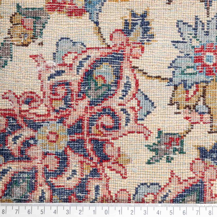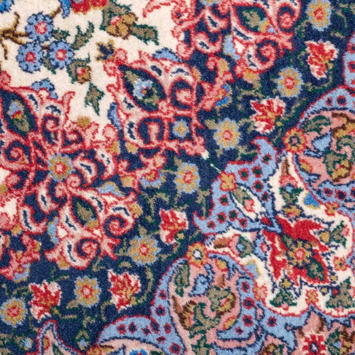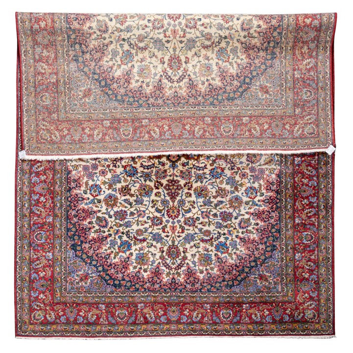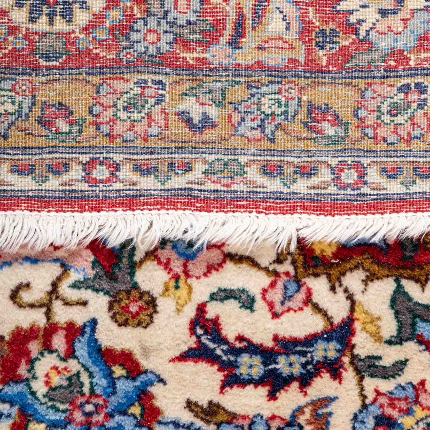 Oriental carpet. INDIA, 20th century, 289x201 cm. The light beige center field features a red central rosette and is patterned with flowers and tendrils. The corners are blue. Red main border. Approx. 280,000 knots per square meter. Signs of age and wear.