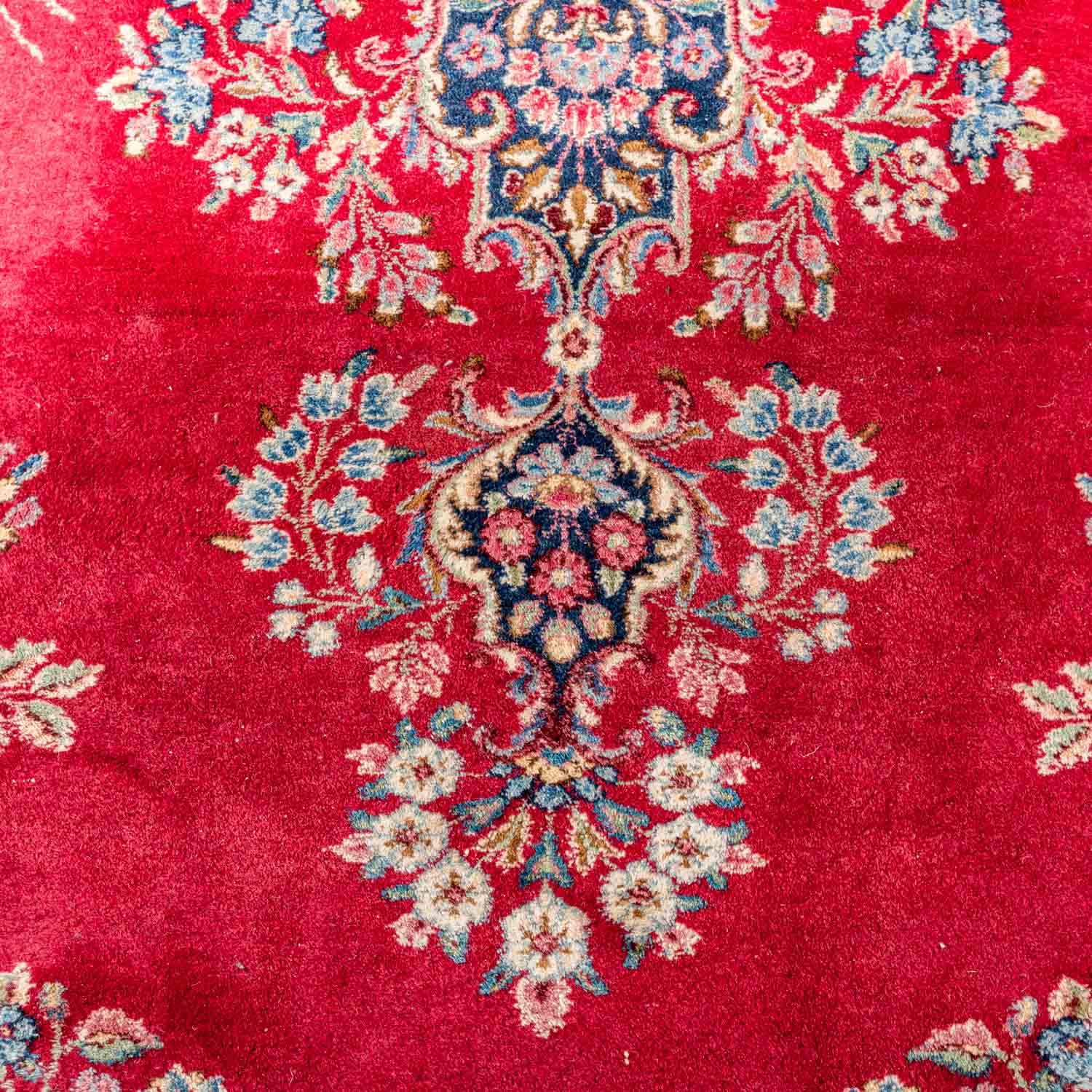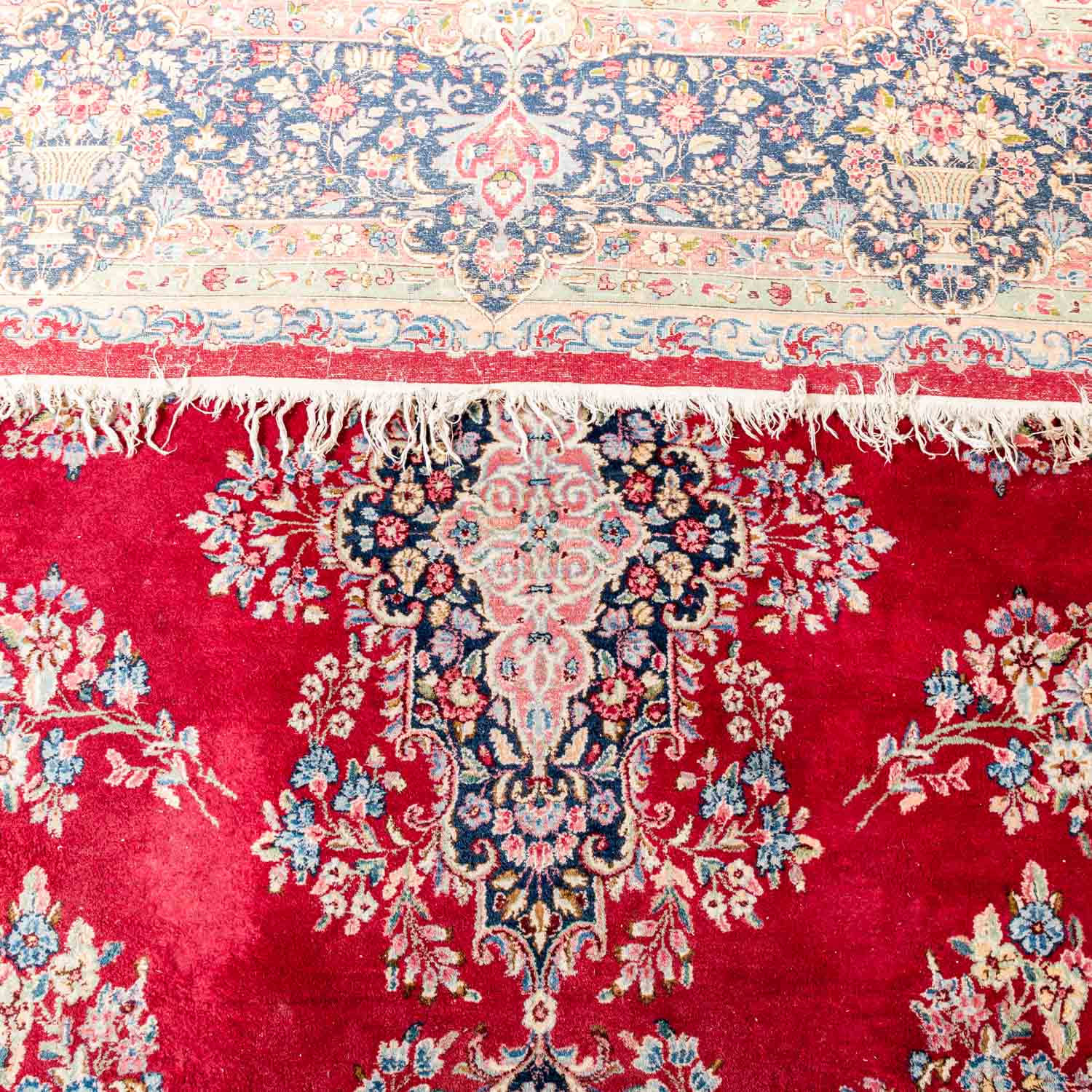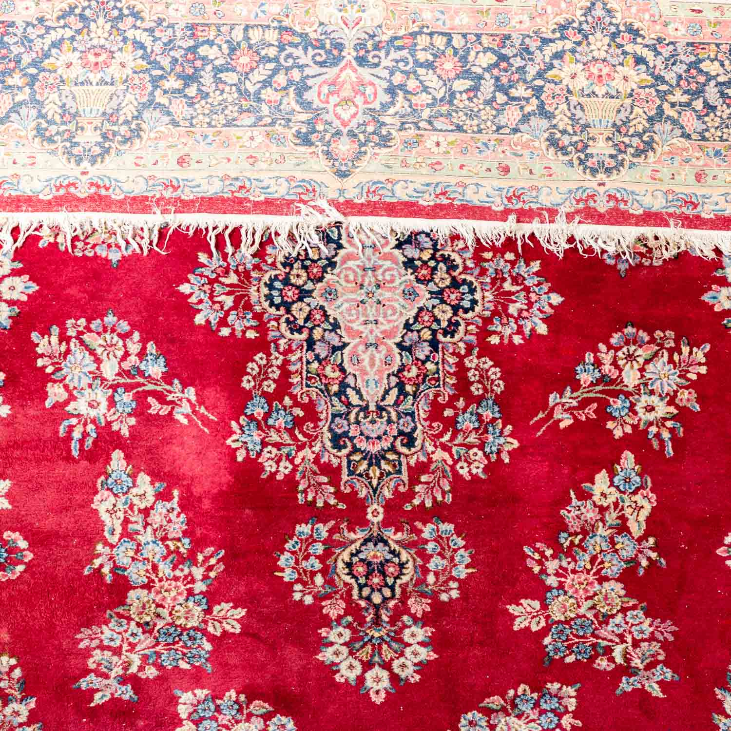 Oriental rug. Kerman/Persia, 20th ct., Medallion carpet patterned with flowering twigs on red ground. Surrounded from a wool white border and a dark blue main border. Normal traces due to age and use.
