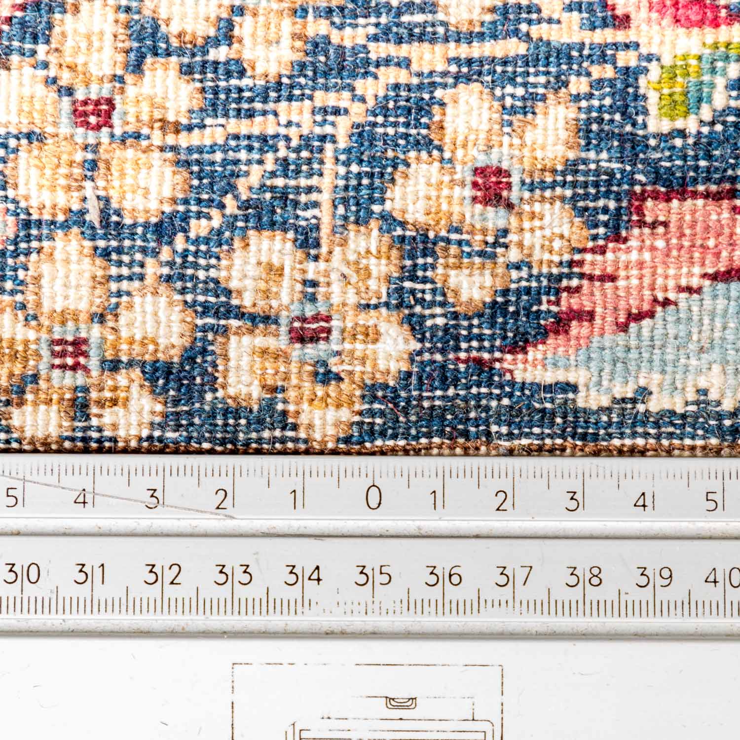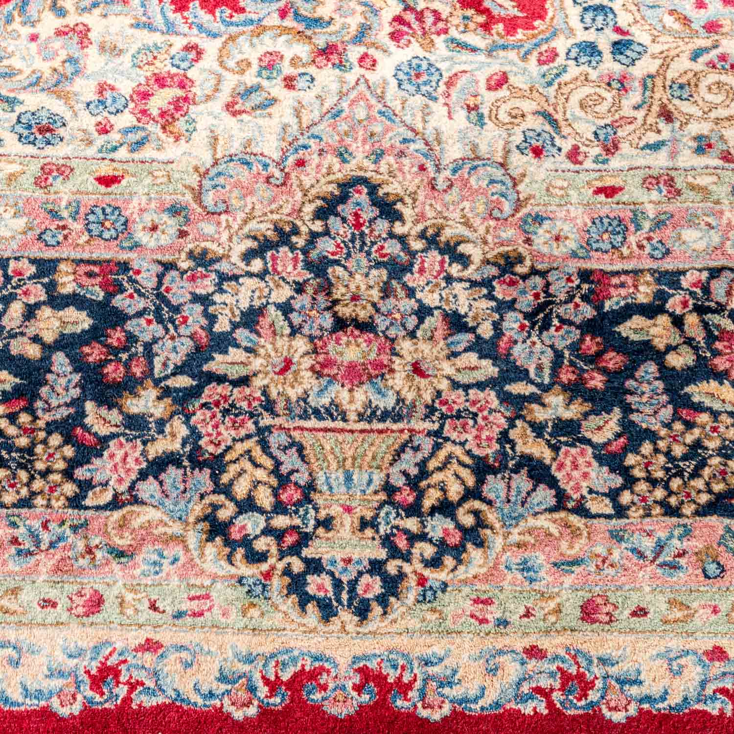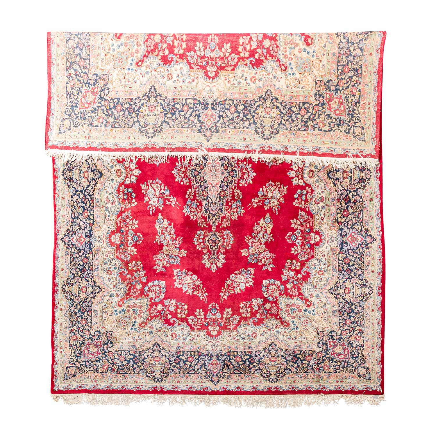 Oriental rug. Kerman/Persia, 20th ct., Medallion carpet patterned with flowering twigs on red ground. Surrounded from a wool white border and a dark blue main border. Normal traces due to age and use.