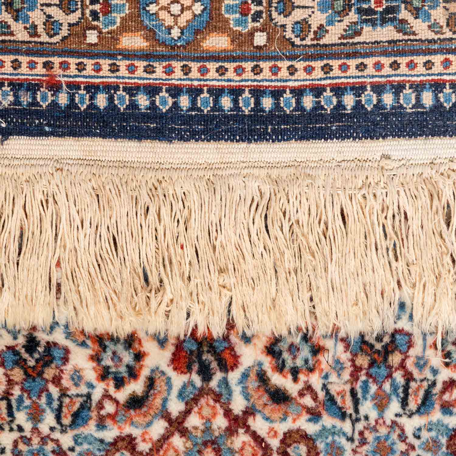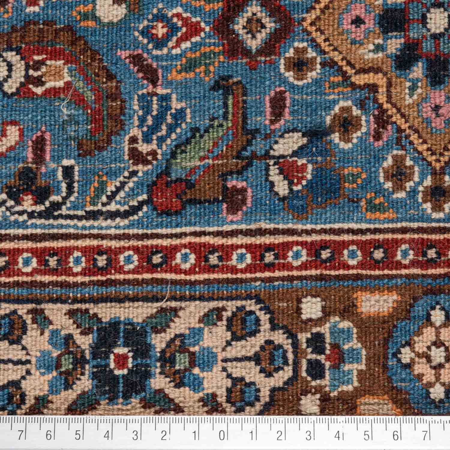 Oriental carpet. MUD/PERSIA, 20th century, 405x304 cm. The centre is dominated by a dark blue and a beige hexagon. The entire background of the central field is covered with a net-like ‘mahi-to-hosh’ motif. It consists of diamonds, each containing a water lily and surrounded by four fish. The bright indigo blue main border is patterned with a turtle design. Signs of age and wear, slightly stained and damaged at the edges, particularly in the fringe area. Acquired in 1972 in Göppingen for the equivalent of €4925. NO SHIPPING TO THE USA