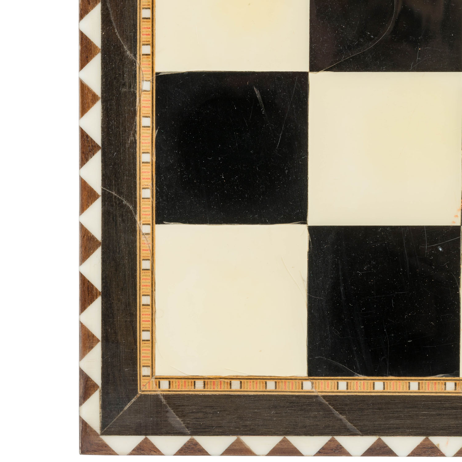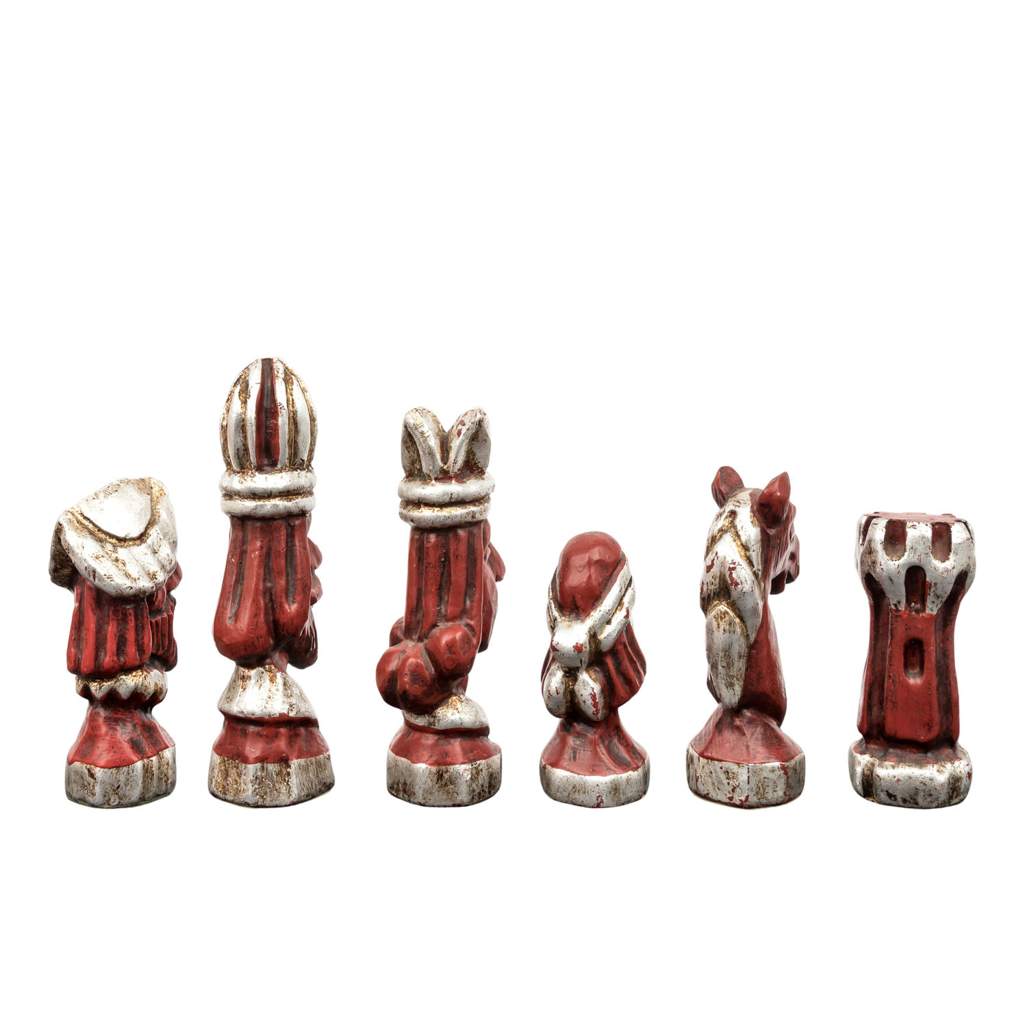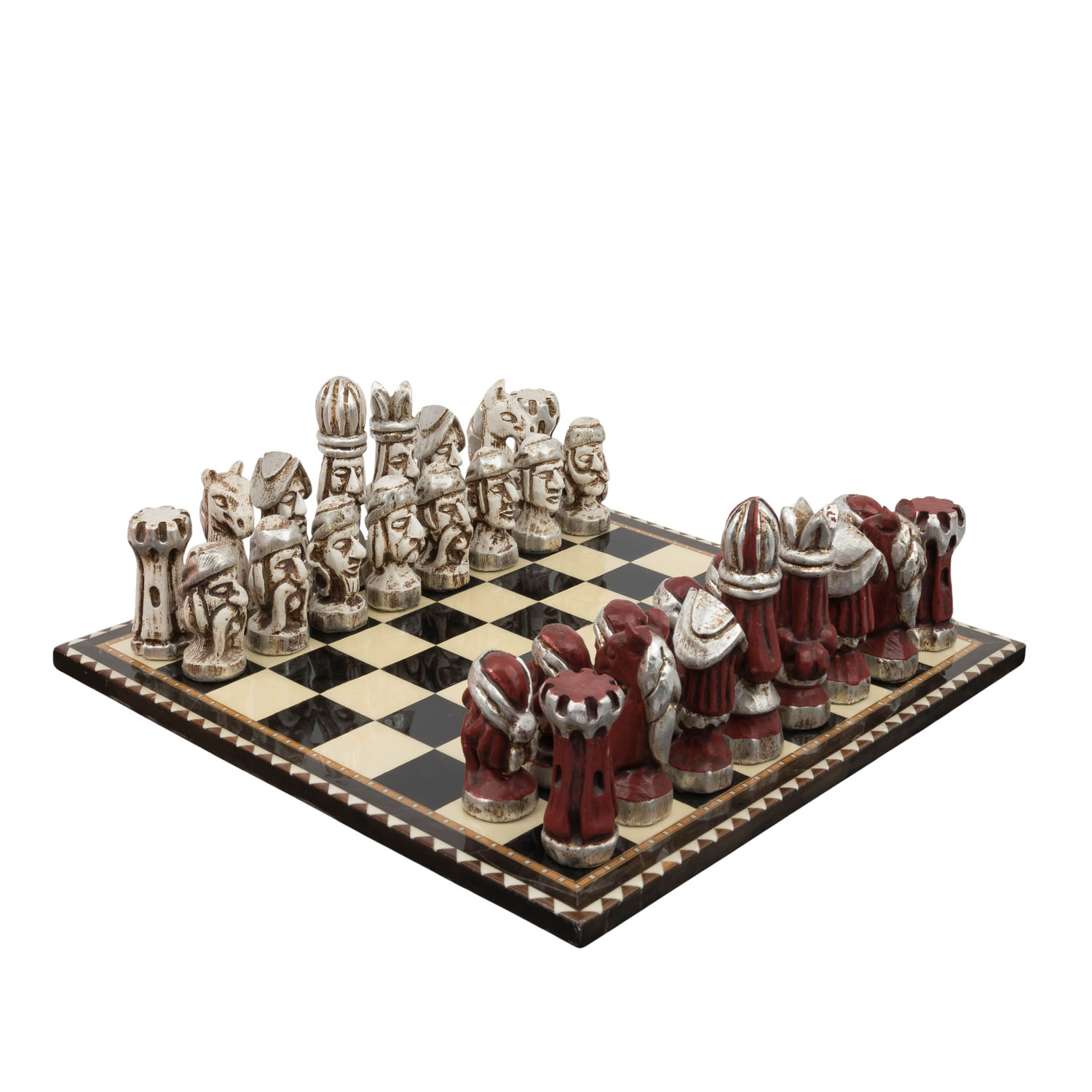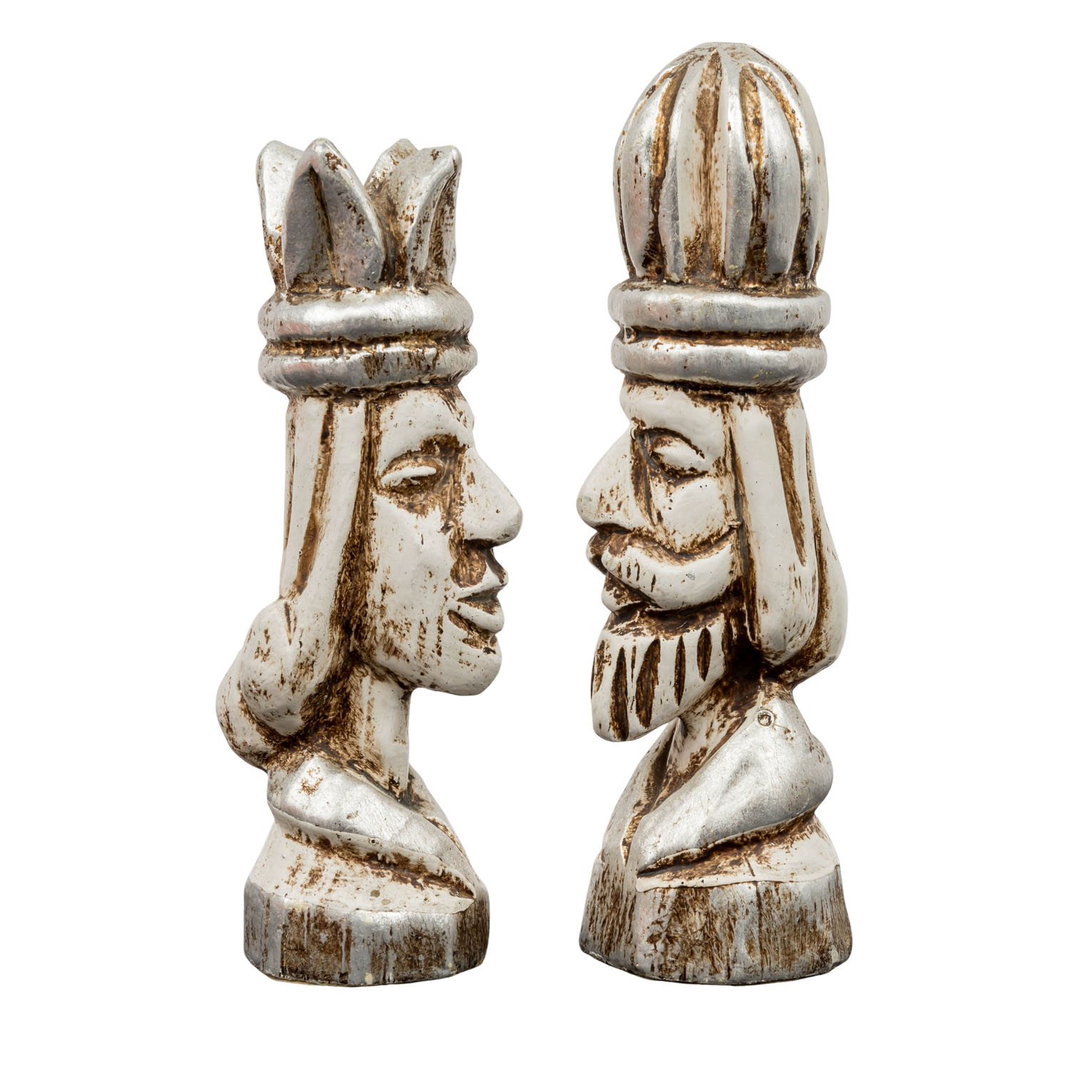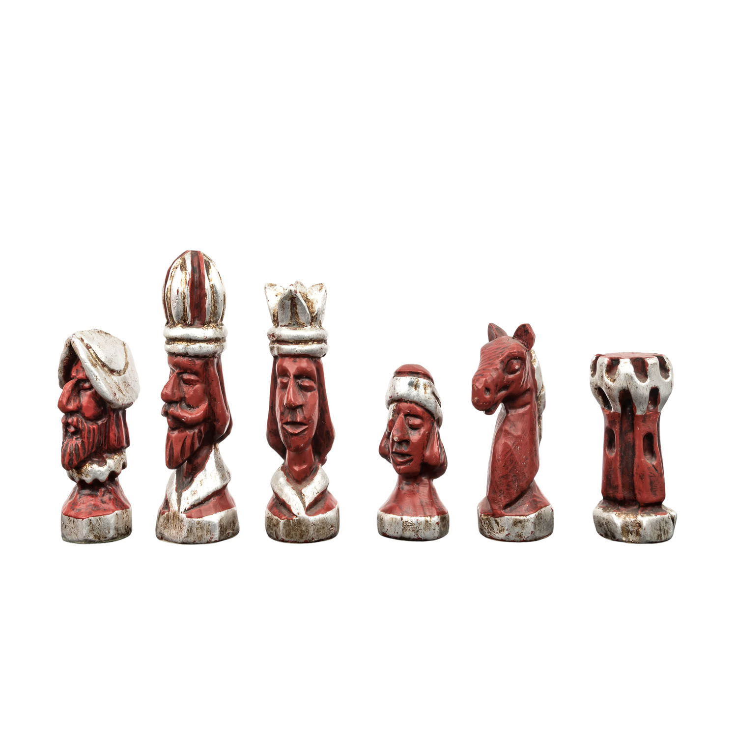 Oriental chess set, 20th century, wooden chessboard with 16 white and 16 red pieces, mostly busts, the pawns in pirate style, some with eye patch, some with headscarf, h king 17 cm, h pawn 10 cm, wooden chessboard with lacquer foil, dimensions 50 x 50, foil cracked, signs of age.