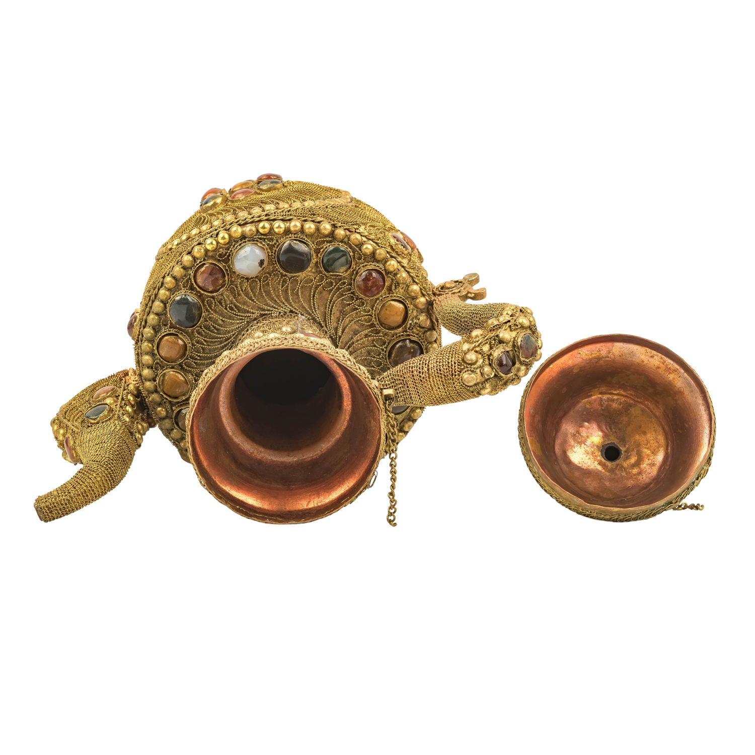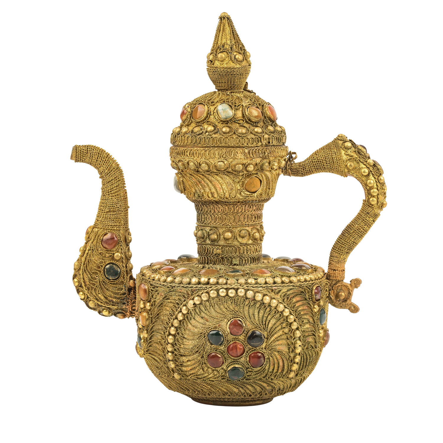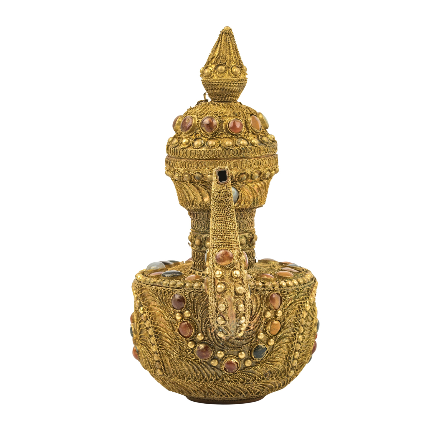 Oriental jug, 20th century. Made of copper, gold-colored exterior and decorated with applied cord ornamentation of metal wires and applied stone cabochons, h: 24 cm, dam.