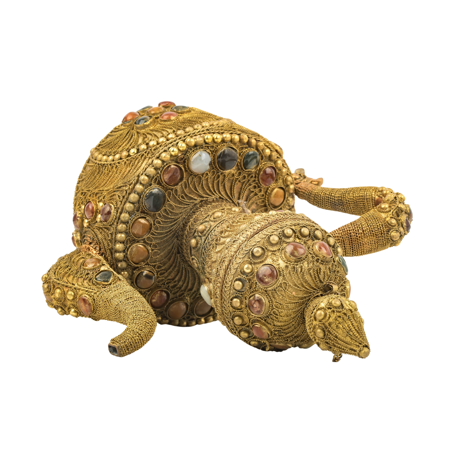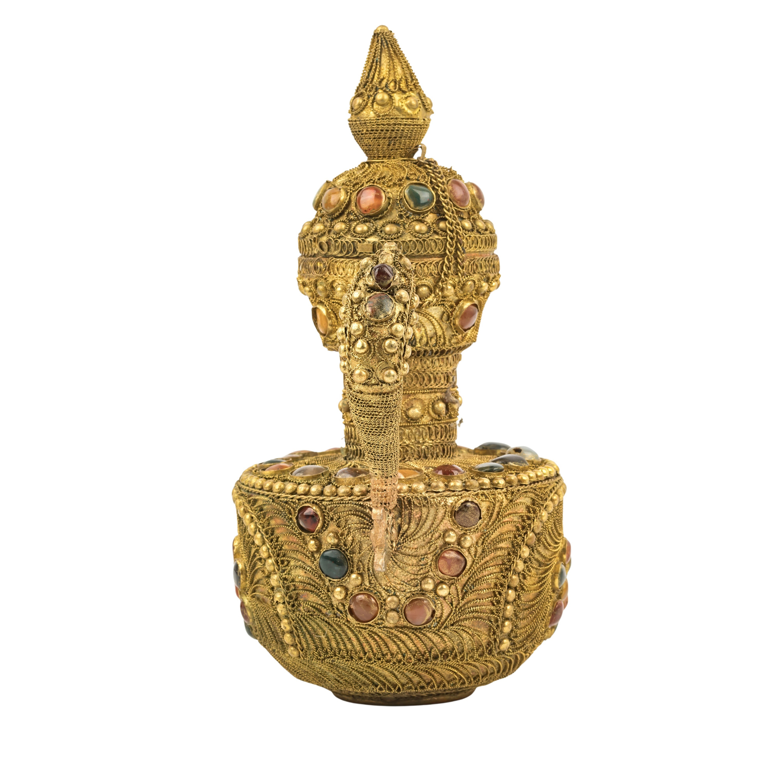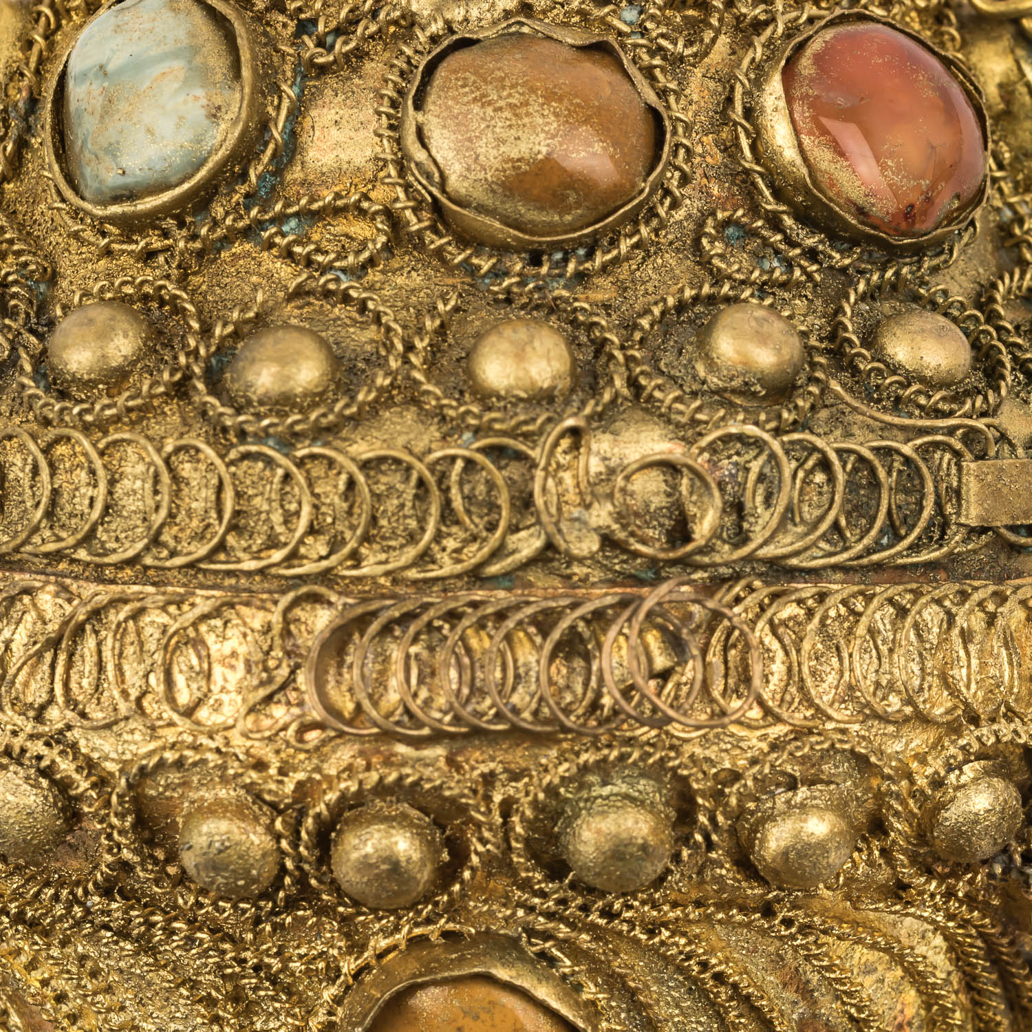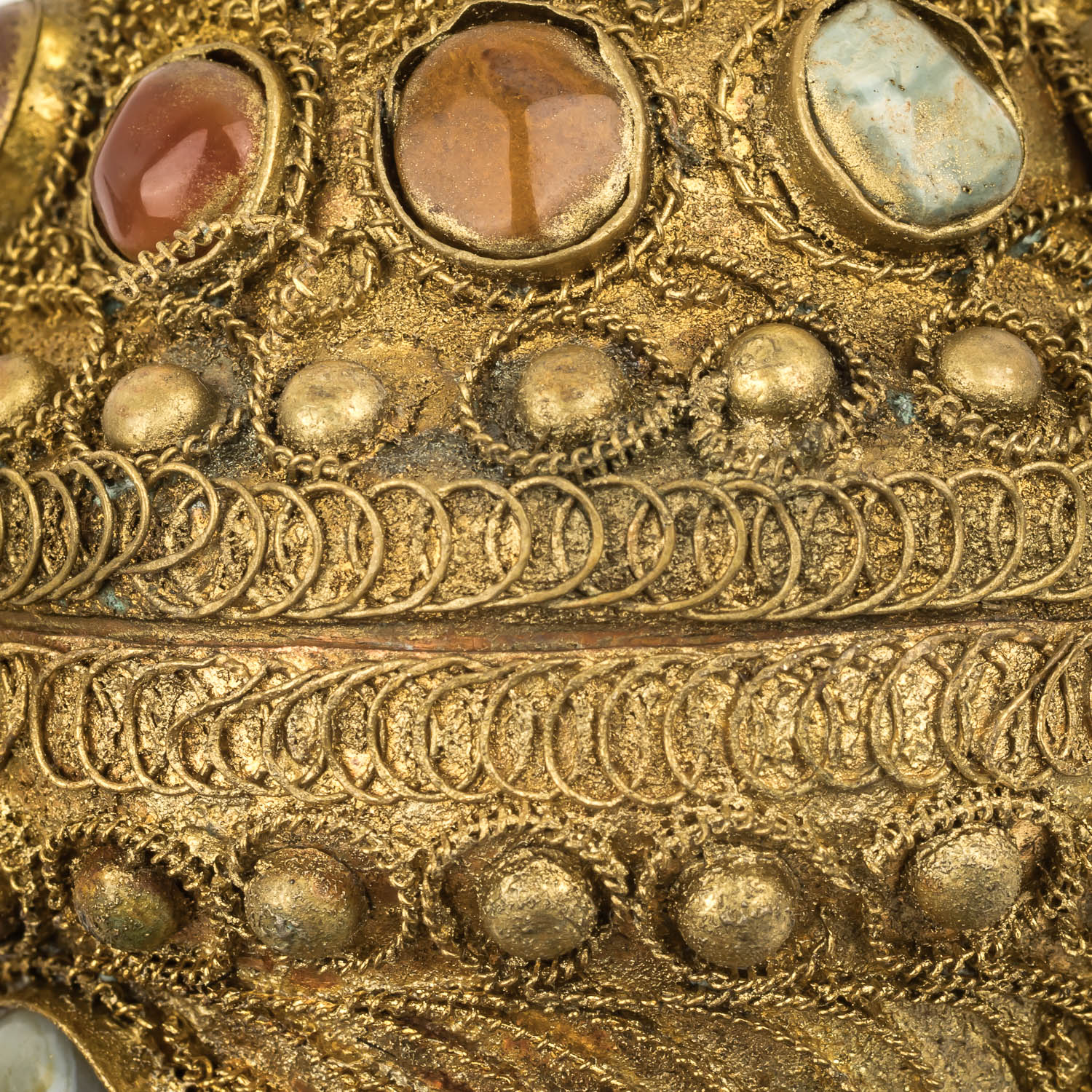 Oriental jug, 20th century. Made of copper, gold-colored exterior and decorated with applied cord ornamentation of metal wires and applied stone cabochons, h: 24 cm, dam.