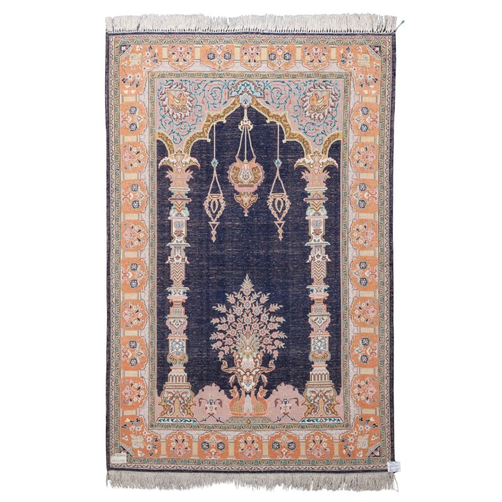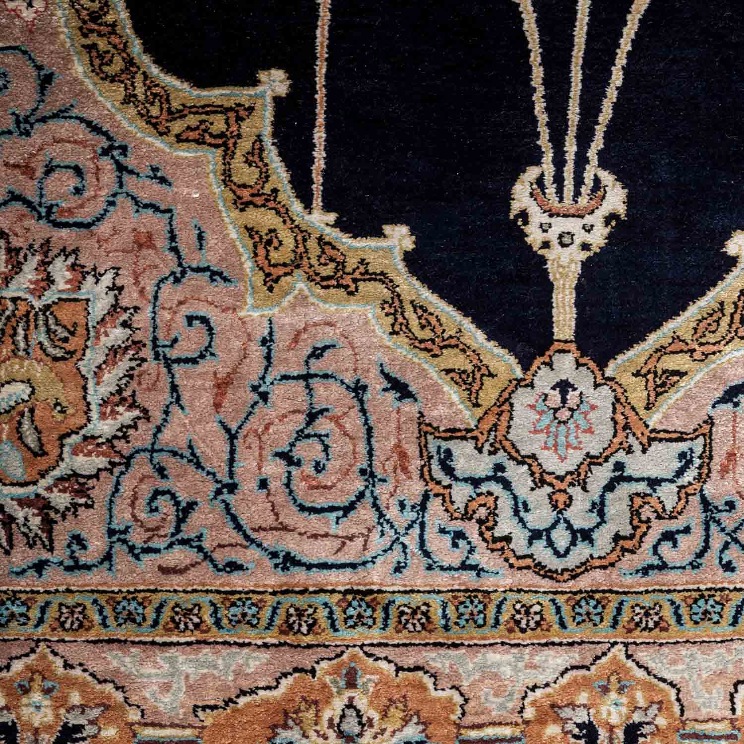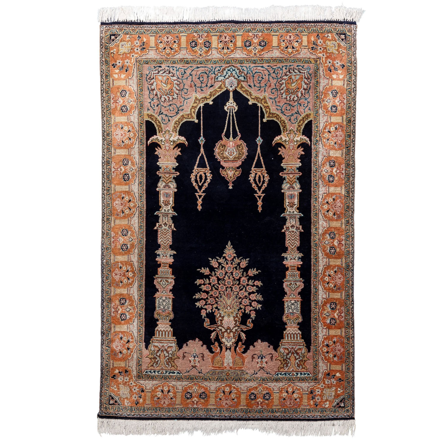 Oriental silk carpet. GHOM/IRAN, second half of the 20th century, 175x113 cm. Prayer rug with plain dark blue prayer field. Light brown main border. Silk on silk, approx. 4,500,000 knots per square meter. Purchased in Stuttgart in 1978. Few signs of age. NO SHIPPING TO THE USA