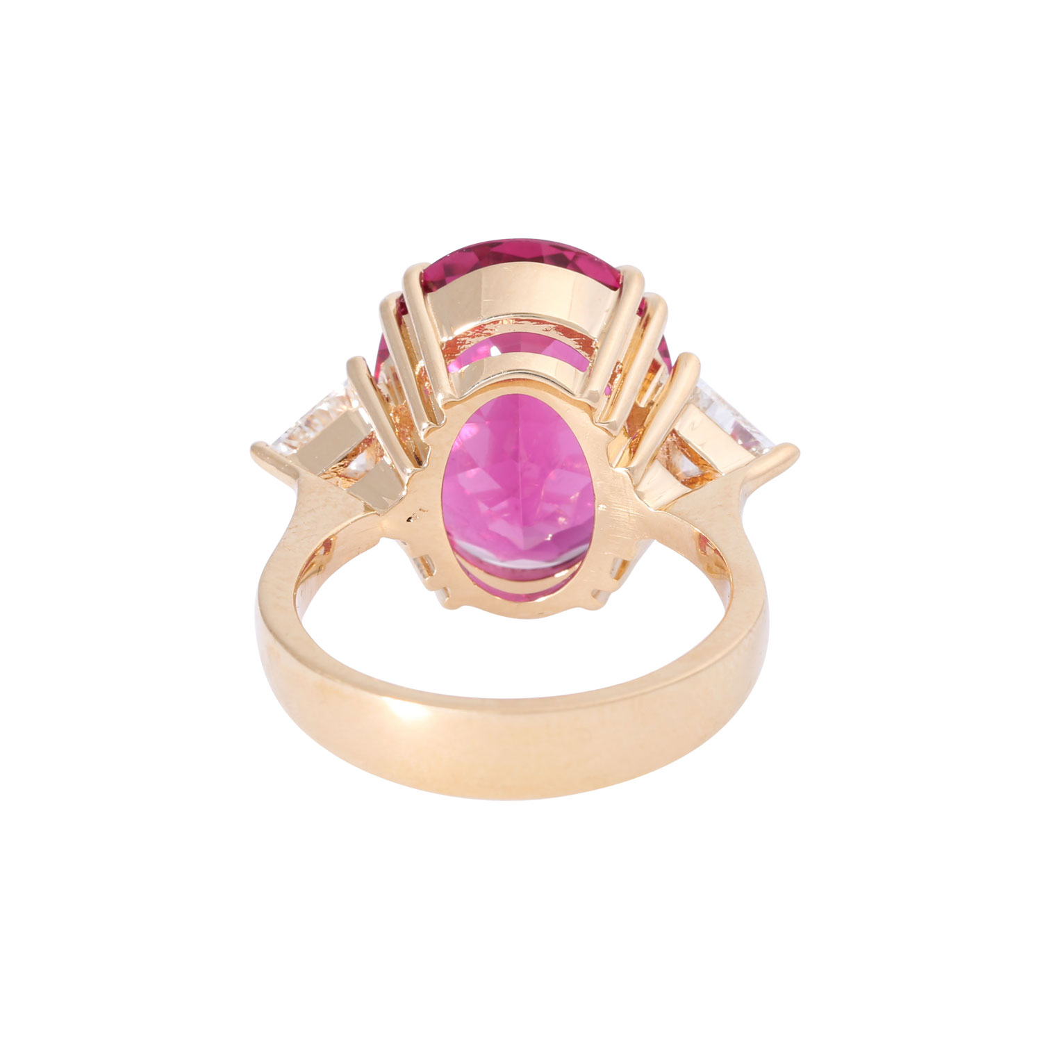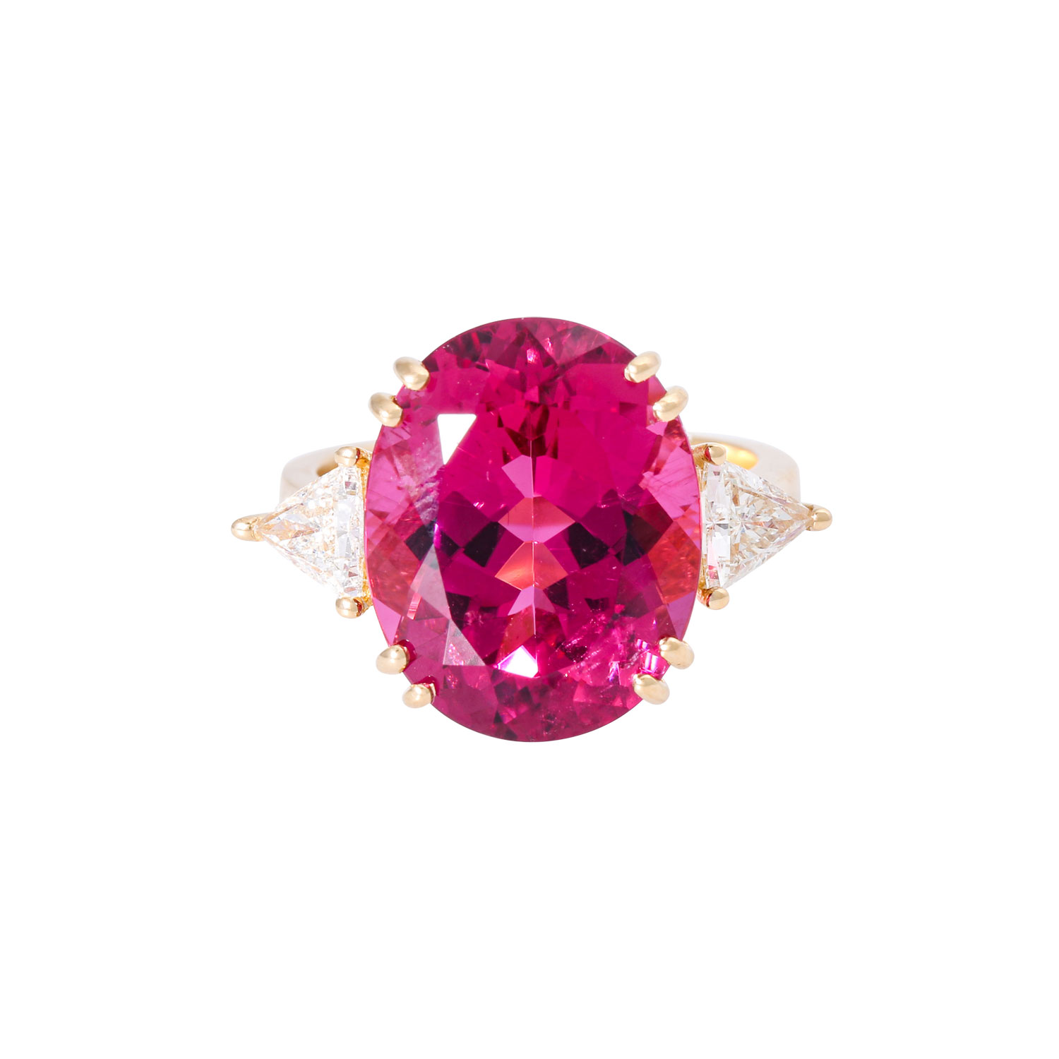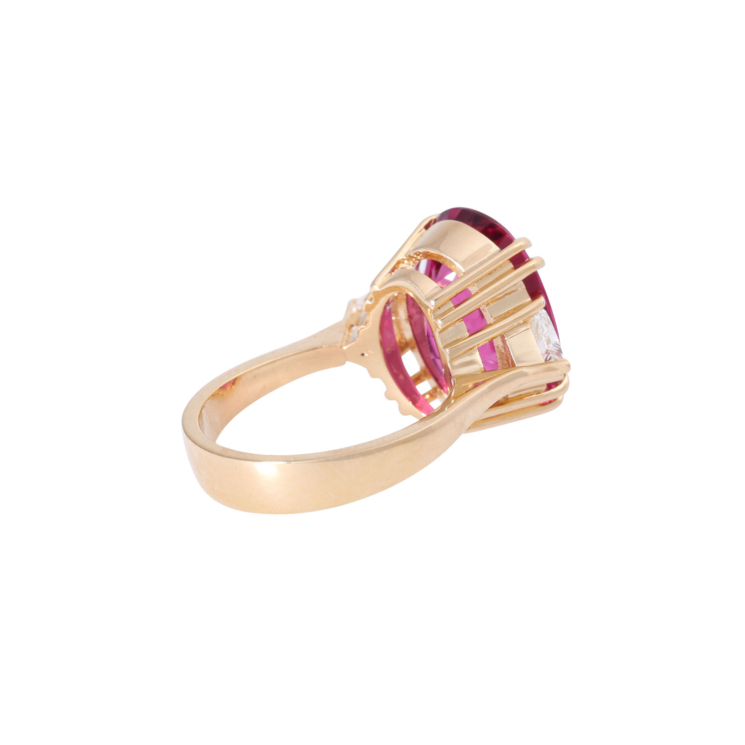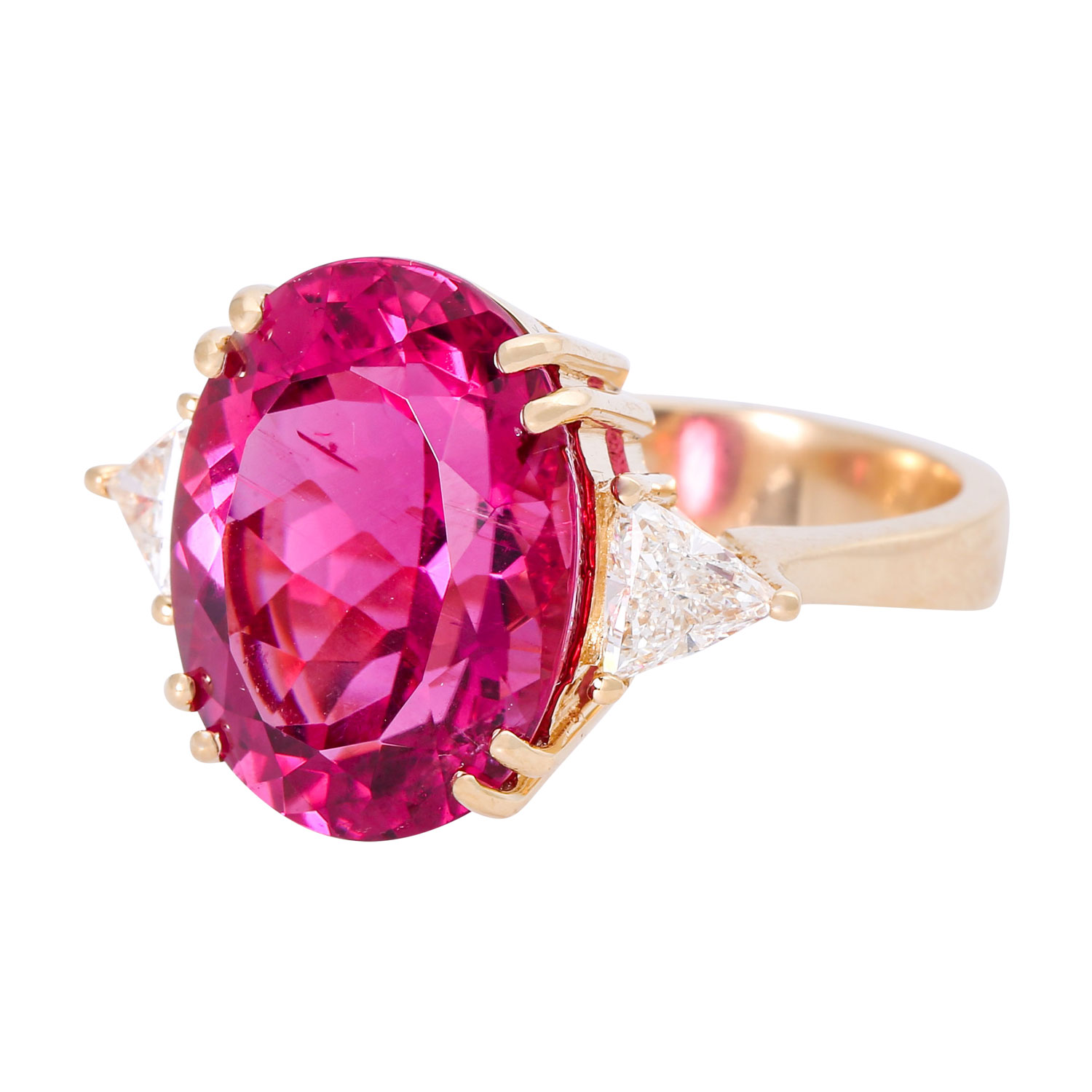 Exceptional ladies ring, set with a fine rubellite 12,20 cts. a. 2 diamond trillants 0,71 ct. G/VSI-SI1. YG 18 K. Size 55. High jewelry craftsmenship.