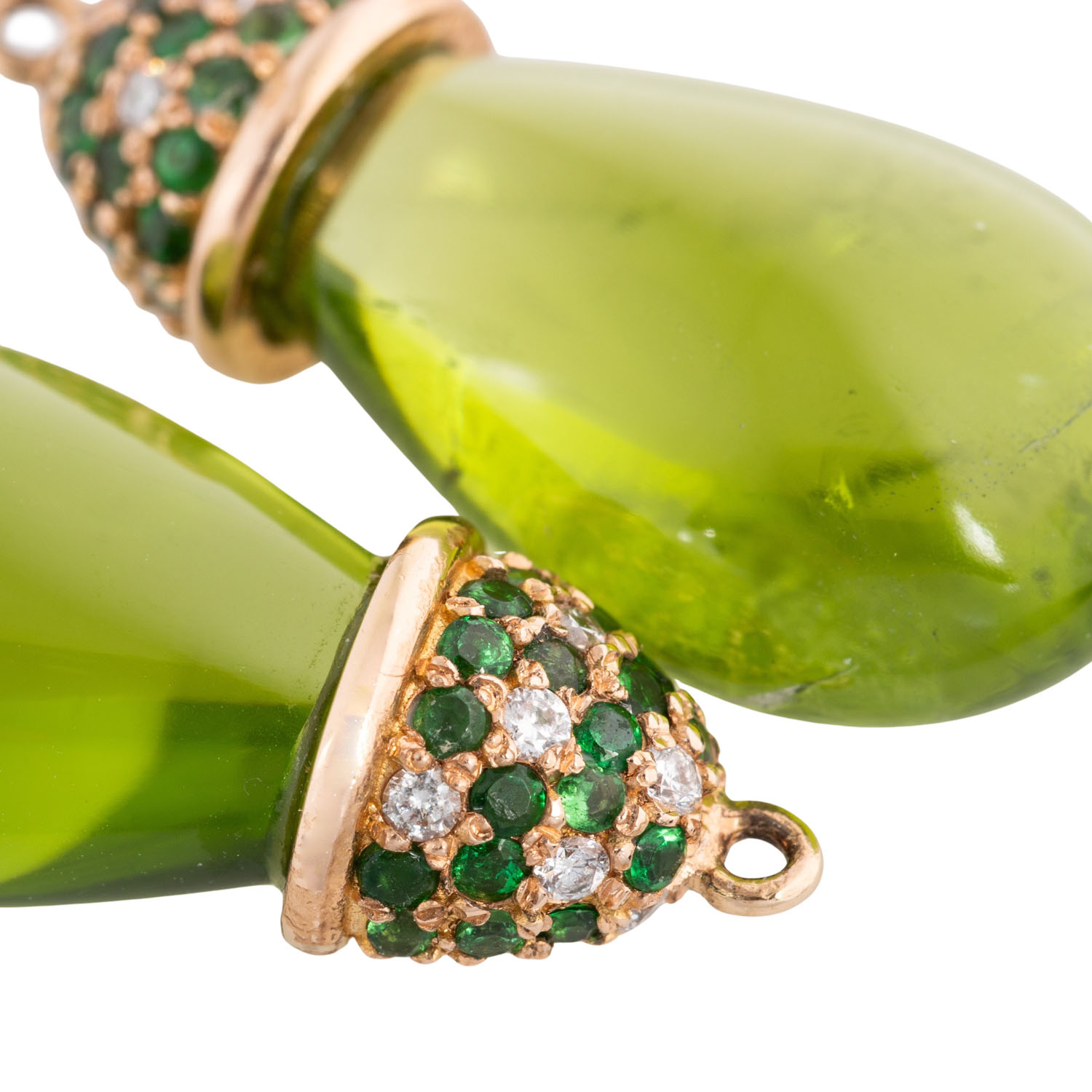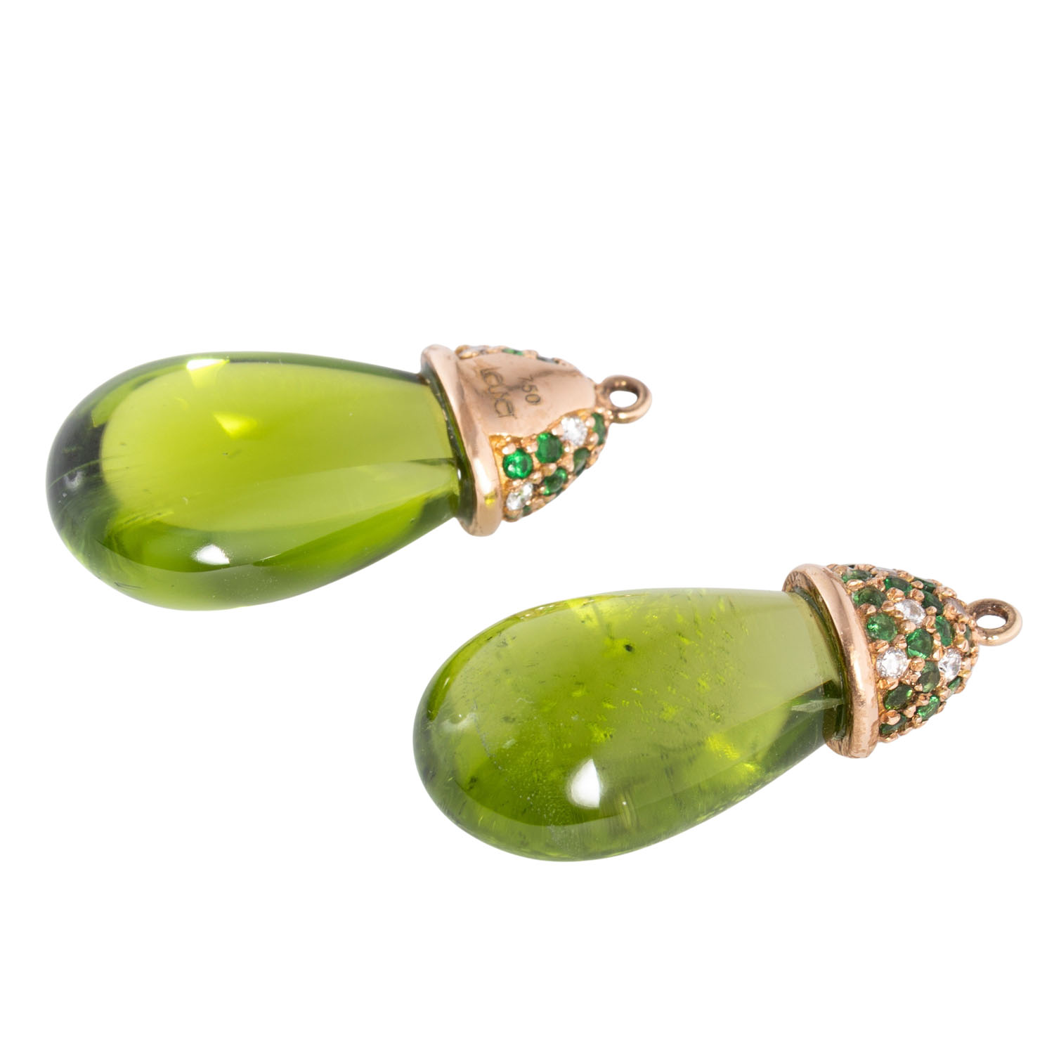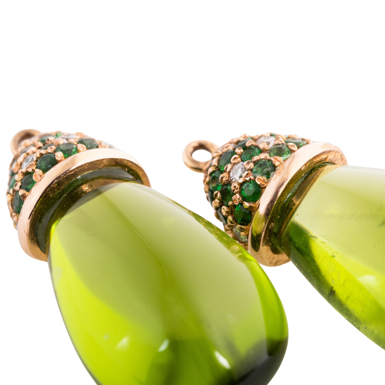 Pair of pendants for ear studs with 2 peridot briolettes 23 x 12 x 8 mm totalling 39.75 ct and setting RG 18K, set with 52 tsavorites totalling 0.52 ct, 18 brilliant-cut diamonds totalling 0.18 ct EW (D)/VS, 21st century, with signs of wear.