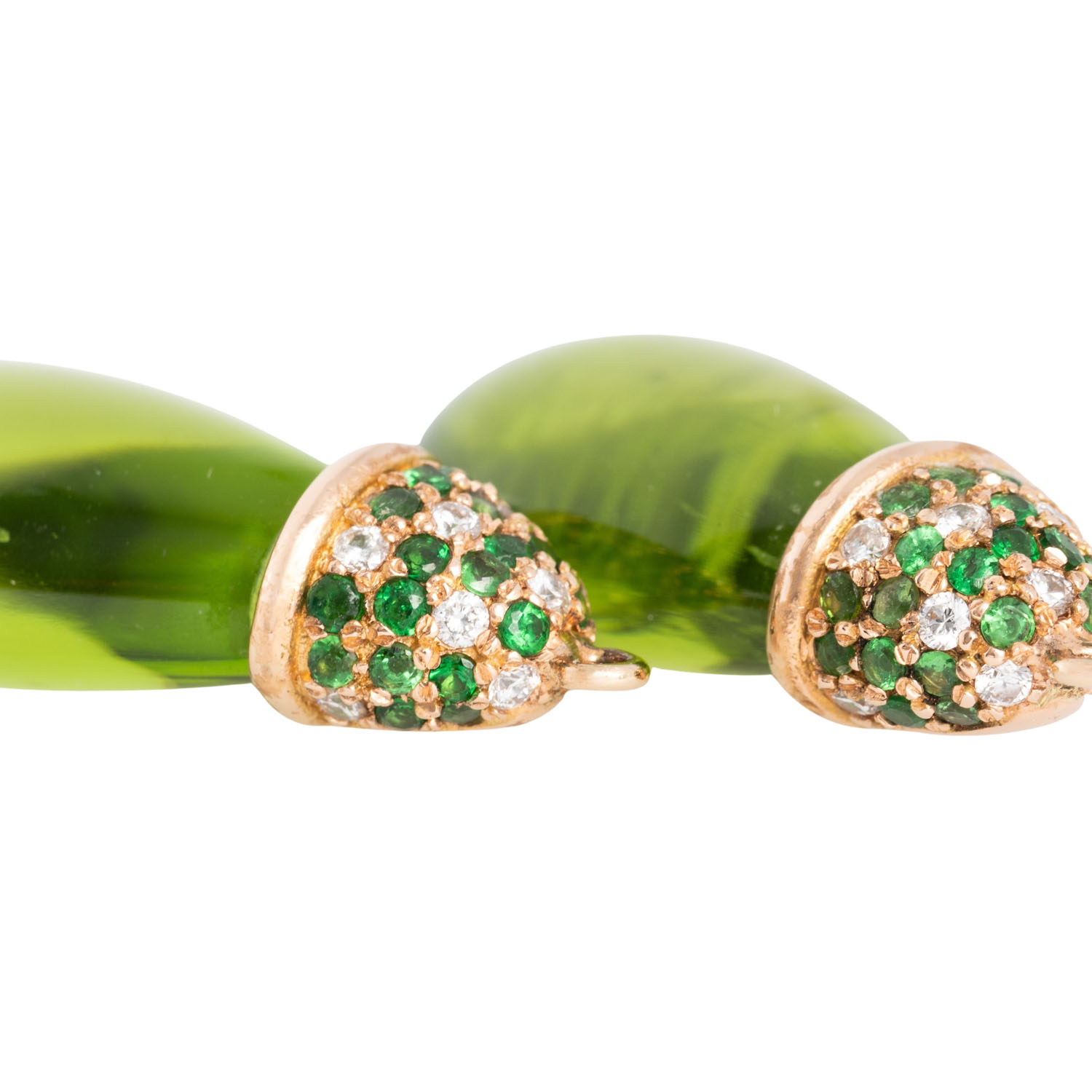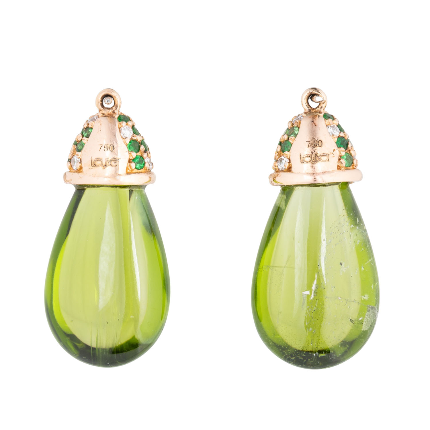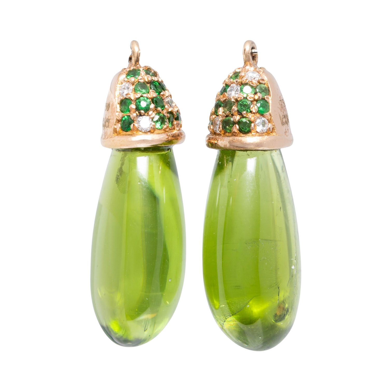 Pair of pendants for ear studs with 2 peridot briolettes 23 x 12 x 8 mm totalling 39.75 ct and setting RG 18K, set with 52 tsavorites totalling 0.52 ct, 18 brilliant-cut diamonds totalling 0.18 ct EW (D)/VS, 21st century, with signs of wear.