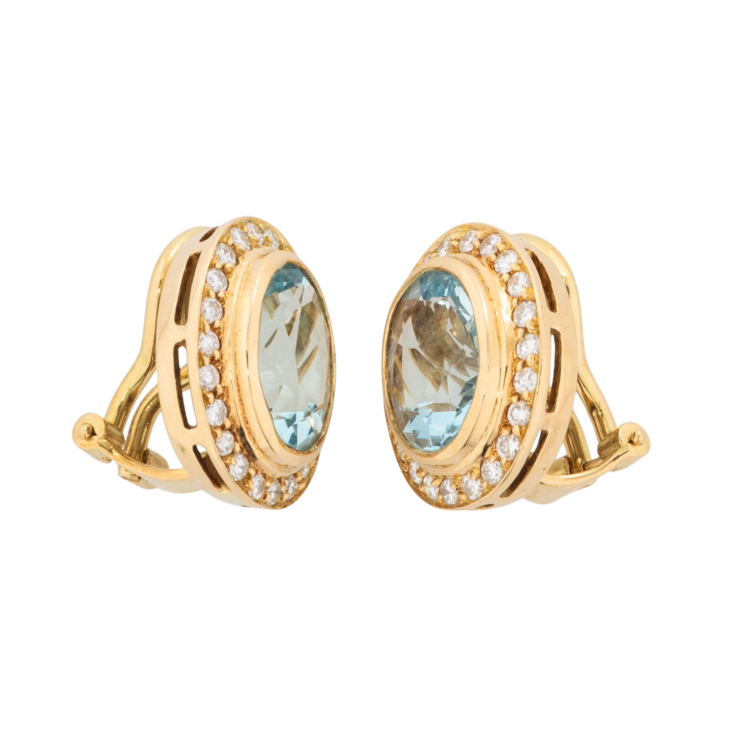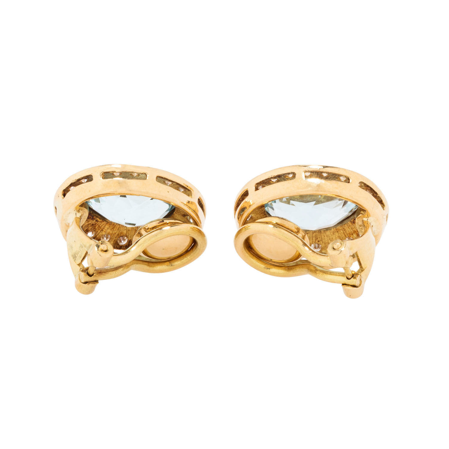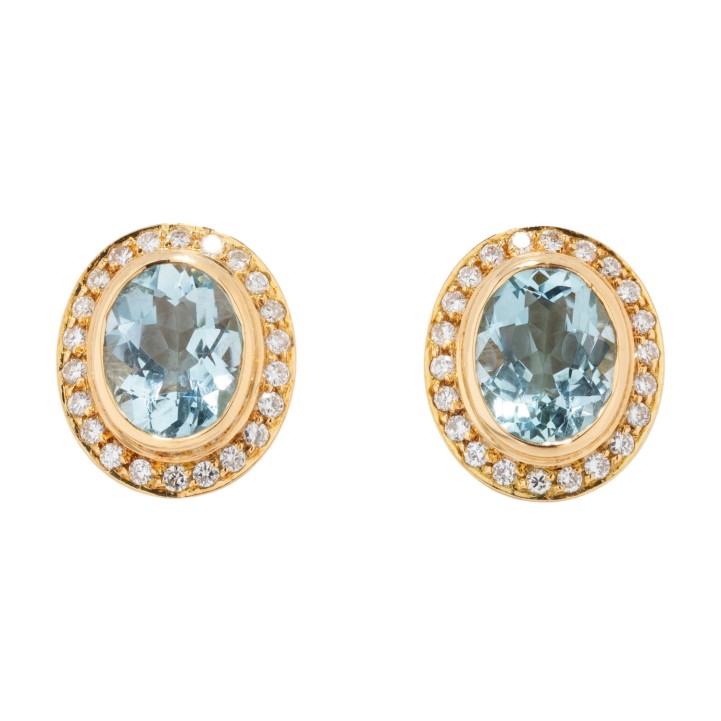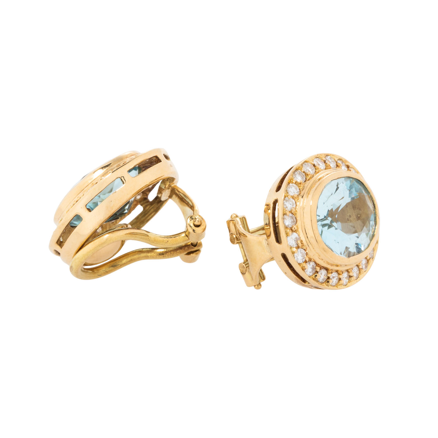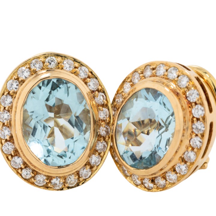 Pair of ear clips with 2 aquamarines each surrounded by 22 brilliant-cut diamonds, totalling approx. 0.44 ct, WHITE (H)/SI, faceted oval-cut aquamarines, approx. 10 x 8 mm, 18K yellow gold, 7.2 g, L x W: approx. 15.5 x 13.1 mm, end of the 20th century, minimal signs of wear.