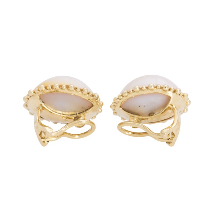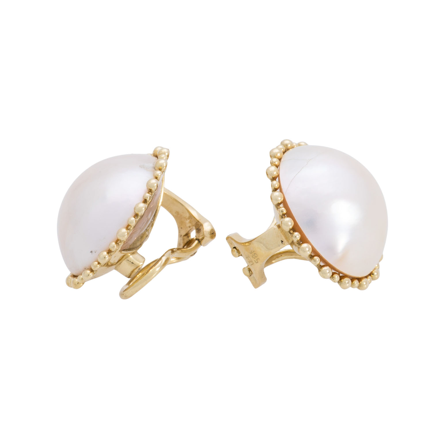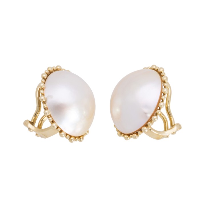 Pair of ear clips with 2 Mabé pearls, white, beautiful luster, 1 pearl with crack, 14K yellow gold, 10.9 g, D: approx. 19.3 mm, 2nd half of the 20th century, signs of wear, with hallmark 'HK'.