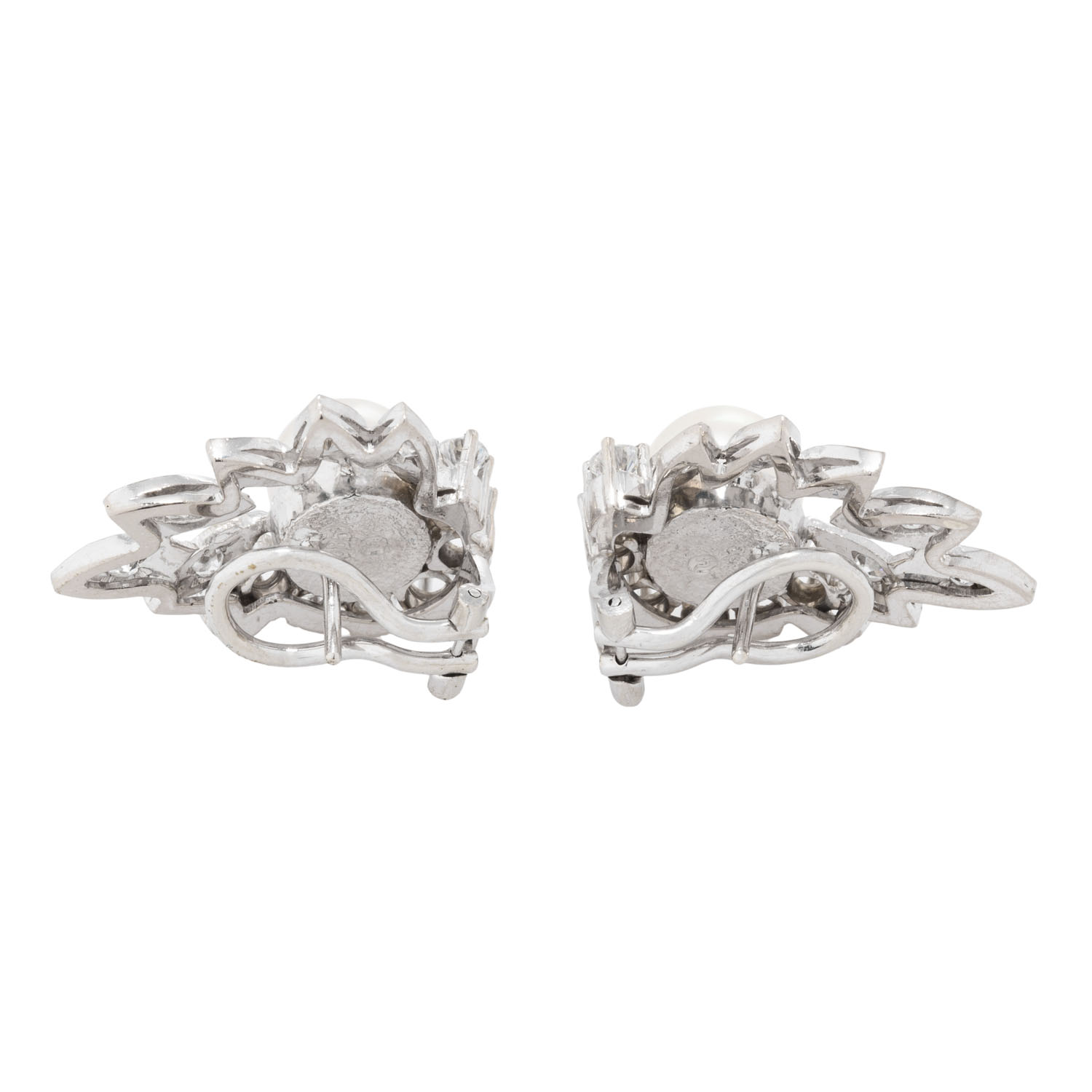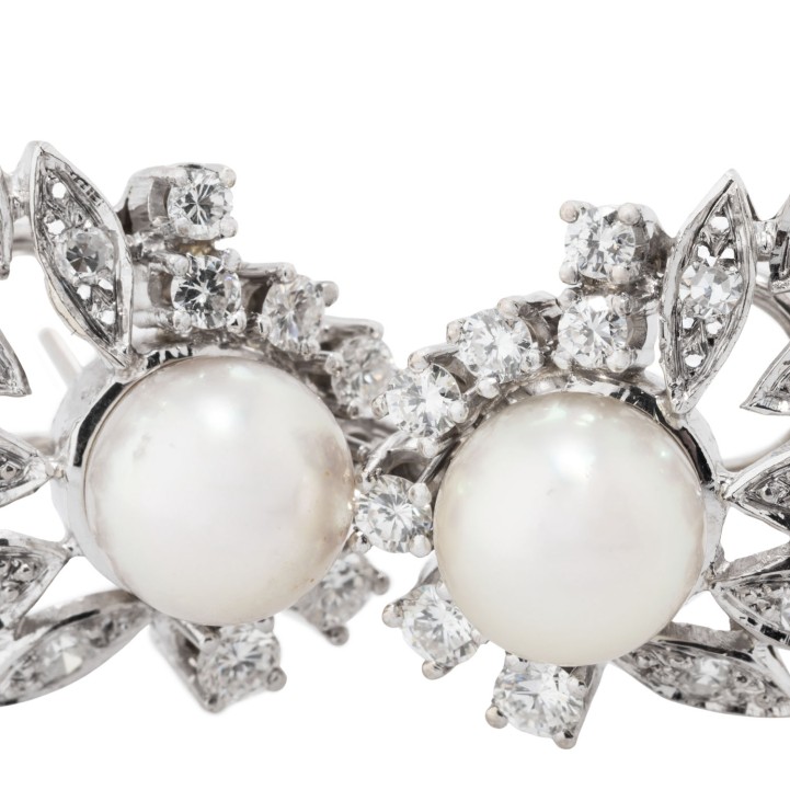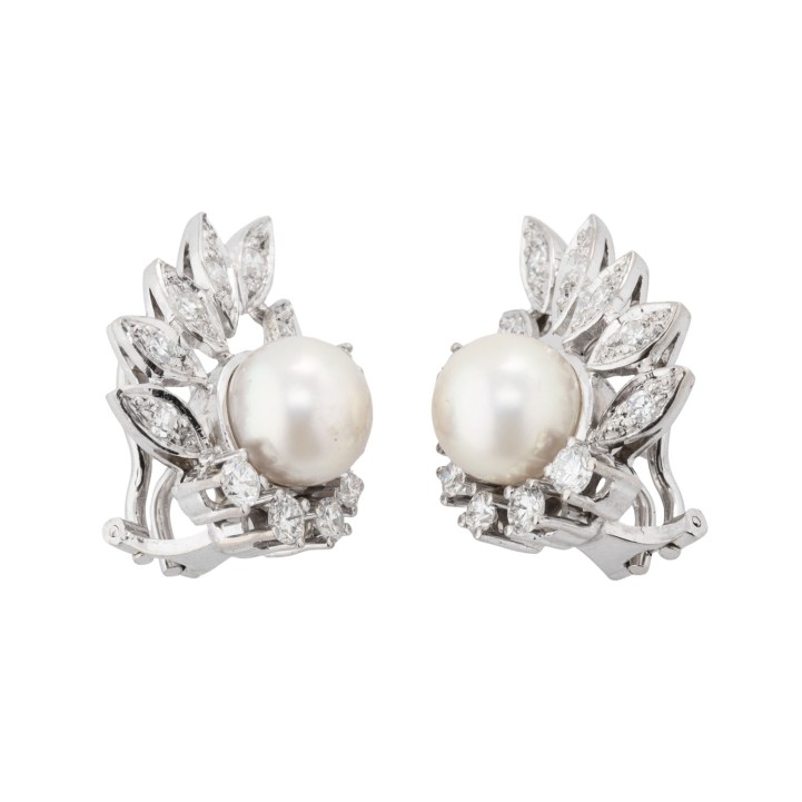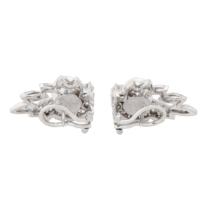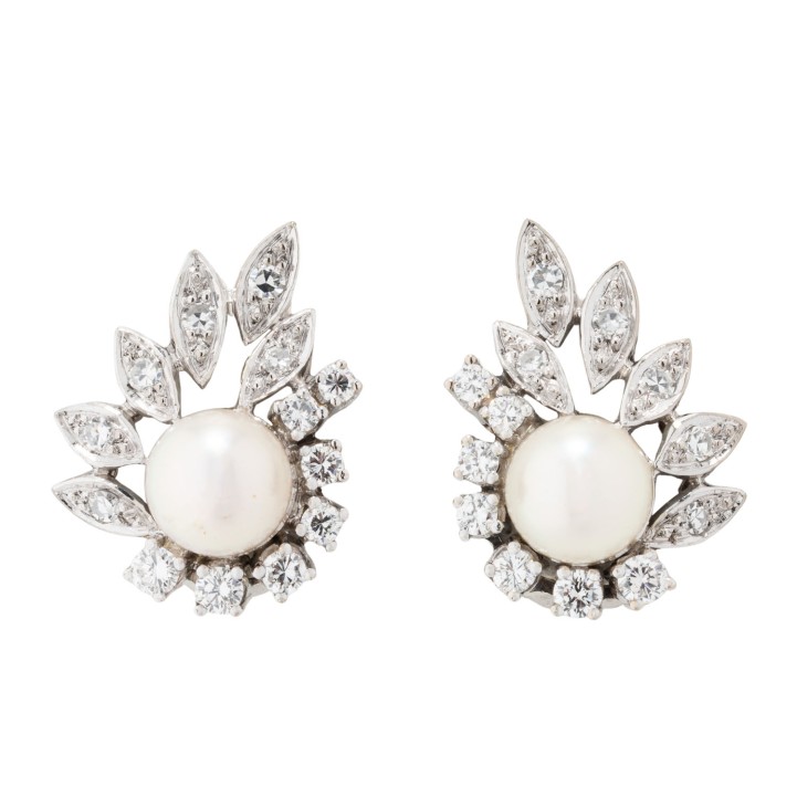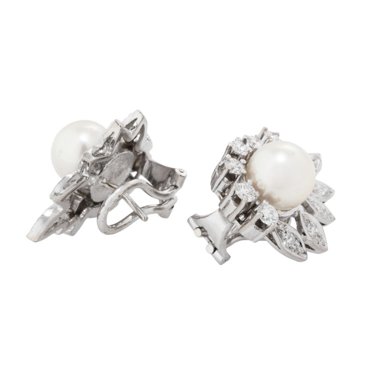 Pair of ear clip studs with 2 Akoya pearls, 14 brilliant-cut diamonds and 12 single-cut diamonds, totalling approx. 0.96 ct, RW-WHITE (G-H)/VS, Akoya cultured pearls: white-rose, D: approx. 8.2 mm, very fine luster, with natural naturale signs of growth, 14K white gold, 10.6 g, L: approx. 23 mm, W: approx. 17.5 mm, end of 20th century, minimal signs of wear, with hallmark.