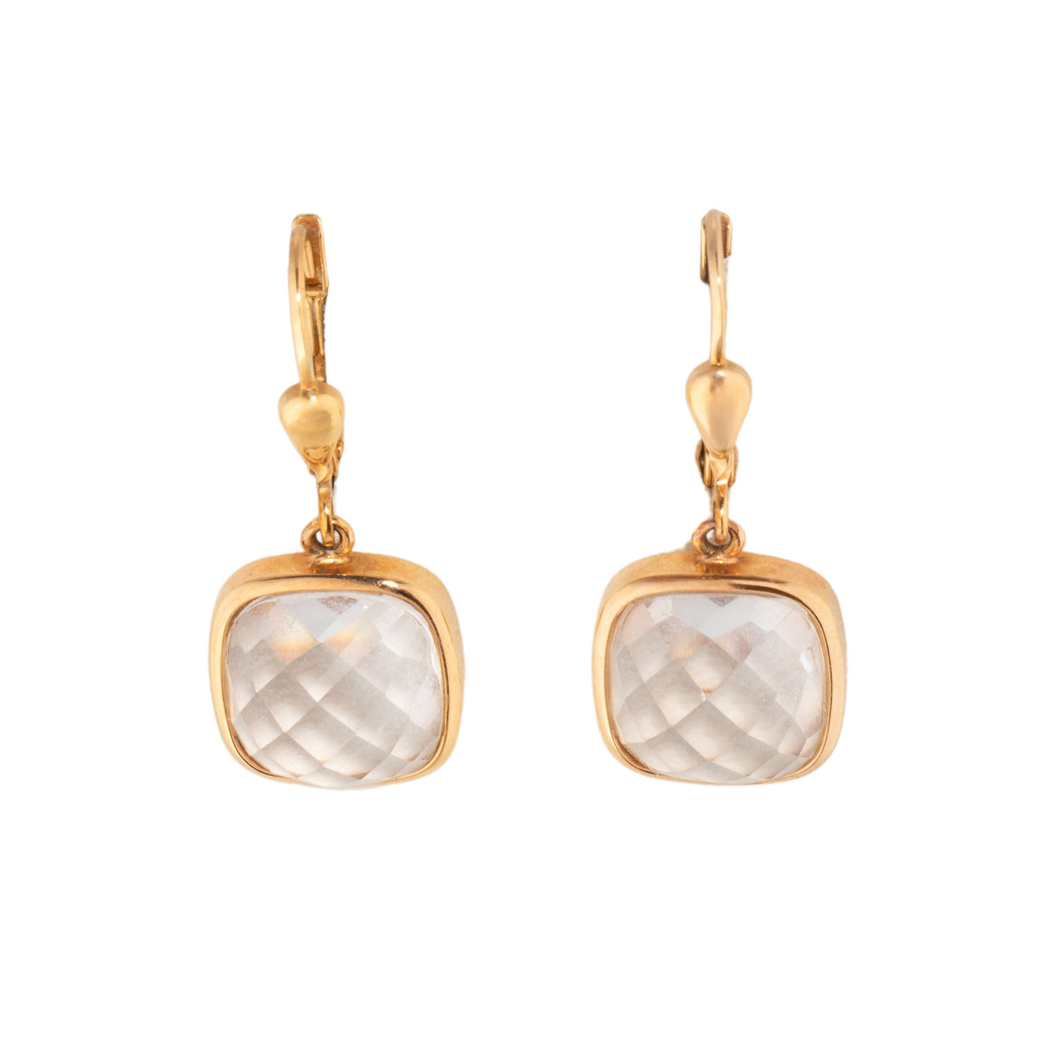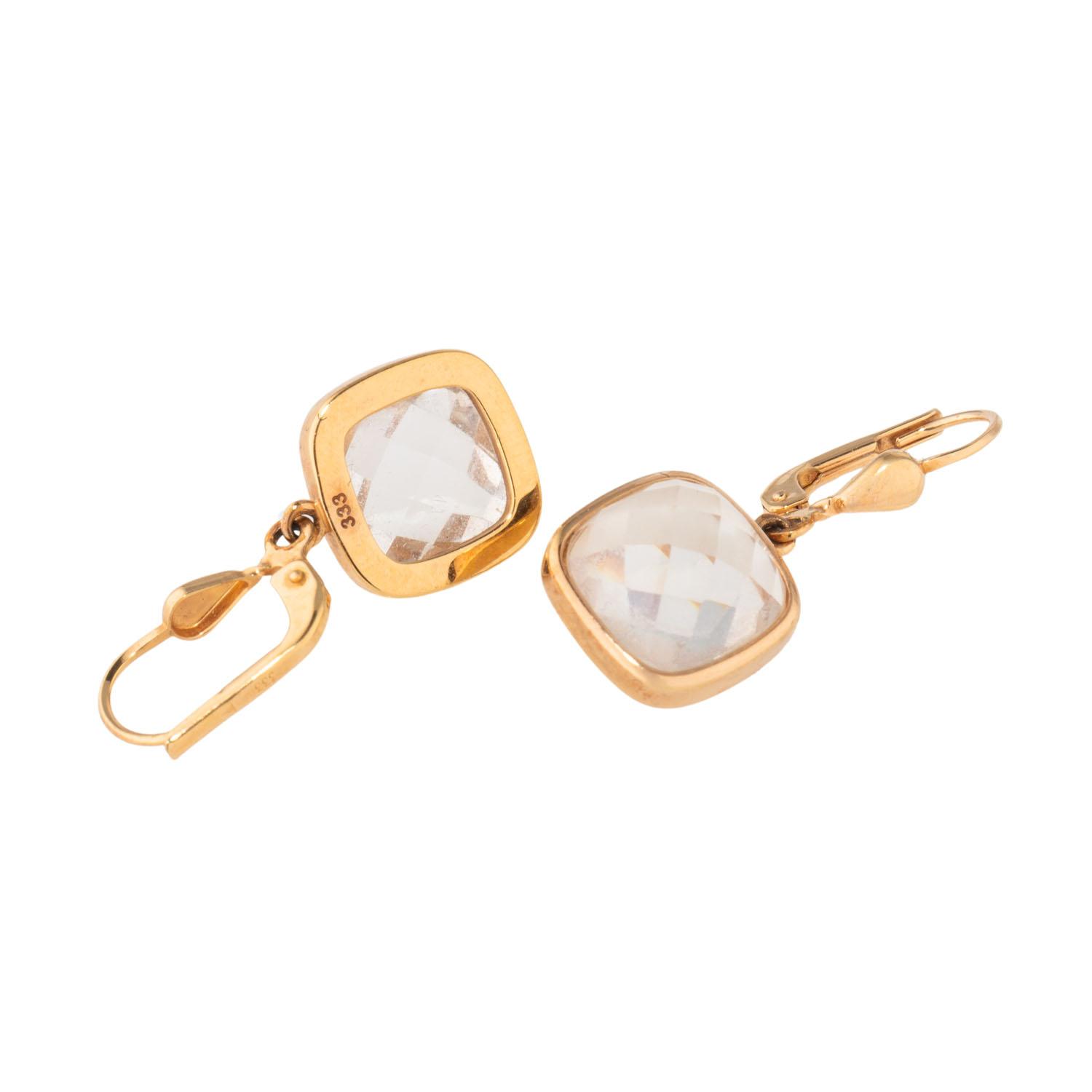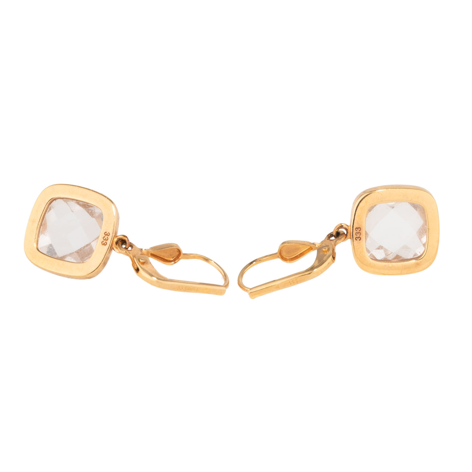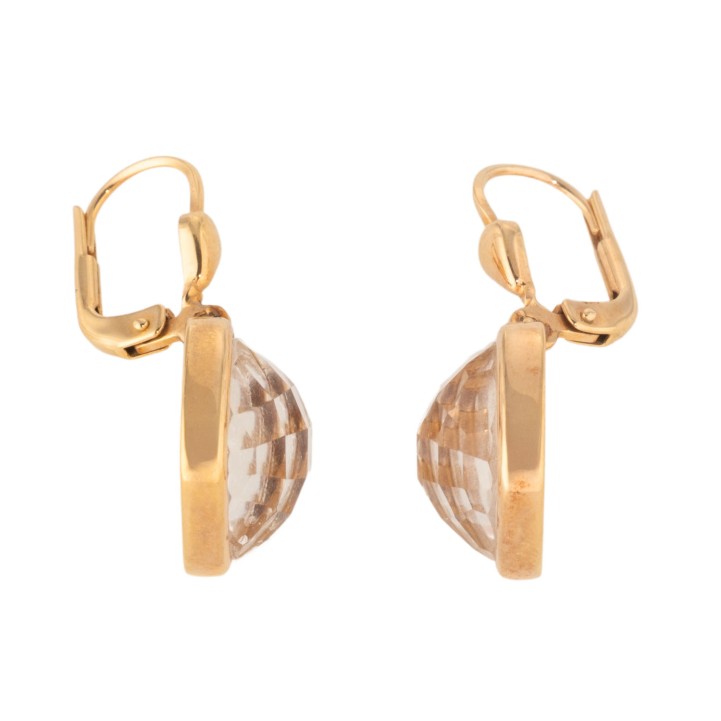 Pair of earrings with rock crystal, faceted fantasy-cut, approx. 9.7 x 9.7 mm, 8K yellow gold, 4.5 g, L: approx. 27 mm, W: approx. 0.7 - 11.7 mm, 21st century, minimal signs of wear.