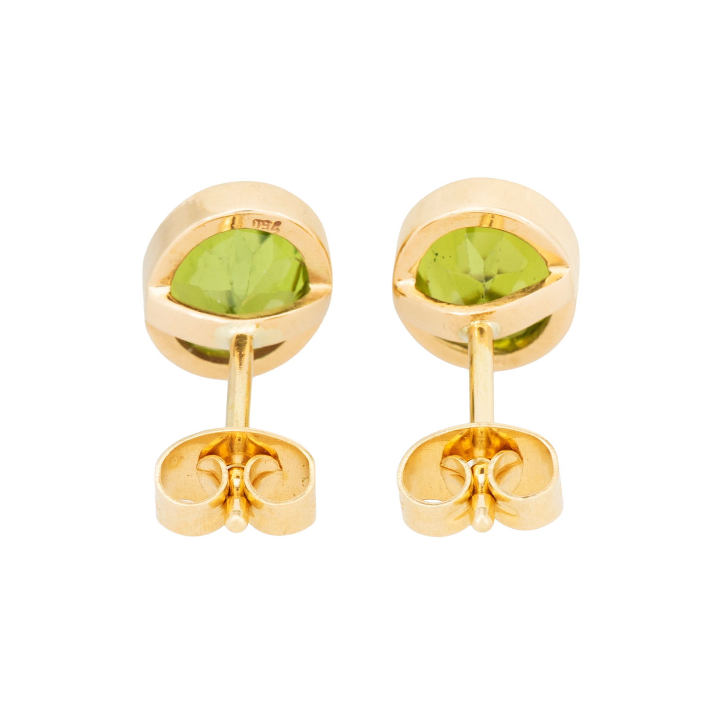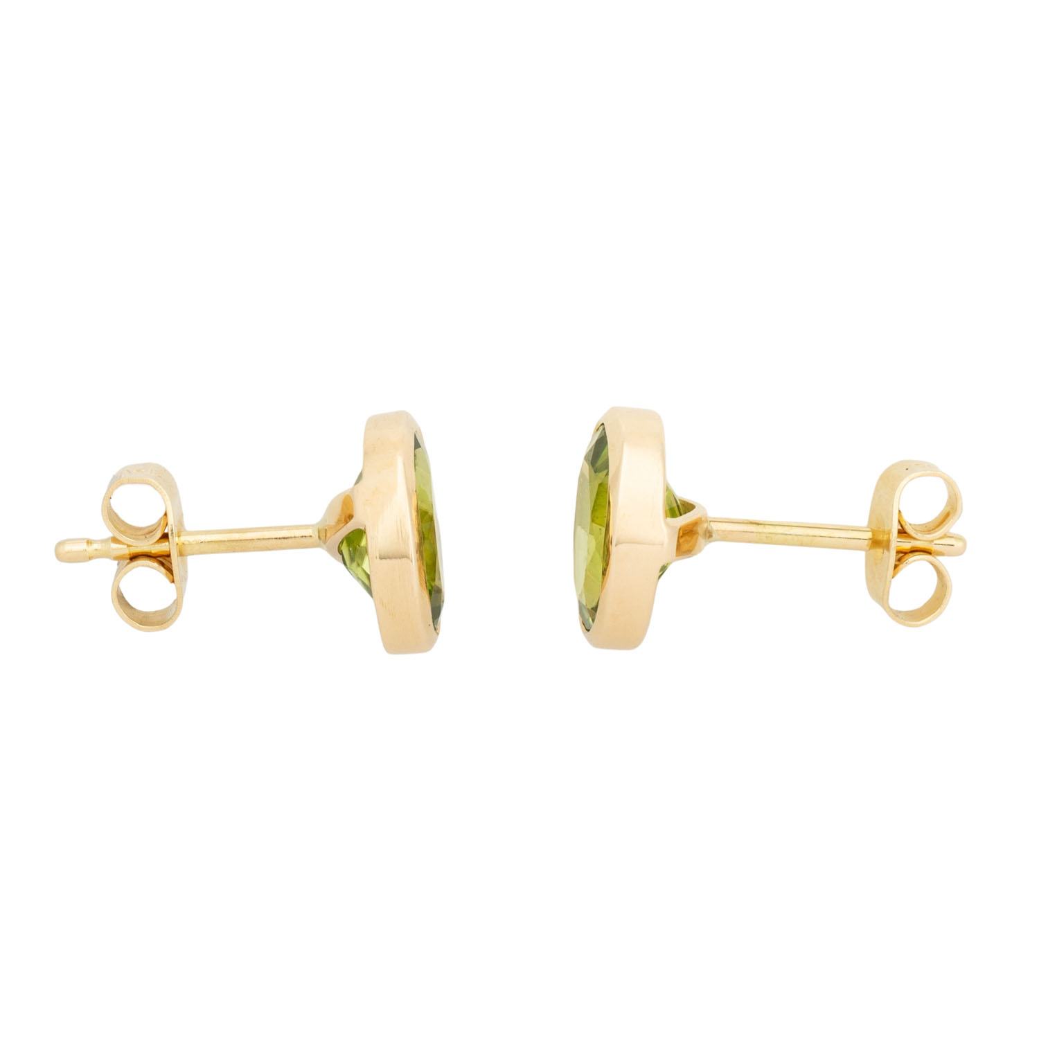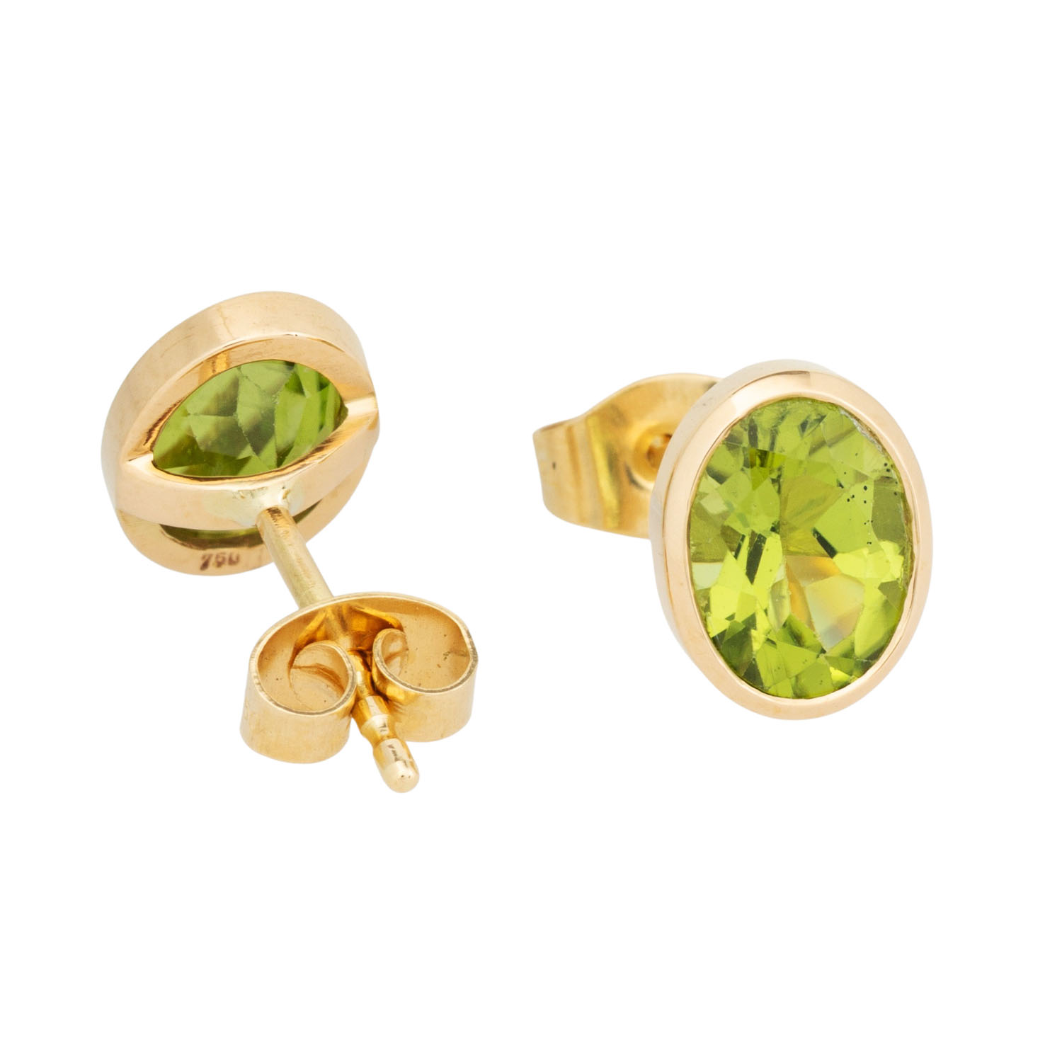 Pair of stud earrings with 2 peridots, total 2,71 ct, YG 18K, 2.5 g, 9.4 x 7.4 mm, 21st century, mint condition.