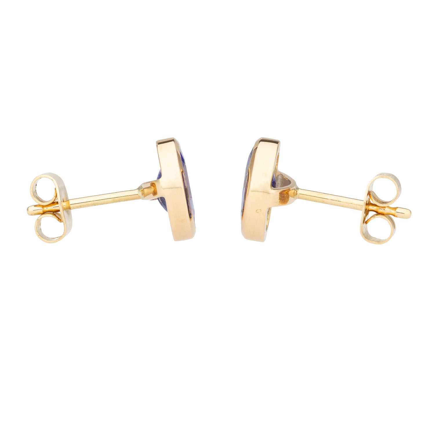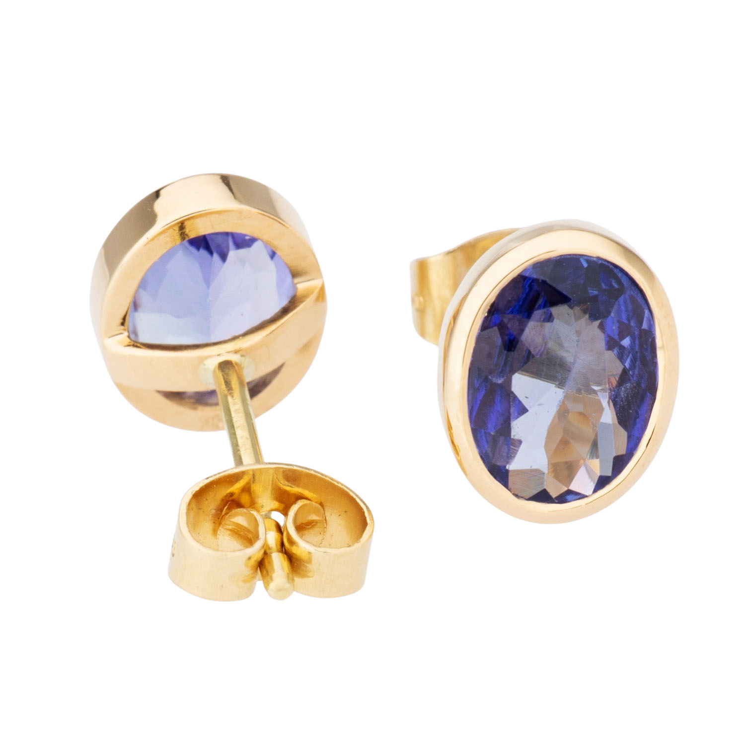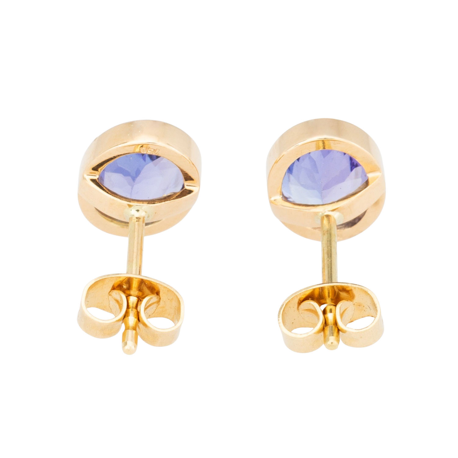 Pair of stud earrings with tanzanite, totalling ca. 2.27 ct, 18K YG, 2.5g, 9.4 x7.4 mm, 21st century, mint condition.