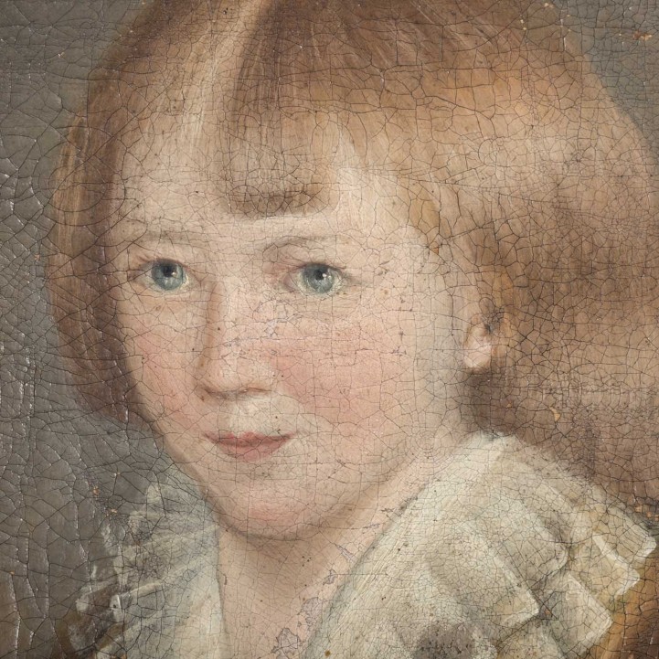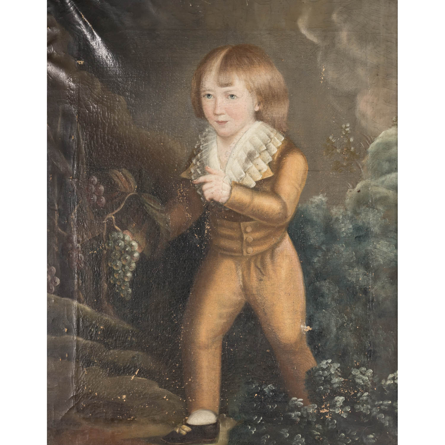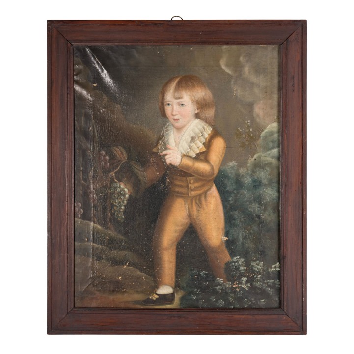 PAINTER/IN 18th century, ‘Johann Friedrich Doertenbach (Calw 1790-1870 Stuttgart)’, merchant and head of the company Zahn & Cie in Stuttgart, portrait as a boy with grapes in front of an idealised landscape background, oil/canvas, HxW: approx. 76x60 cm (88x74 cm with frame). Part. damaged and in need of restoration. With frame (signs of age and wear).