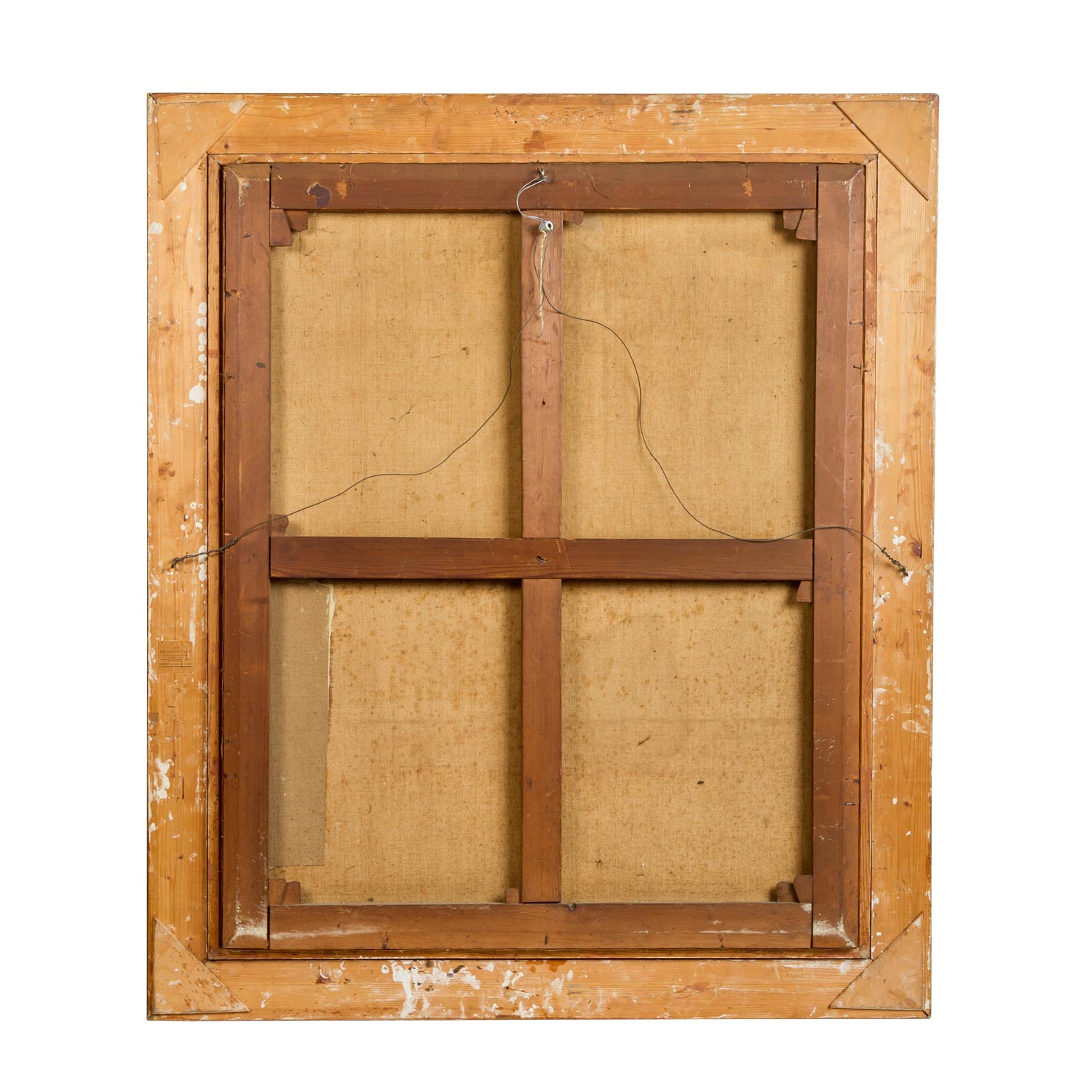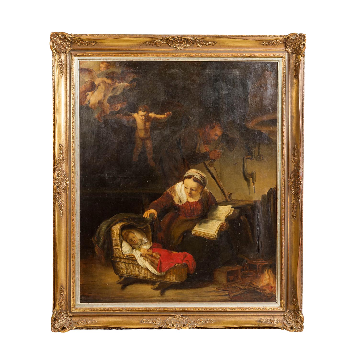 PAINTER 19th century, copy after the Flemish old master, 'Holy Family', scene in the room, Mary and the child in the cradle and Joseph at work, angels floating above, unsigned, oil / canvas, HxW: approx. 110x90cm (132x112 cm with frame). Restored with double patches on the reverse and partly markedly retouched, craquelure, abrasion and tear with flaked paint. With frame (signs of age).