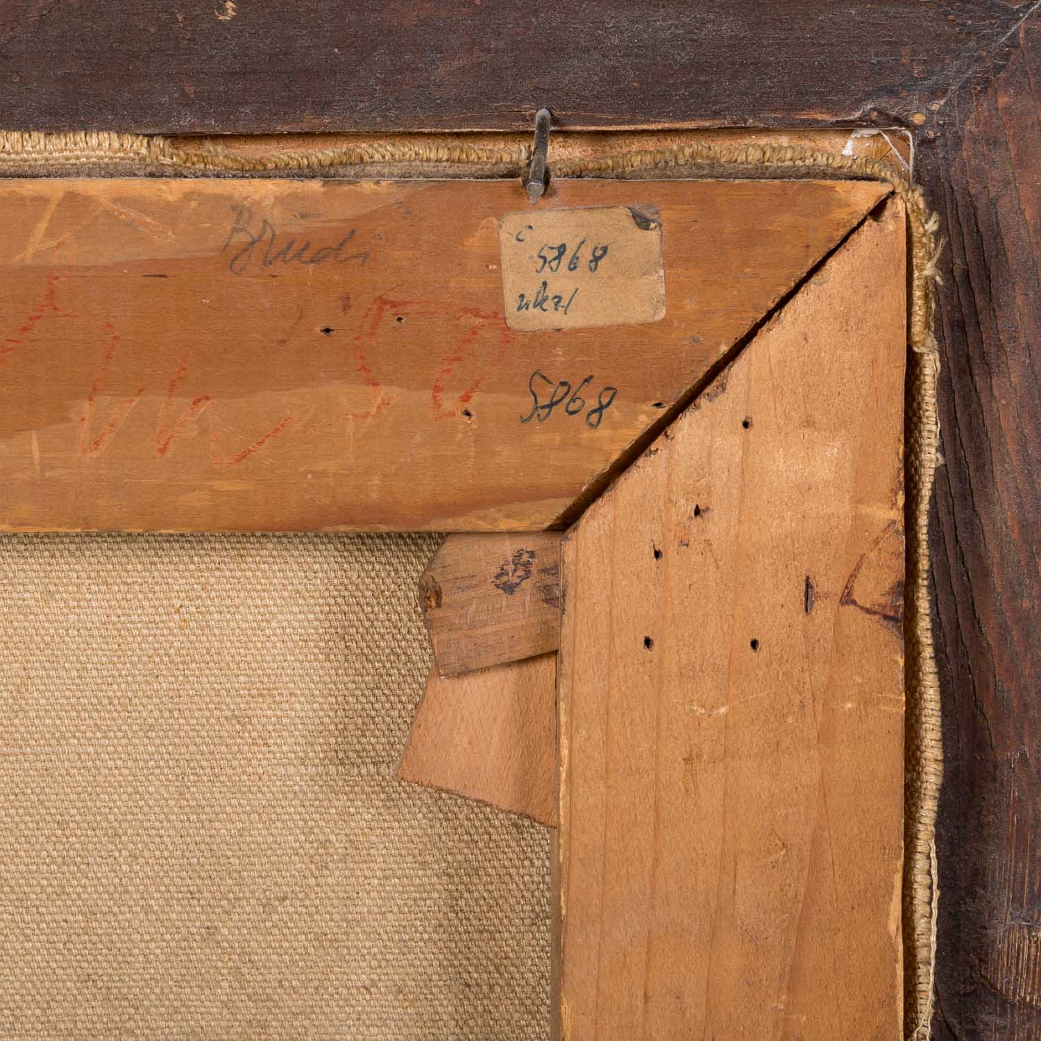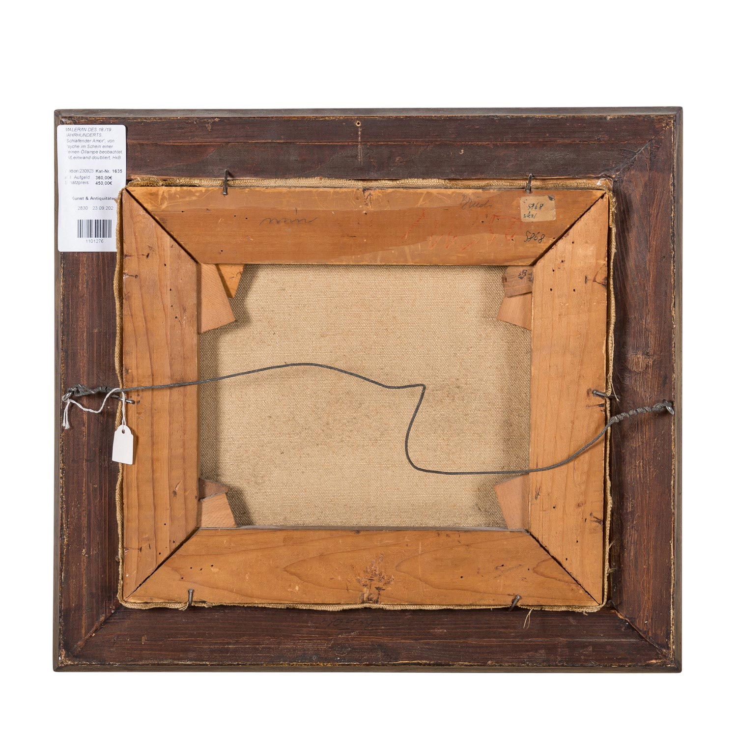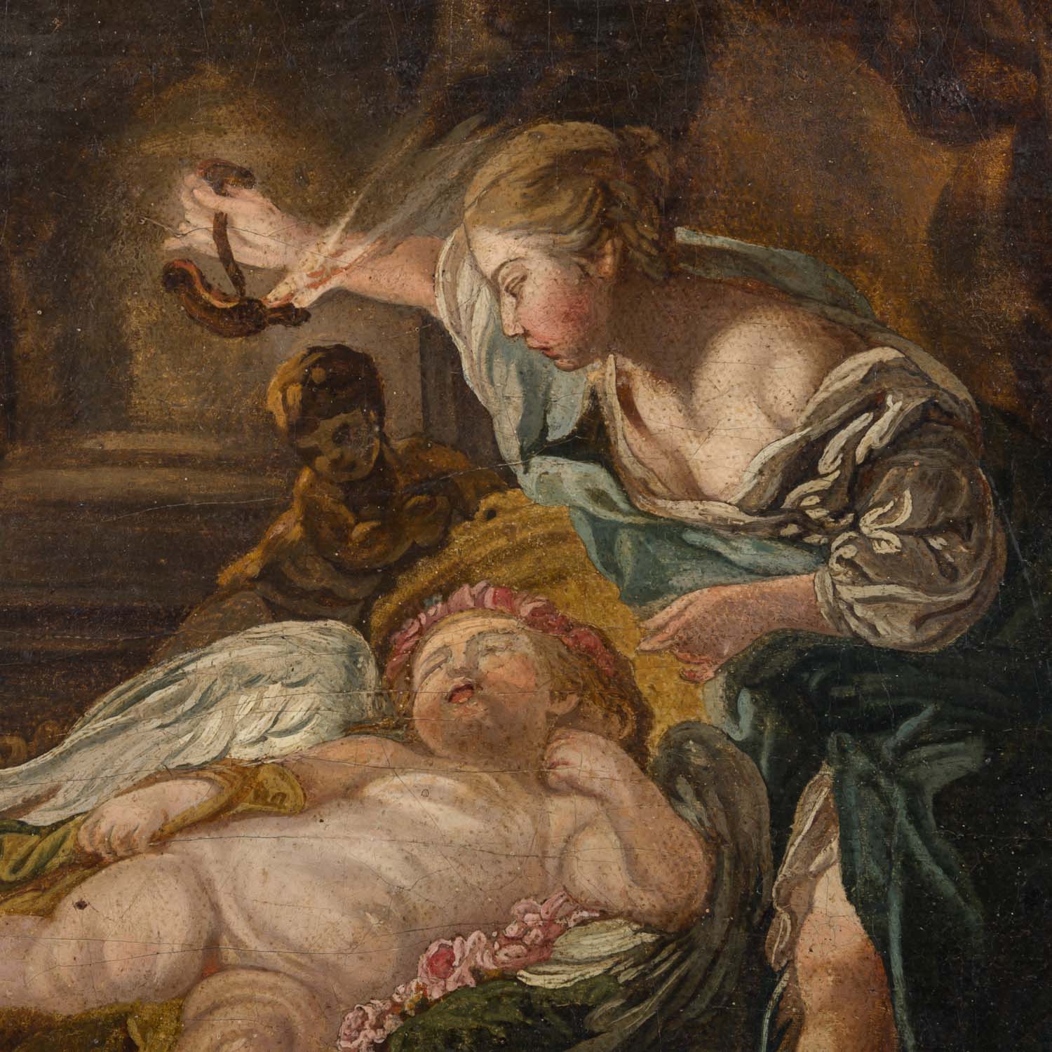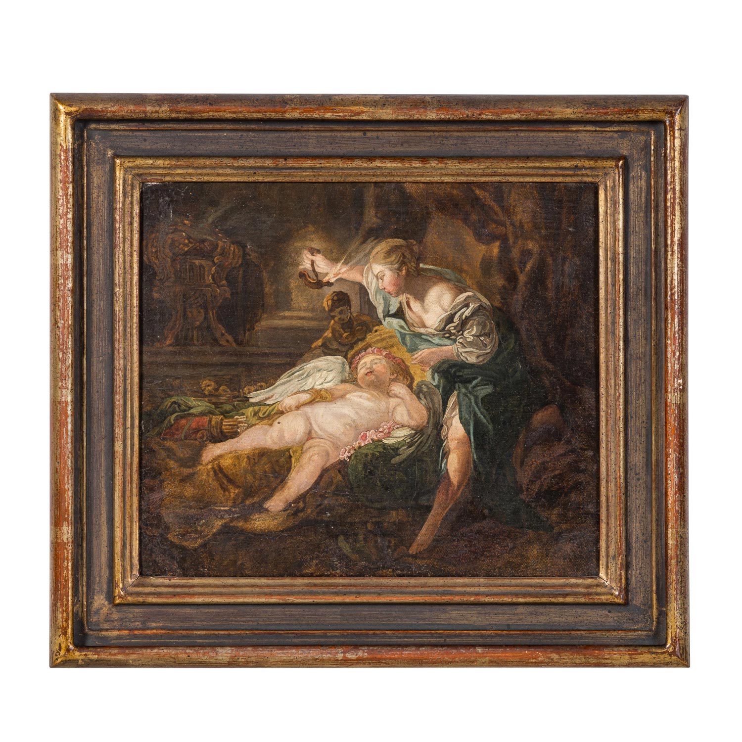 PAINTER OF THE 18th/19th CENTURY, 'Sleeping Cupid', observed by Psyche in the light of a small oil lamp, oil on canvas relined, HxW: approx. 26.5 x 30.5 cm (HxW of frame: approx. 36 x 40 cm). Signs of age and rubbing. Craquelure, small paint defects, old restored and retouched. With frame (slight damage).