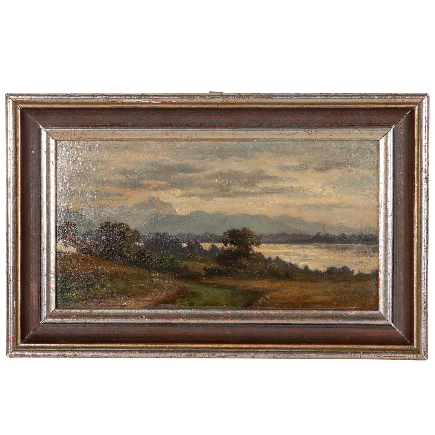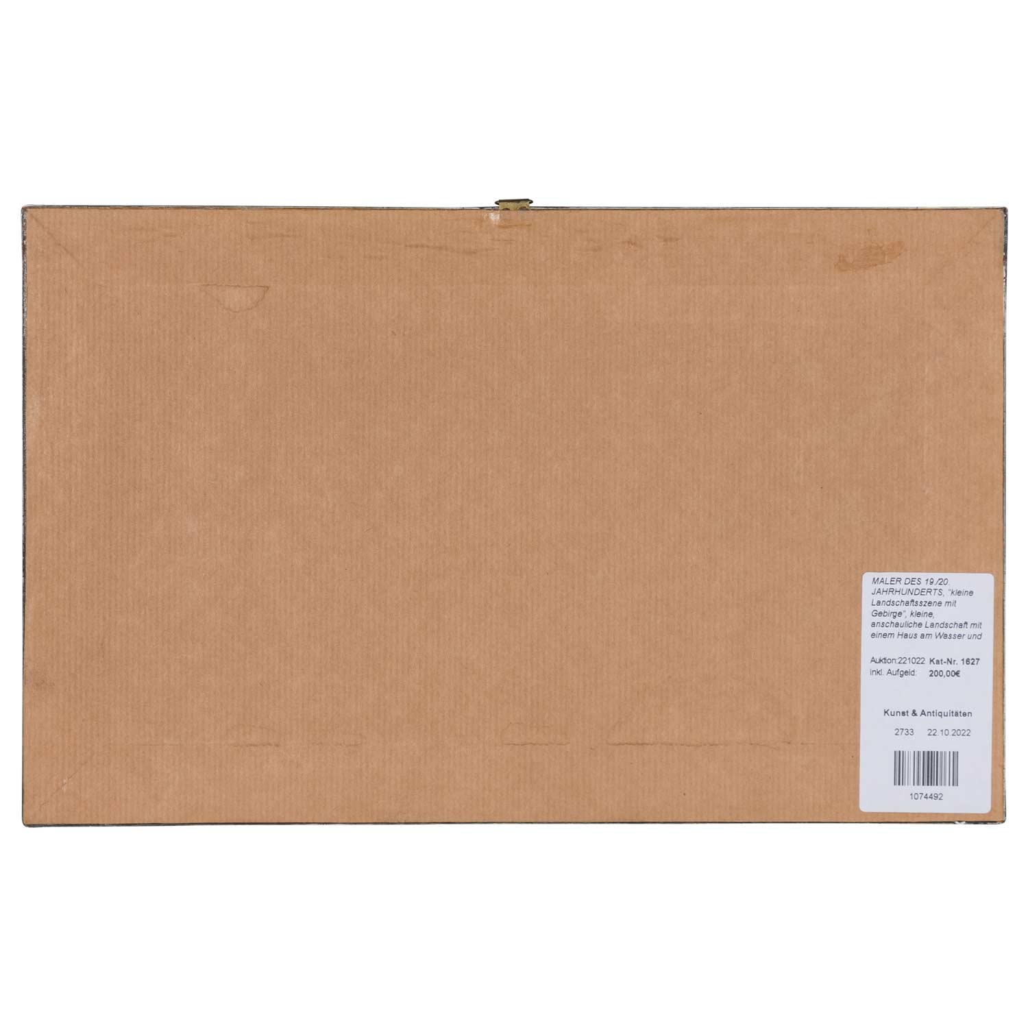 PAINTER OF THE 19th/20th CENTURY, 'Small landscape scene with mountains', small, descriptive landscape with a house on the water and mountain ranges in the background, oil/cardboard, HxW: ca. 13.5x25 cm (20.5x33 cm with frame). Browned, vertical scratches, stained, paint rubbing at edges. With frame (slightly damaged).
