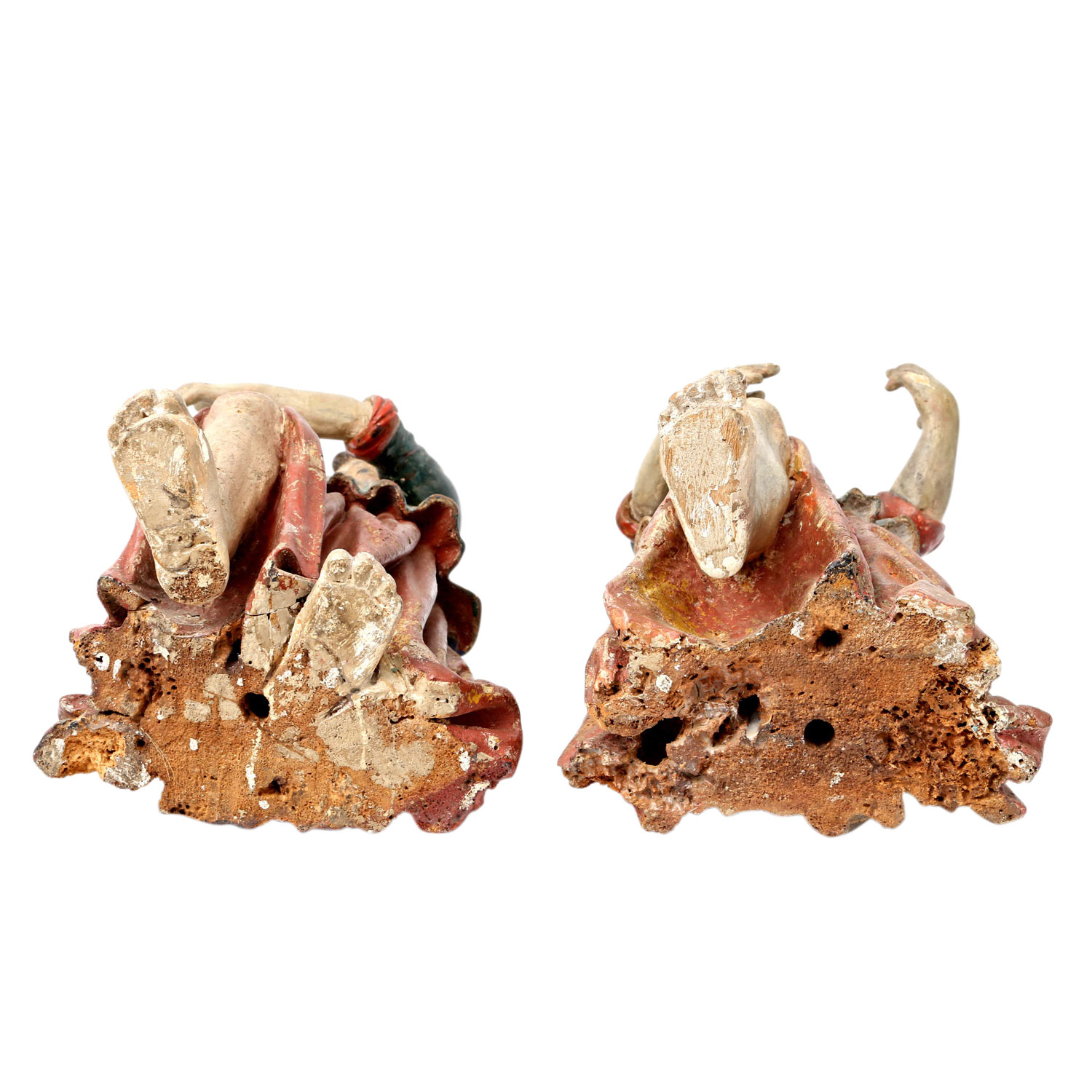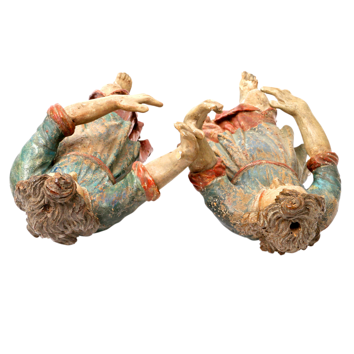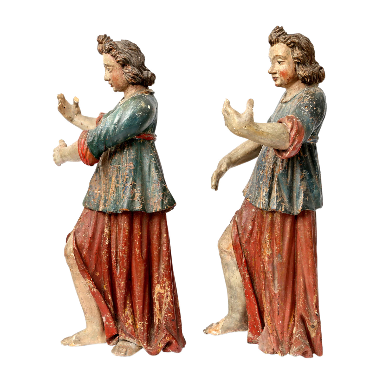 PAIR OF ALTAR ANGELS, West German, 17th century, wood, carved in full plastic, older, colored version, worked as counterparts, each in contrapost, the angels in long robes with short, drape, both angel figures holding their arms forward, h. approx. 55 cm. Finger partly dam.