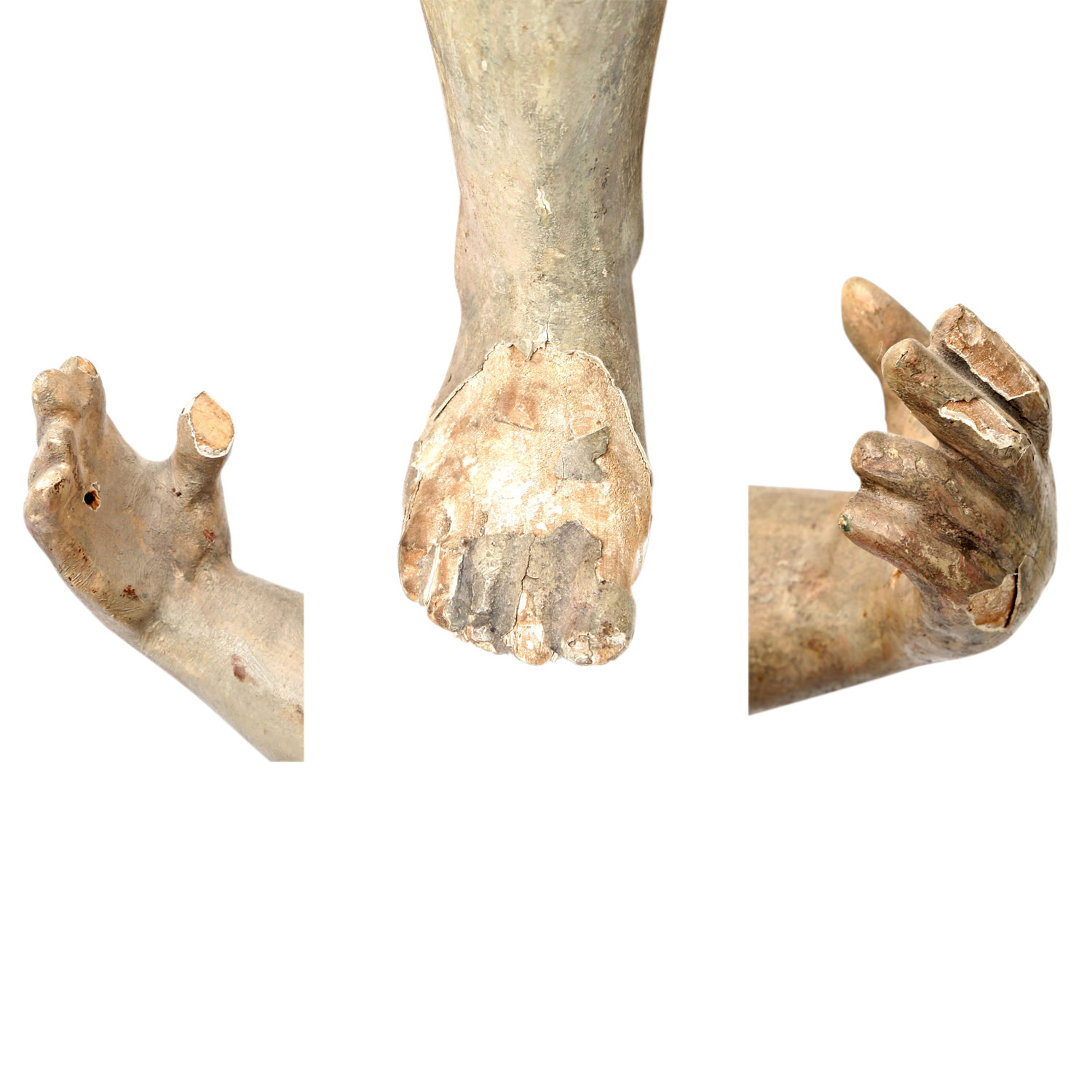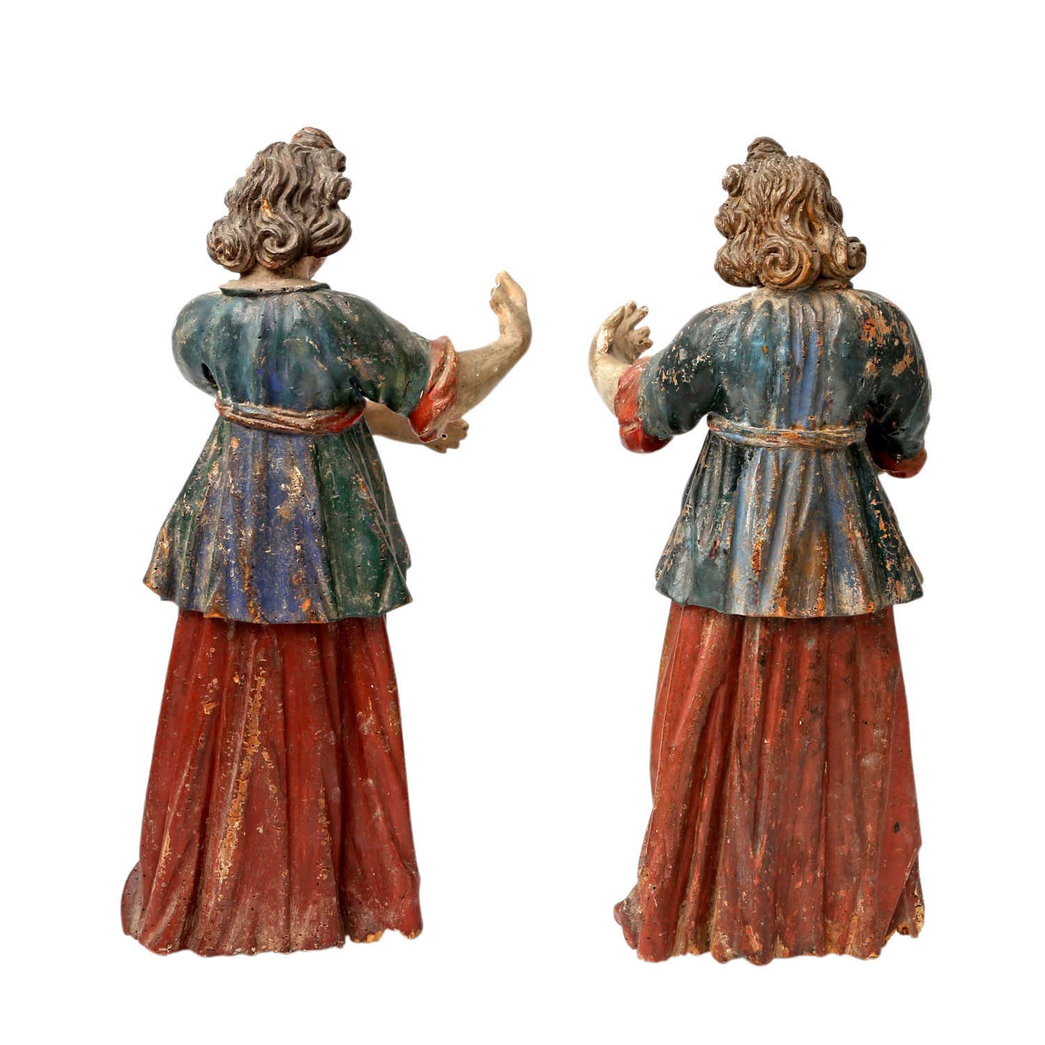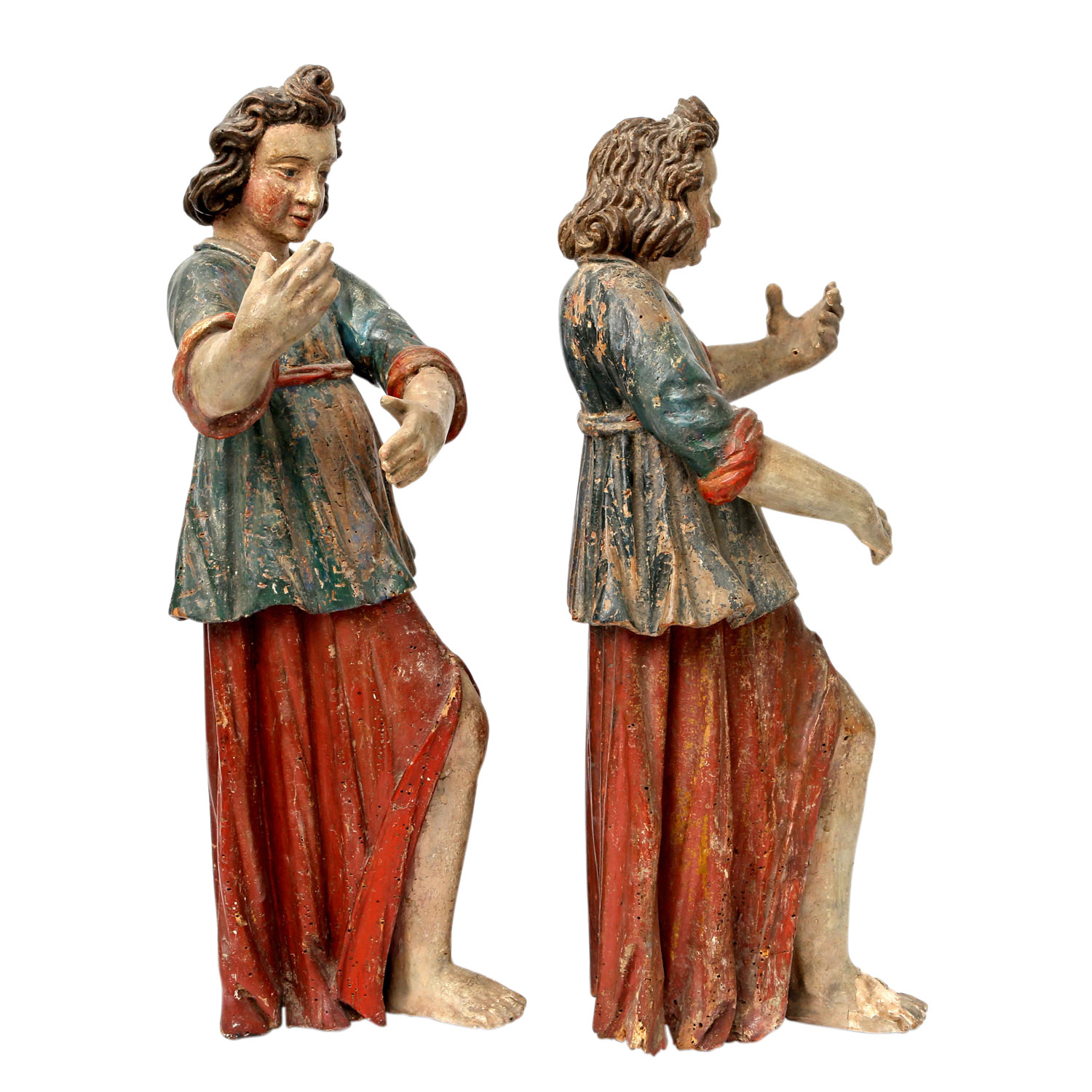 SOME ALTAR ANGELS, West German, 17th century, wood, carved in full plastic, older, colored version, worked as counterparts, each in contrapost, the angels in long garb with short, throw-over, both figures of angels holding their arms forward, h. approx. 55 cm. Fingers partly dam.