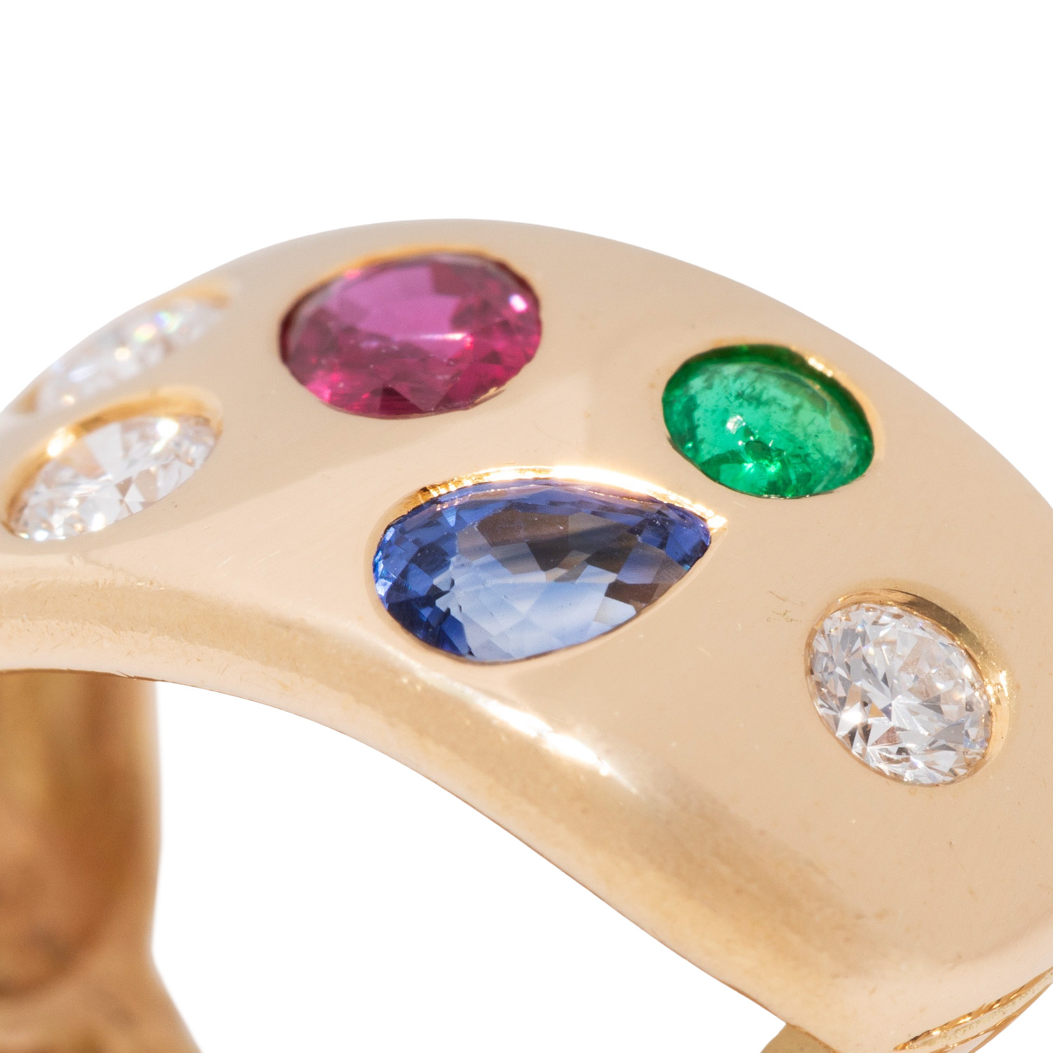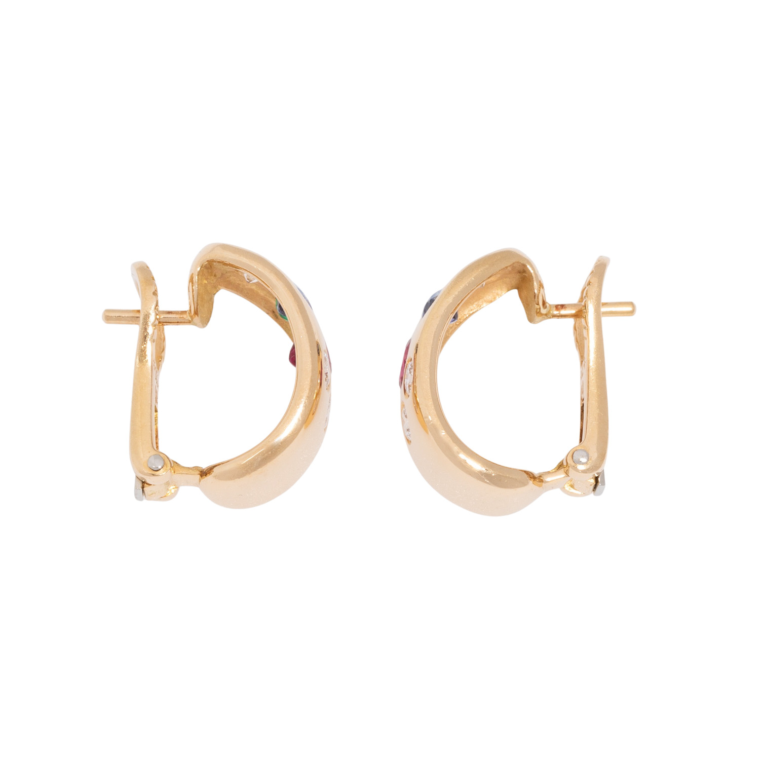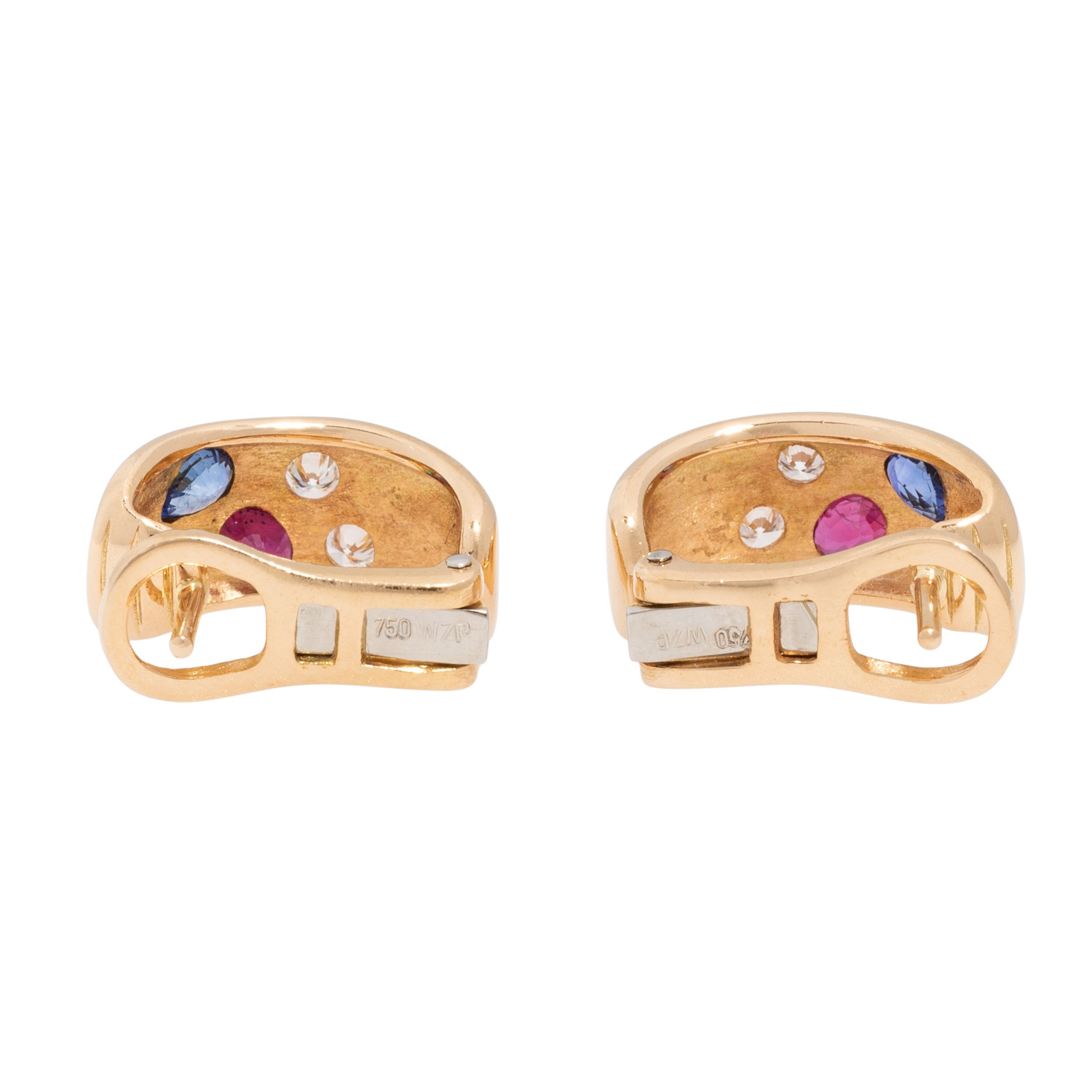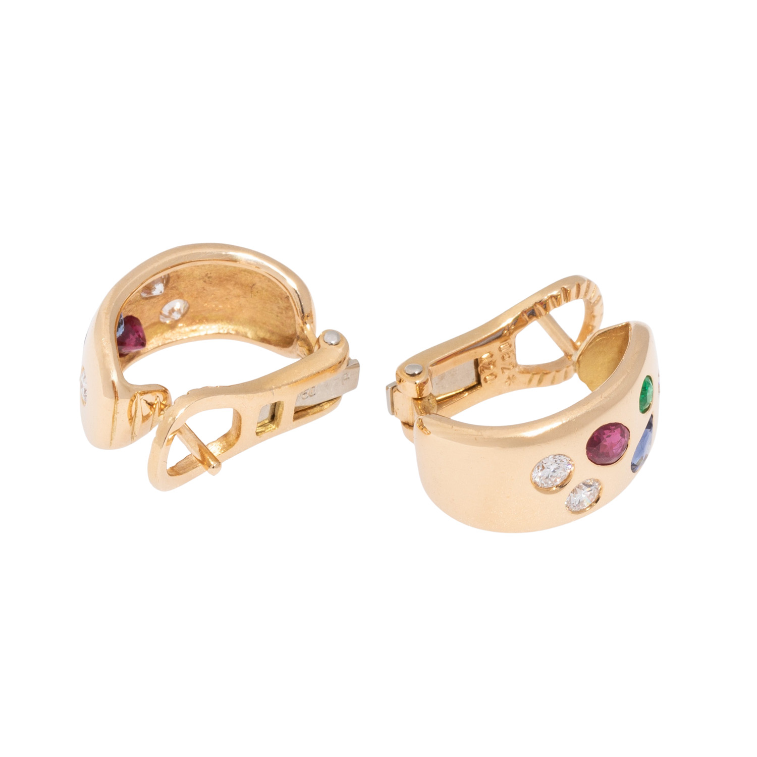 Pair of clip earrings with 2 rubies, 2 emeralds, 2 sapphires, and 6 brilliant-cut diamonds, totalling 0.39 ct (engraved), RW (F-G)/VS, faceted oval-cut rubies, faceted round-cut emeralds, faceted drop-cut sapphires, gemstones totalling 1.05 ct (engraved), 18K yellow gold, 8.6 g, L: approx. 17.1 mm, W: approx. 8.8 mm, late 20th/early 21st century, minor signs of wear, with hallmark 'WZP.'