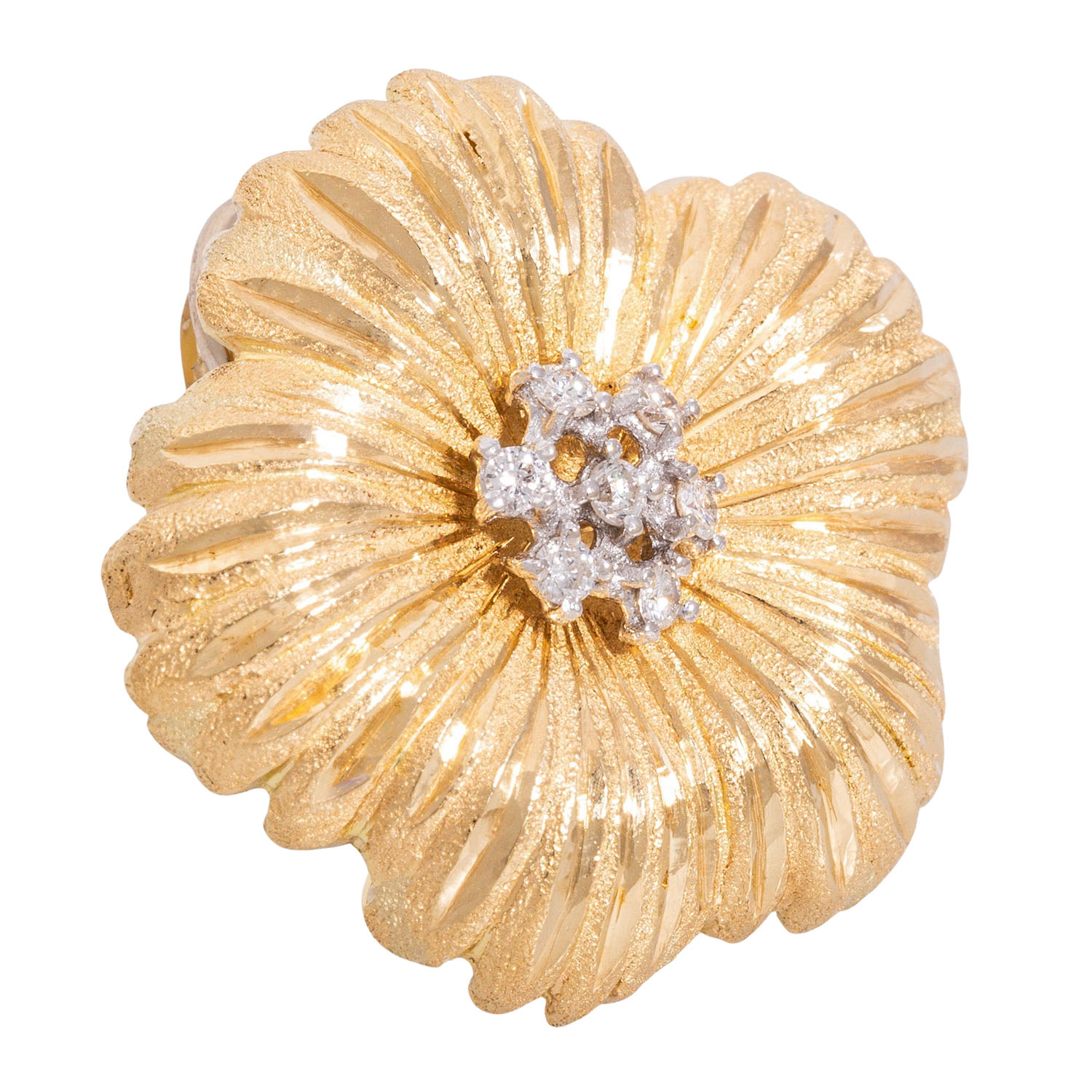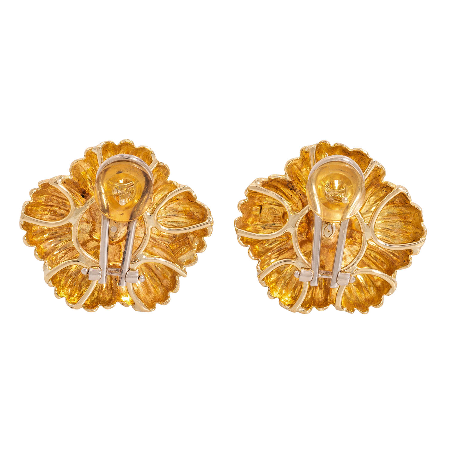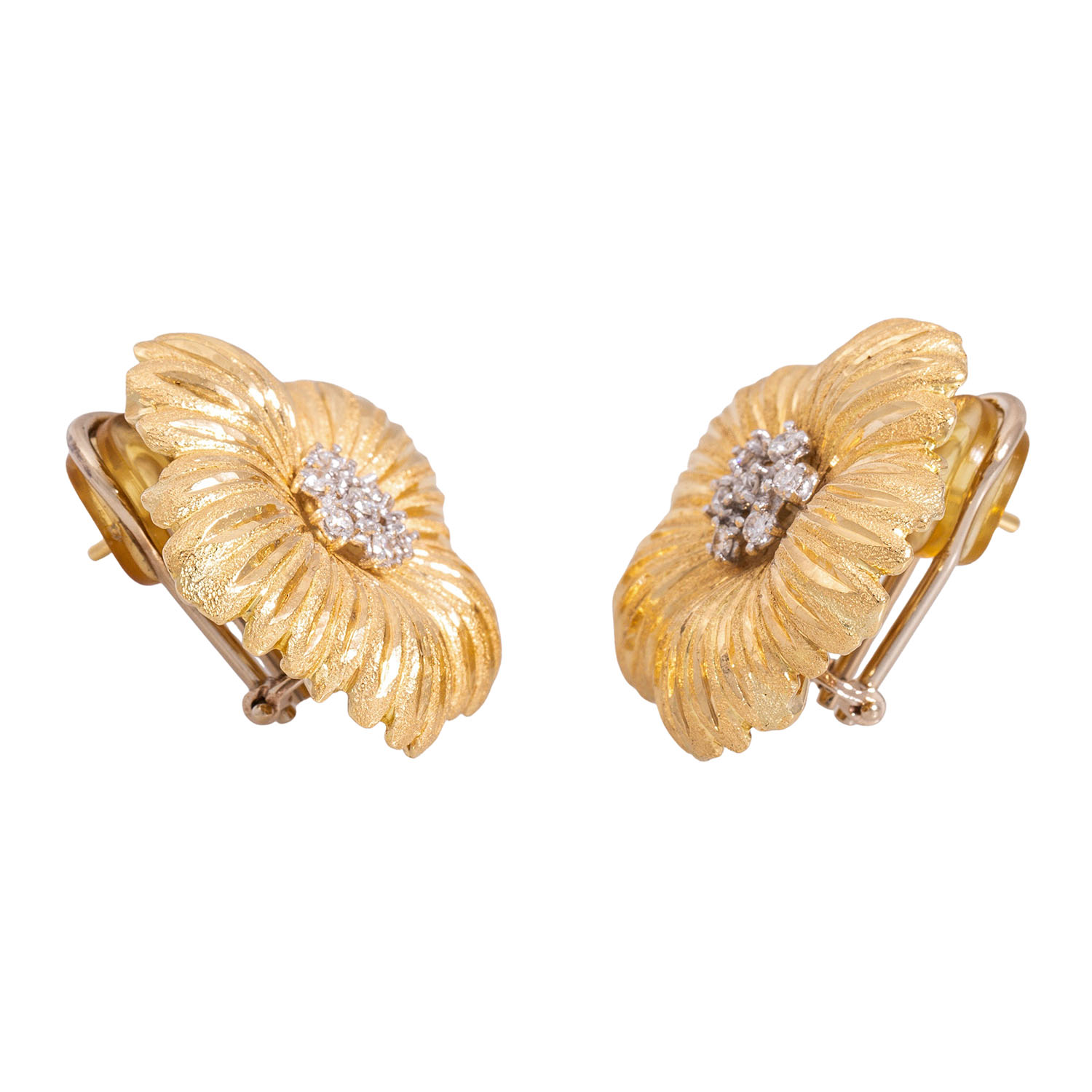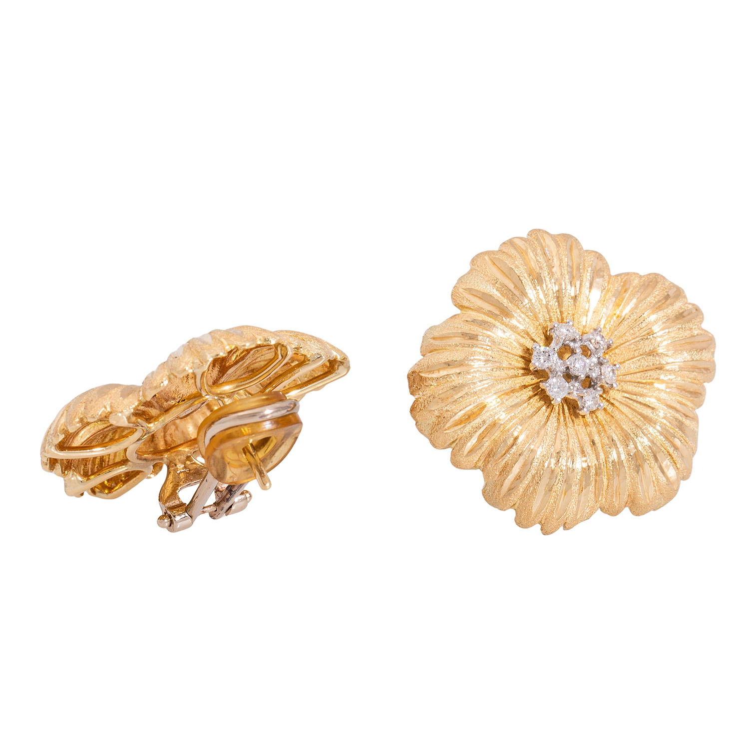 Pair of earstuds/earclips 'Blossom' with 14 brilliant cut diamonds, totalling ap. 0.28 ct, good colour and clarity, 18K yellow and white gold, 16.6 g, L x W: 25 x 27 mm, 20th century, minimal signs of wear, handcrafted work.