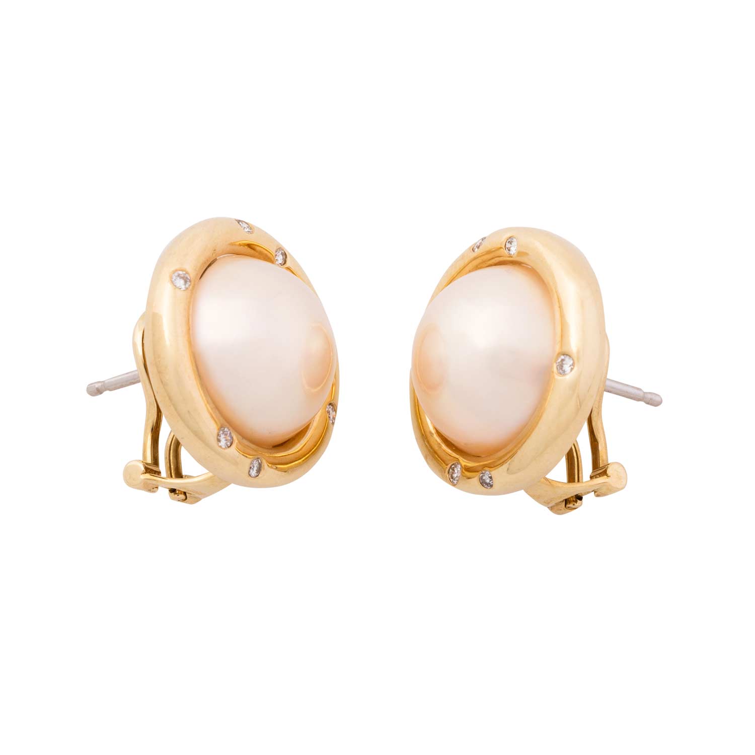 Pair of earstuds/earclips with 2 blister pearls, D: ap. 10 mm, 12 brilliant cut diamonds, totalling ap. 0.14 ct, good colour and clarity, 14K yellow gold, backside and stud in platinum 950, 13.5 g, D: 19.3 mm, late 20th century, minimal signs of wear.