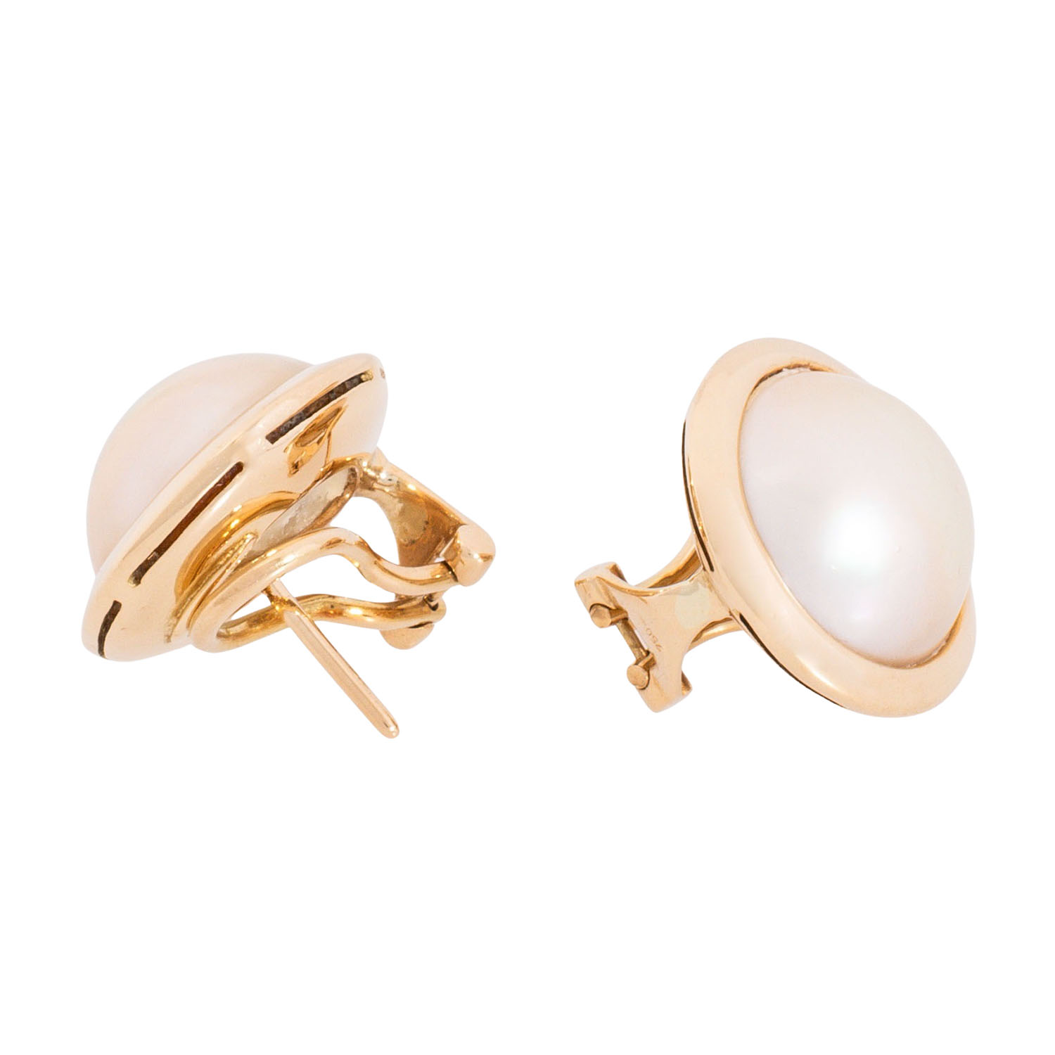 Pair of earstuds/earclips with 2 blister pearls, D: ap. 13.5 mm, cream coloured, good lustre, 18K yellow gold, 10.0 g, D: 17 mm, late 20th century, minimal signs of wear.