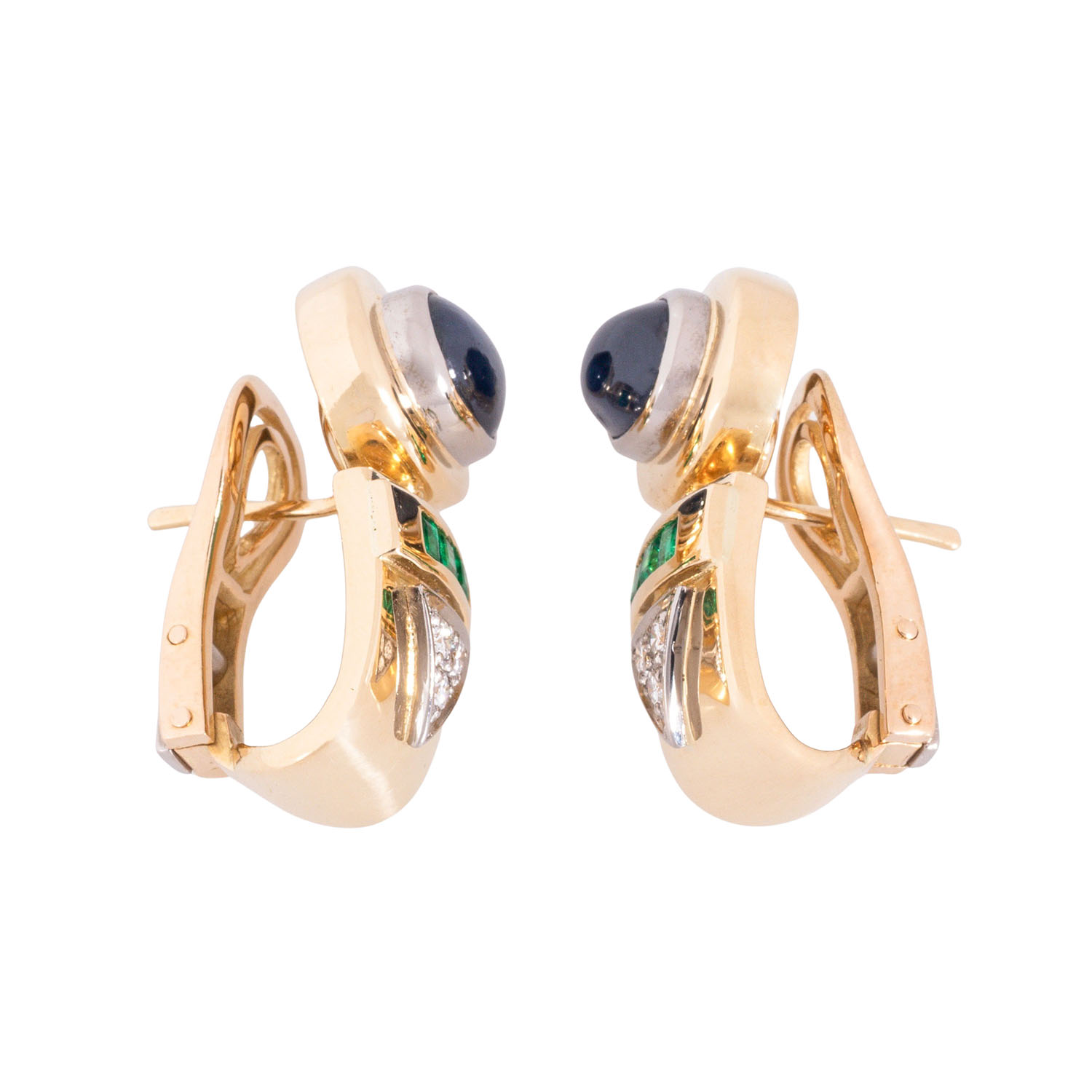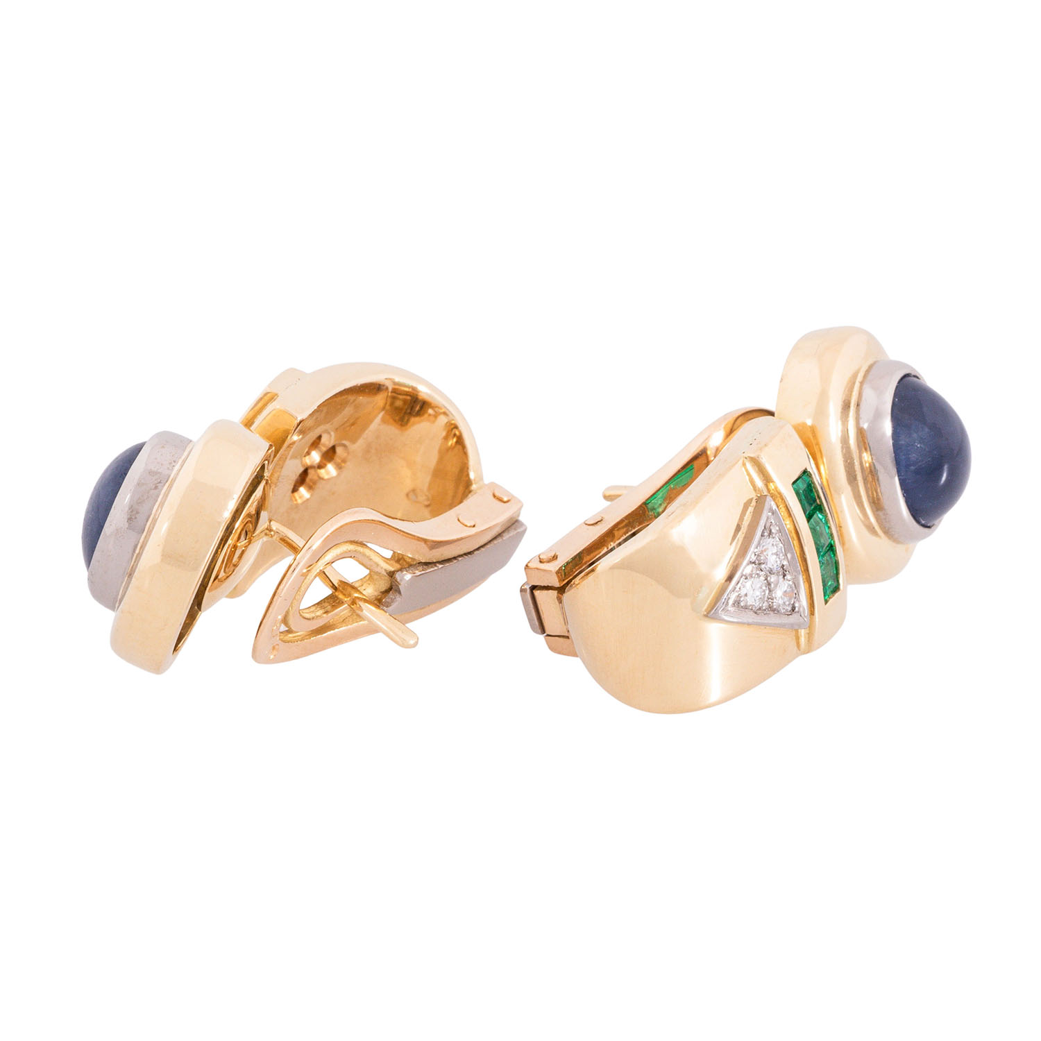 Pair of earstuds/earclips with 2 oval sapphire cabochons, ap. 7 x 5.5 mm, 6 brilliant cut diamonds, totalling ap. 0.16 ct, good colour and clarity, 18K yellow gold, 19.2 g, L x W: 23 x 13 mm, late 20th century, minimal signs of wear.