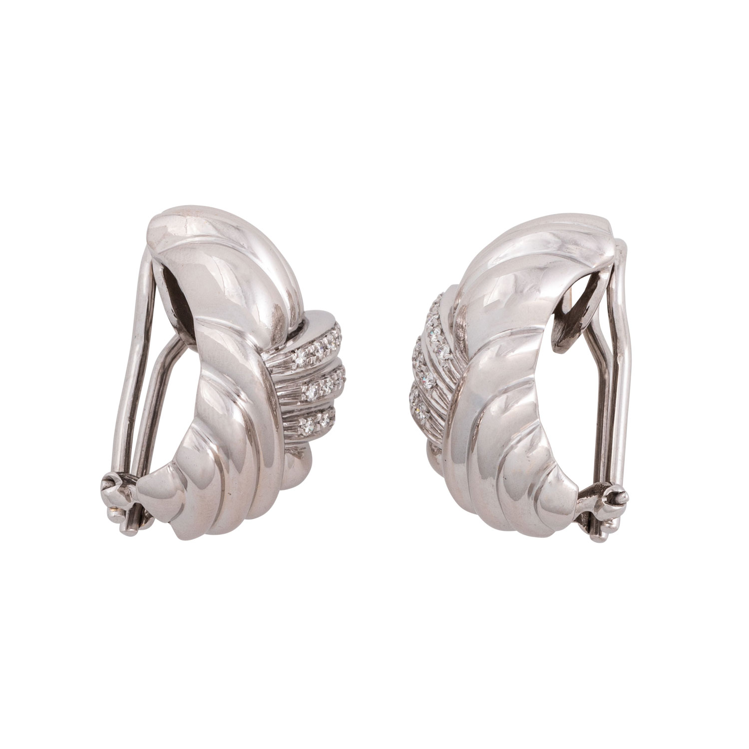Pair of ear clips with 24 brilliant-cut diamonds totalling ca. 0.24 ct, RW (F-G)/VS, pavé set, 18K white gold, 18.7 g, L: ca. 23.6 mm, W: ca. 11.4 - 16.8 mm, end of 20th century, minor signs of wear.