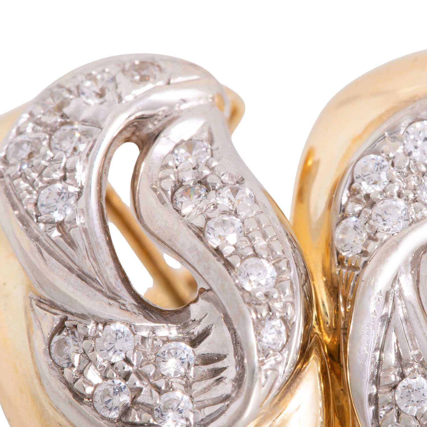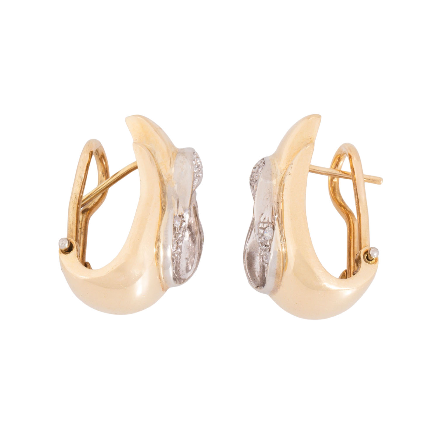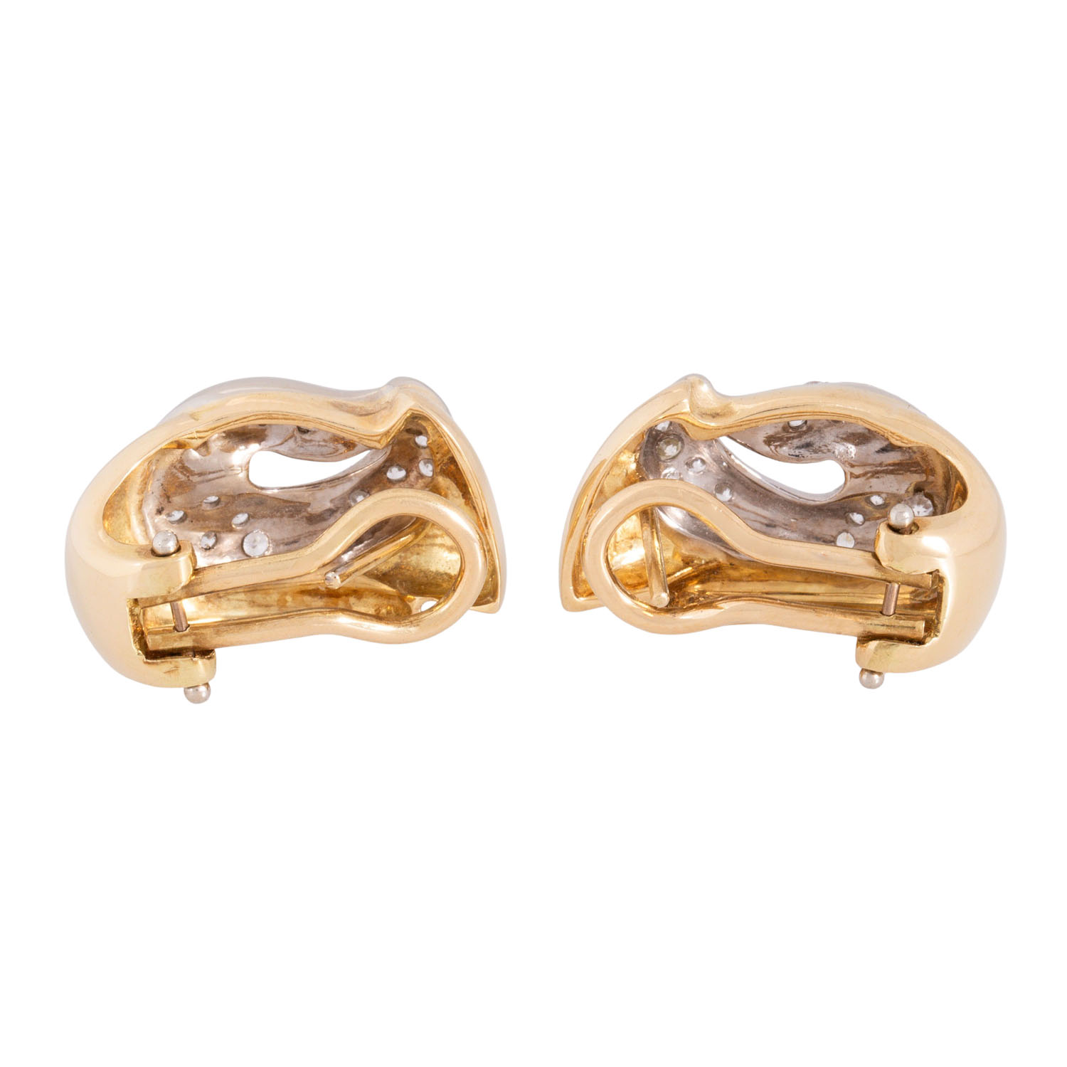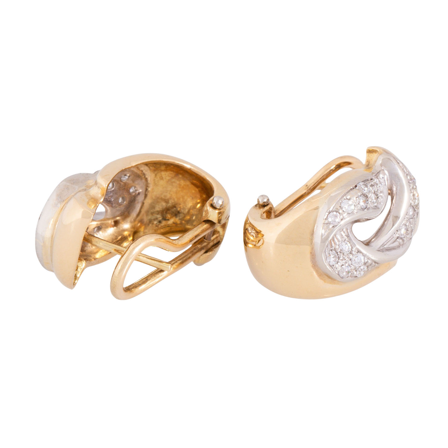Pair of earstudclißs with 34 brilliant cut diamonds, totalling ap. 0.55 ct, good colour and clarity, 18K yellow and white gold, 14.0 g, L x W: 21 x 14 mm, late 20th century, minimal signs of wear.