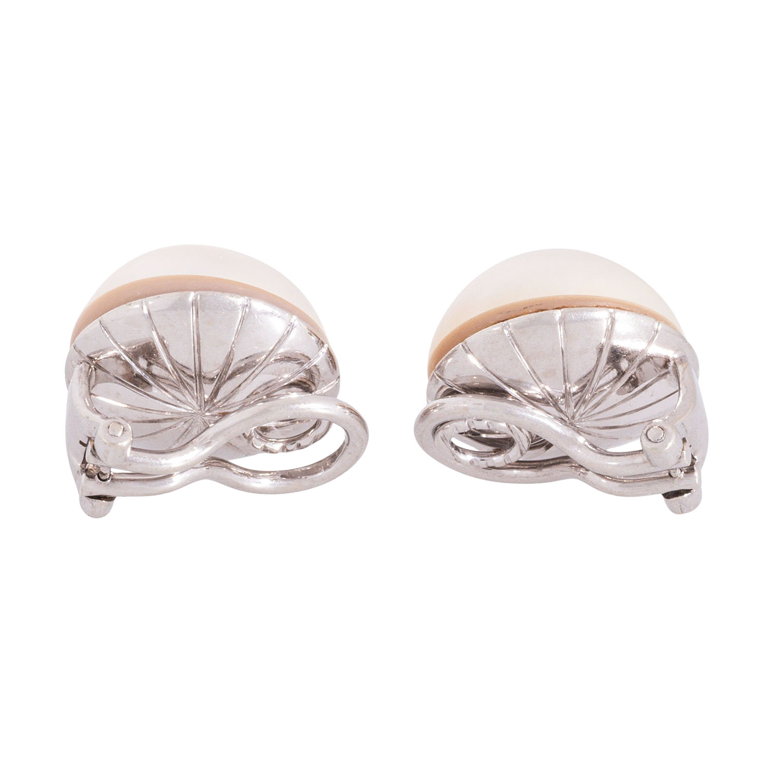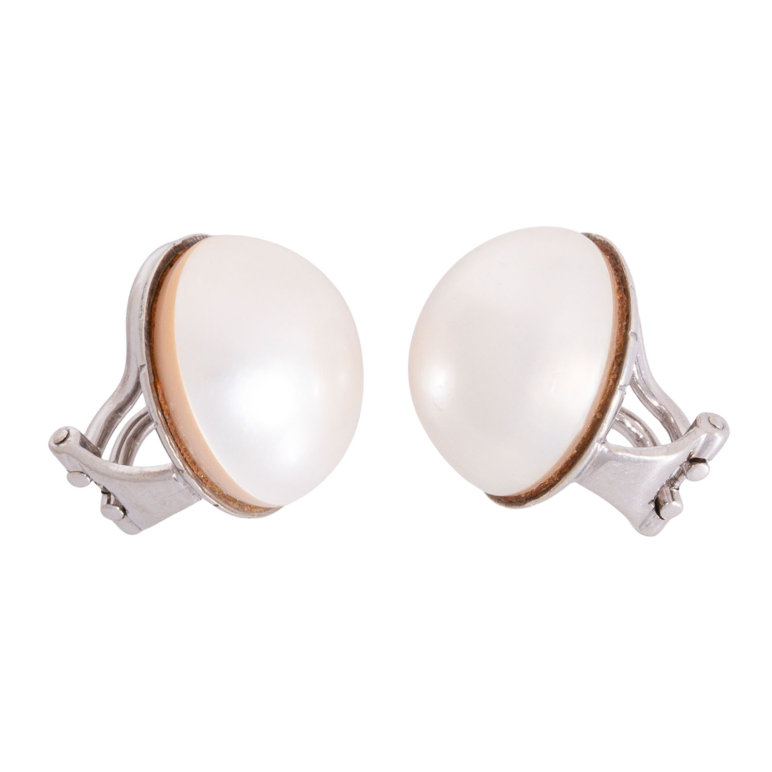 Pair of ear clips with Mabé pearls, white, good luster, D: approx. 18 mm, 14K white gold, 7.9 g, D: approx. 18 mm, late 20th century, minor signs of wear.