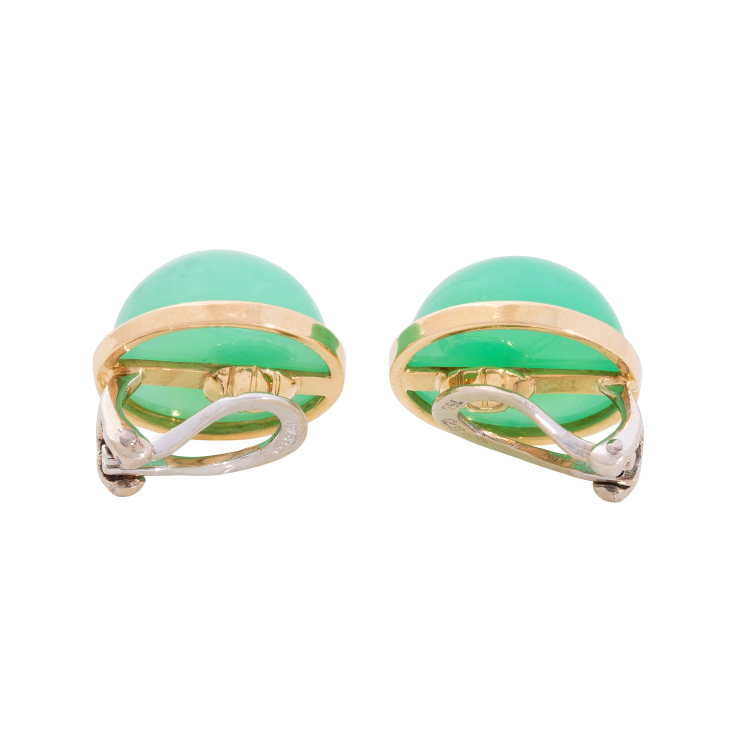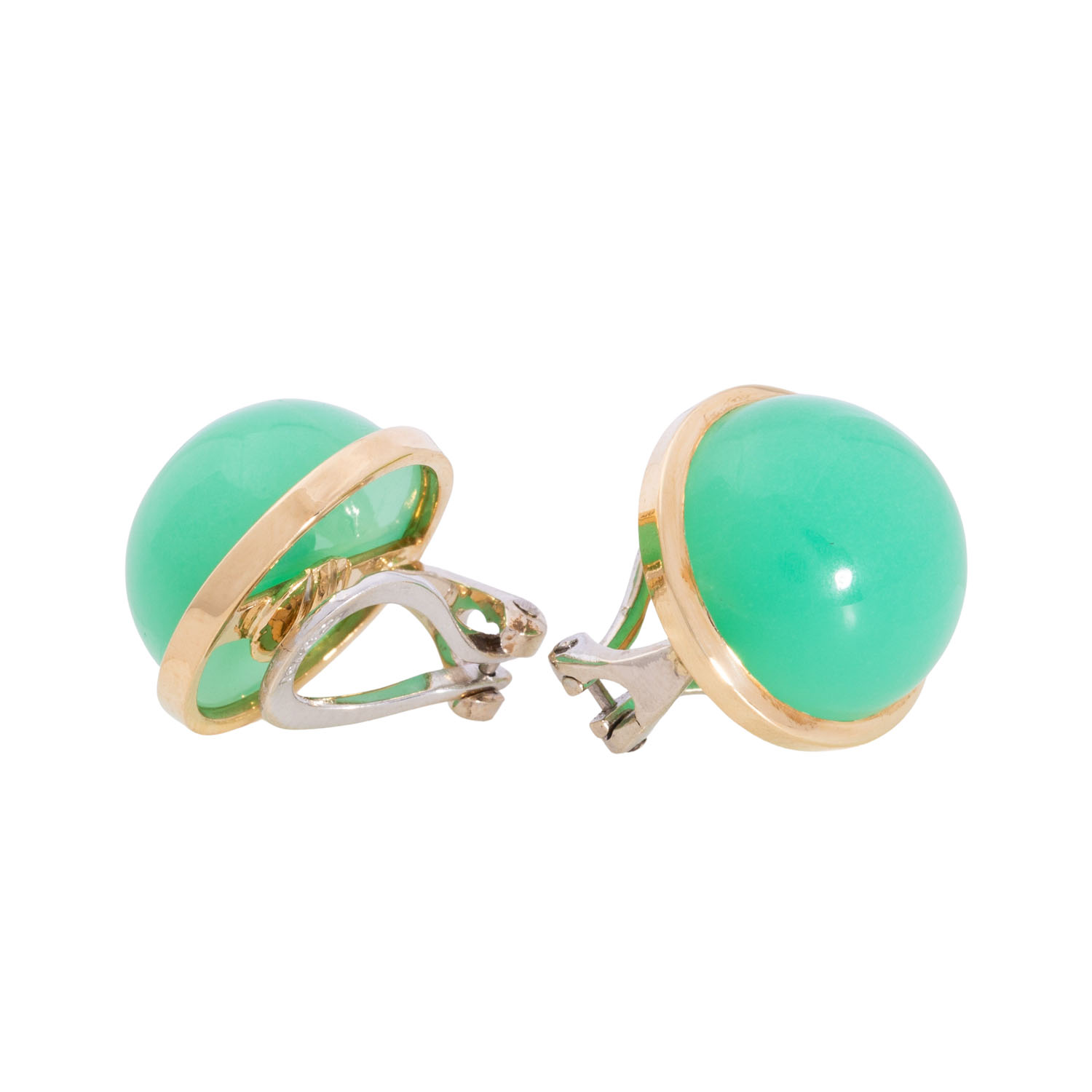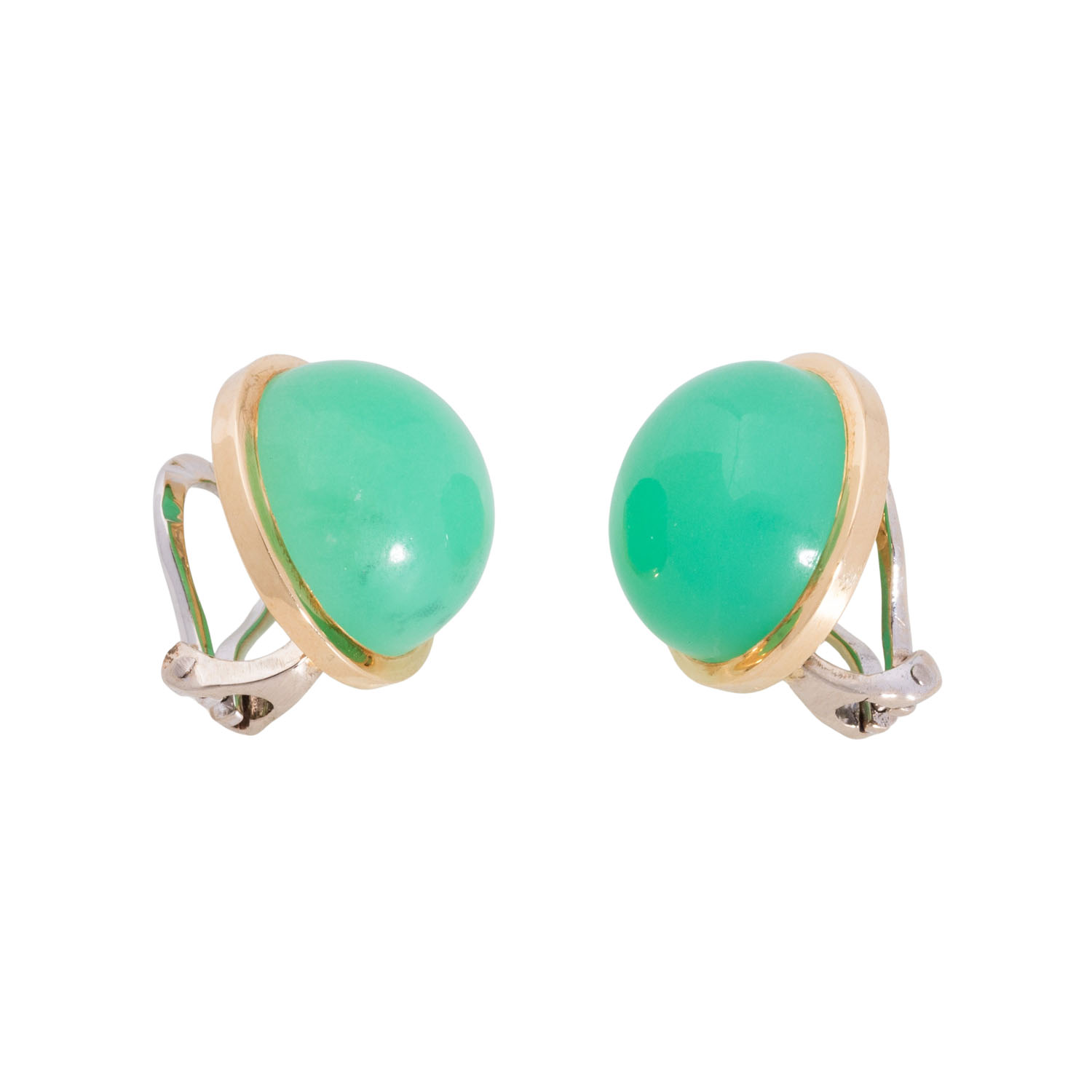 Pair of earclips with 2 round chrysopras cabochons, D: 13 mm, 18K yellow gold, 7.8 g, D: 18 mm, late 20th century, minimal signs of wear.
