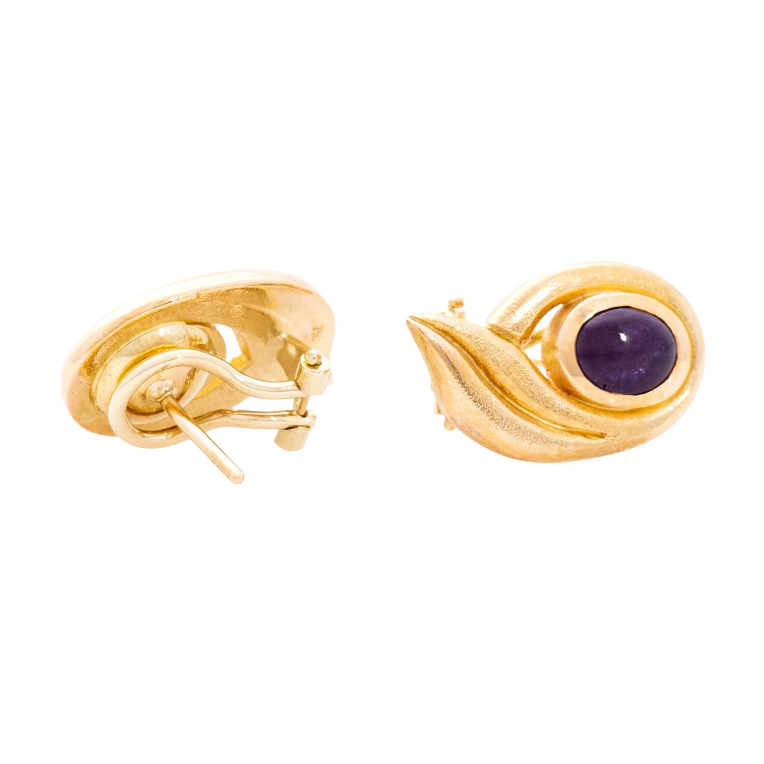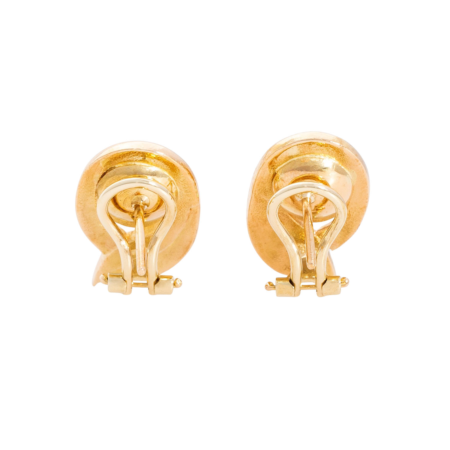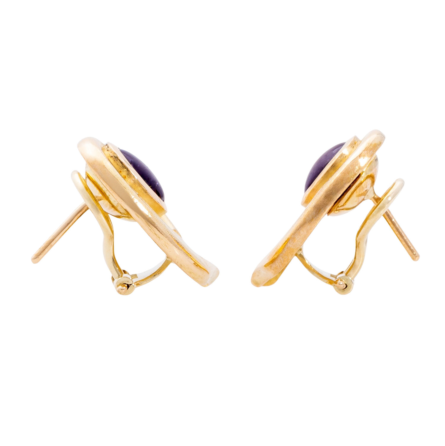 Pair of ear clips with studs each set with 1 oval cabochon-cut ruby, approx. 7.5 x 5.2 mm. 18K YG, 13.4 g, 20th/21st century, rubies slighlty abraded, signs of wear.