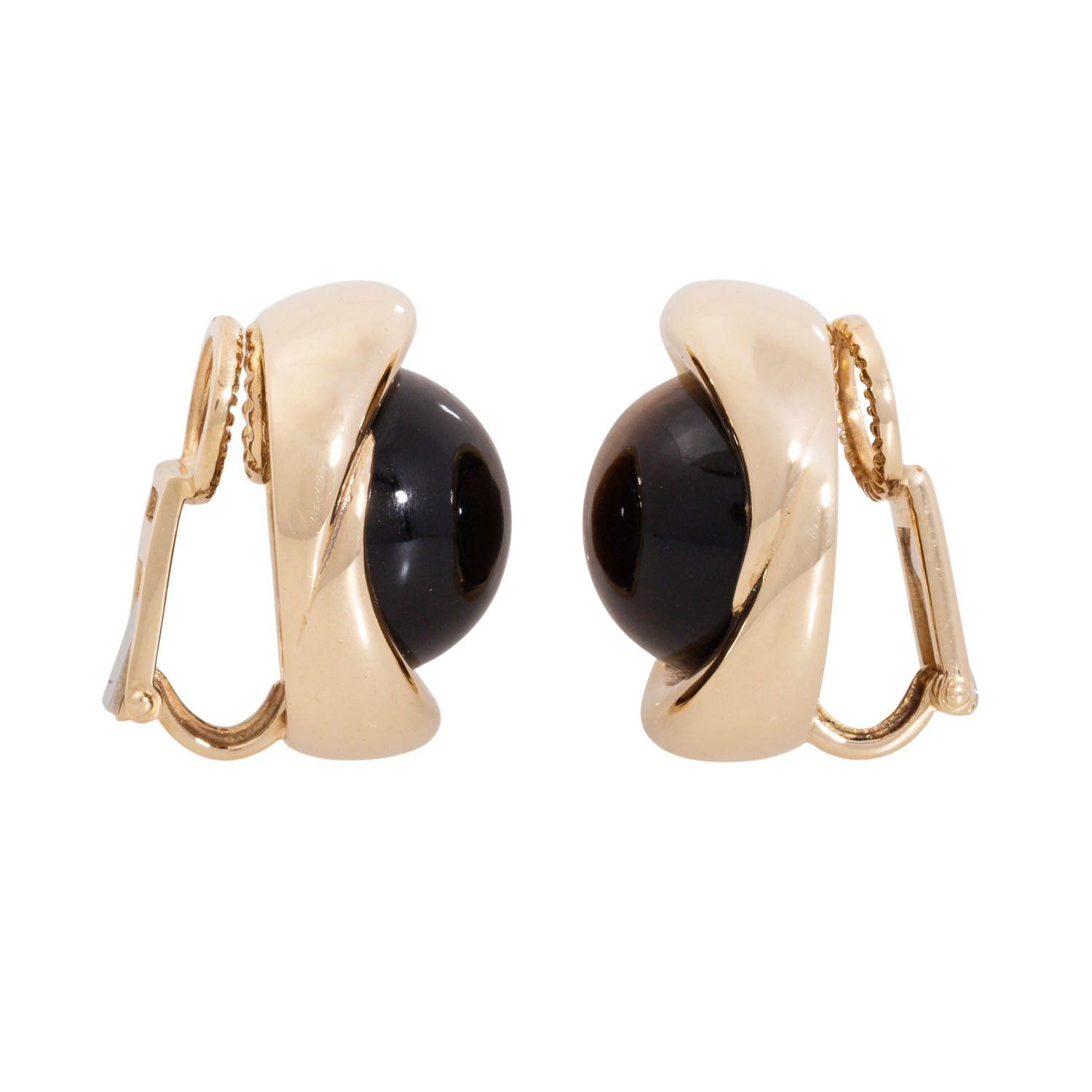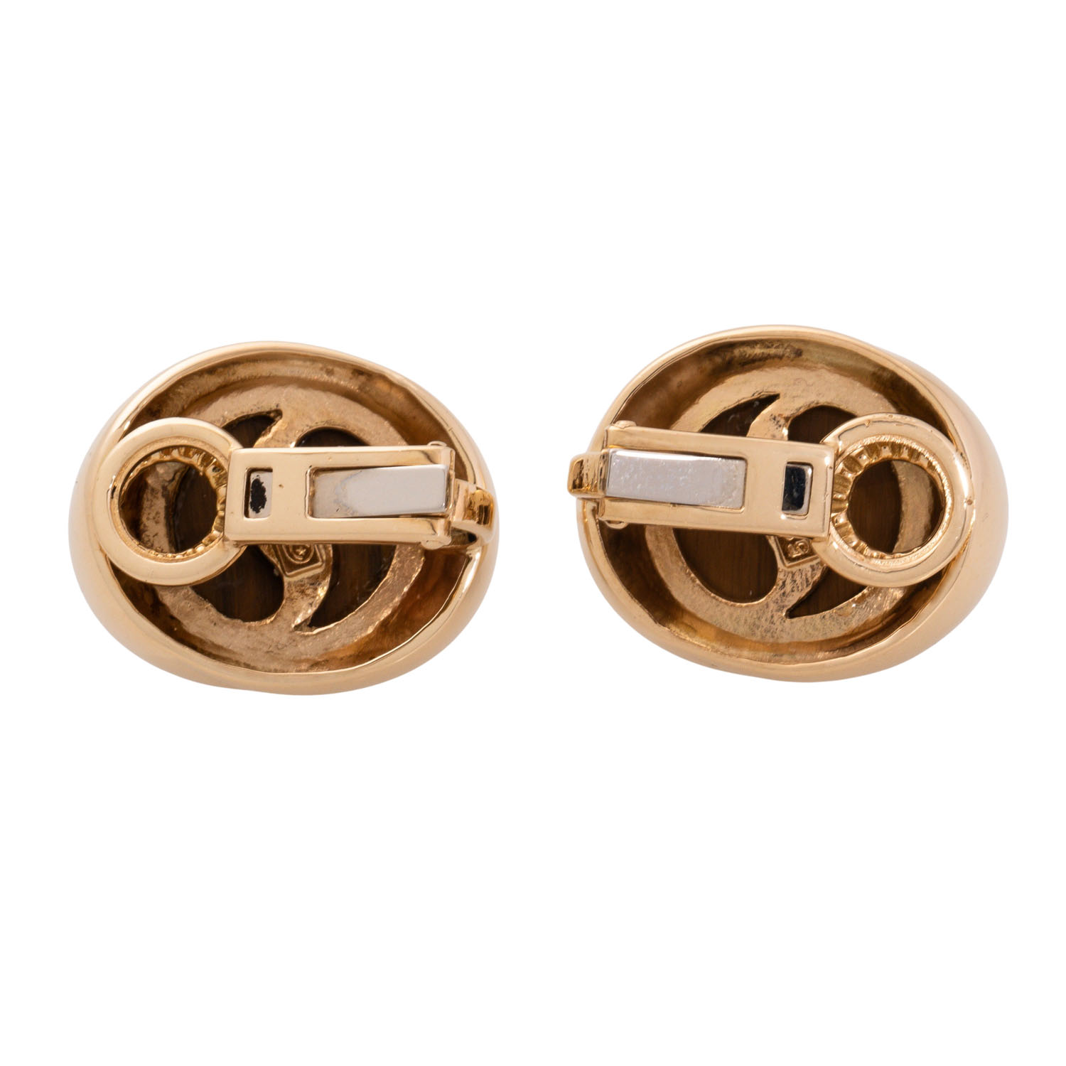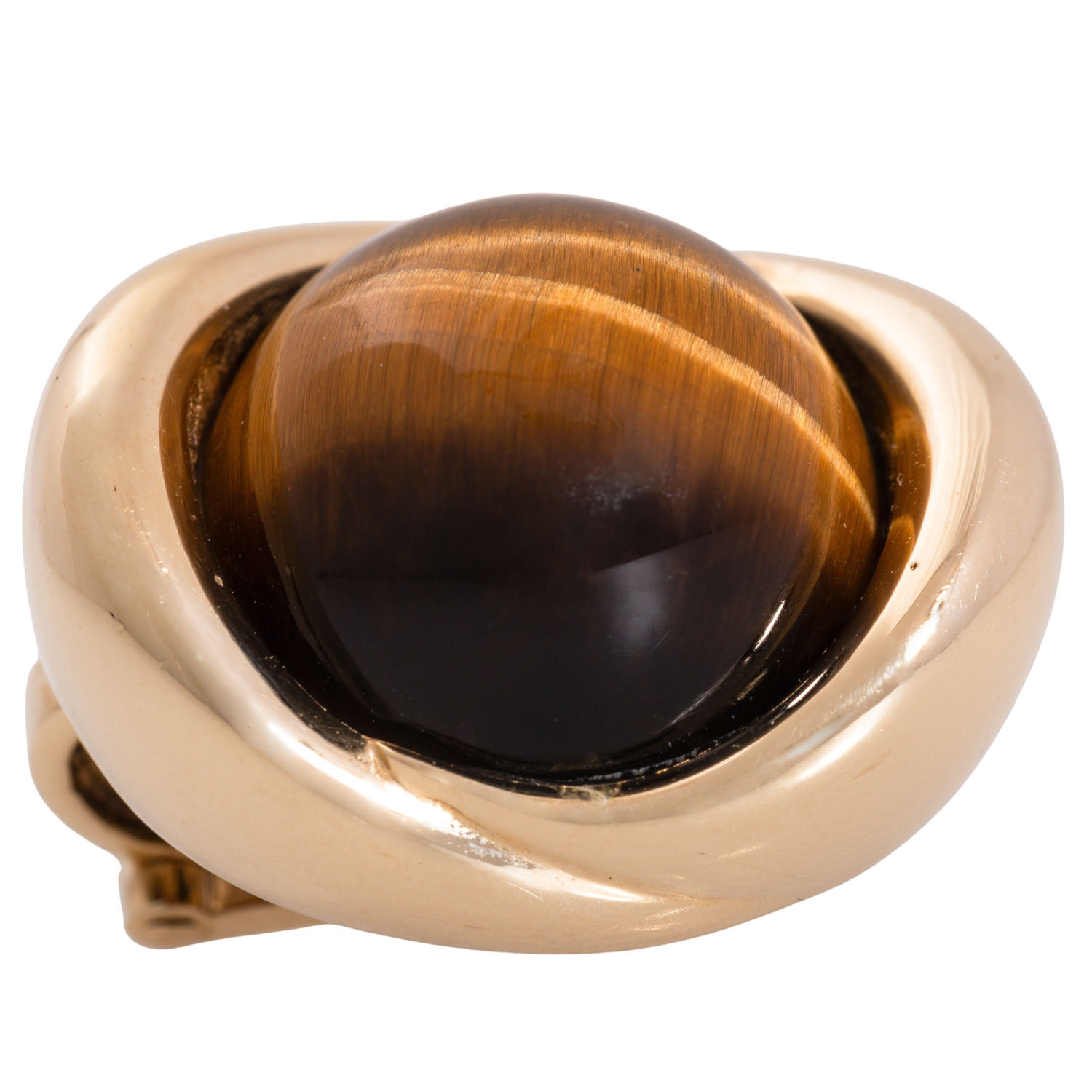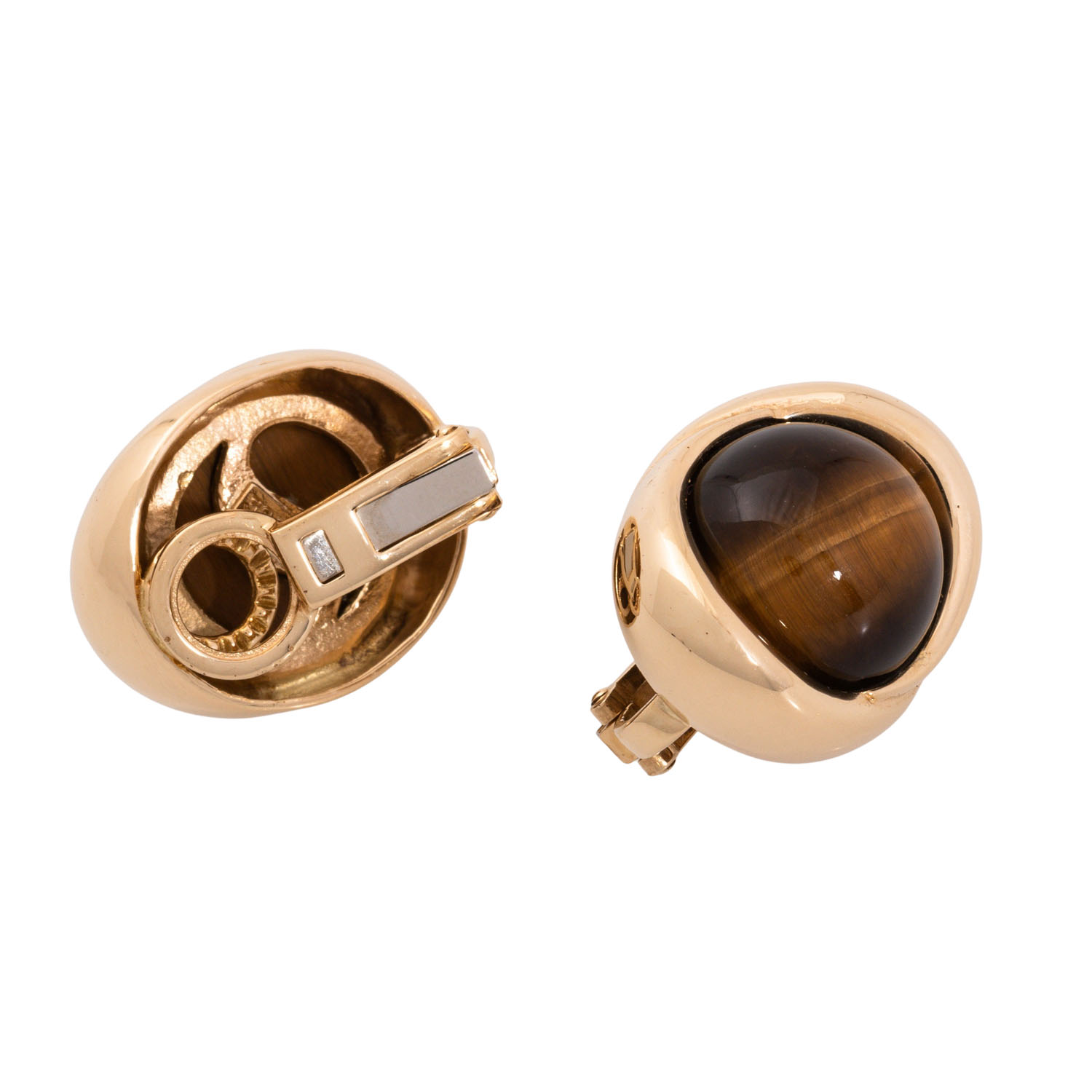 Pair of earclips with round tiger eye cabochons, D: 15 mm, 14K yellow gold, 21.7 g, L x W: ap. 23 x 19 mm, late 20th century, minimal signs of wear.