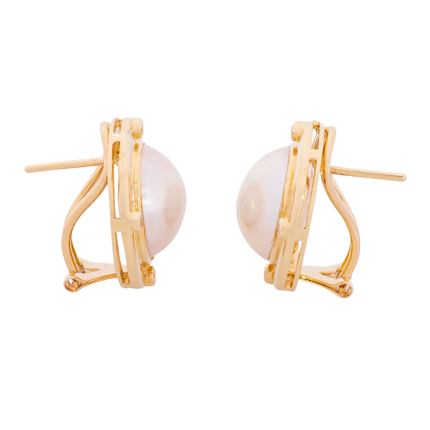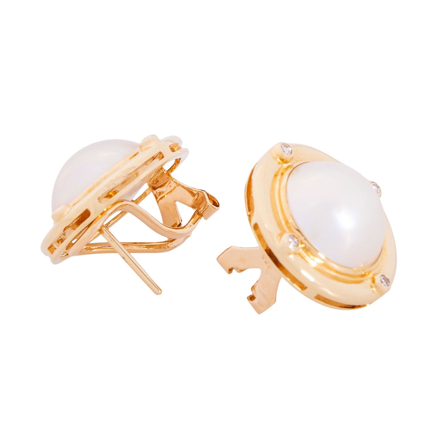 Pair of earstuds/clips with 2 mabe pearls, D: ca. 13.5 mm, white, good lustre, 8 brilliant cut diamonds, totalling ca. 0.08 ct, good colour and clarity, 18K yellow gold, 15.4 g, D: ca. 20.5 mm, late 20th century, minimal signs of wear.