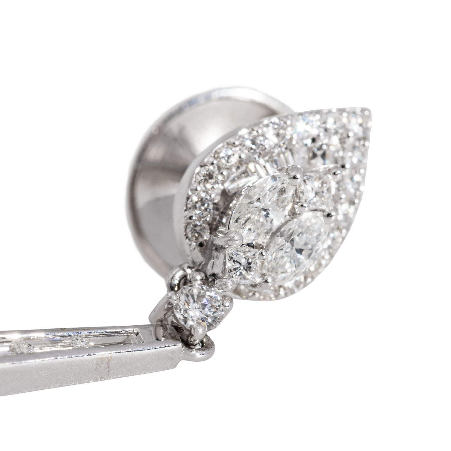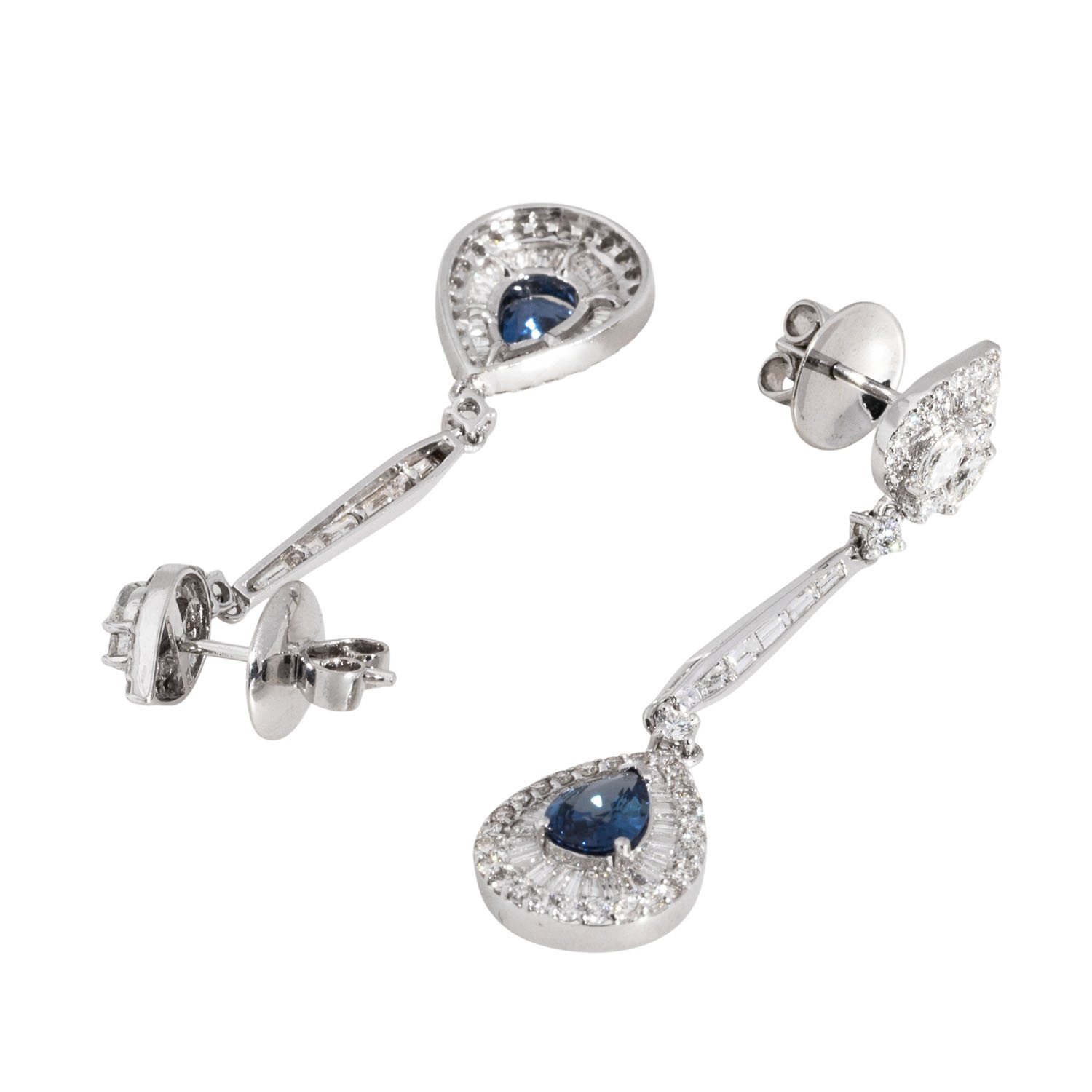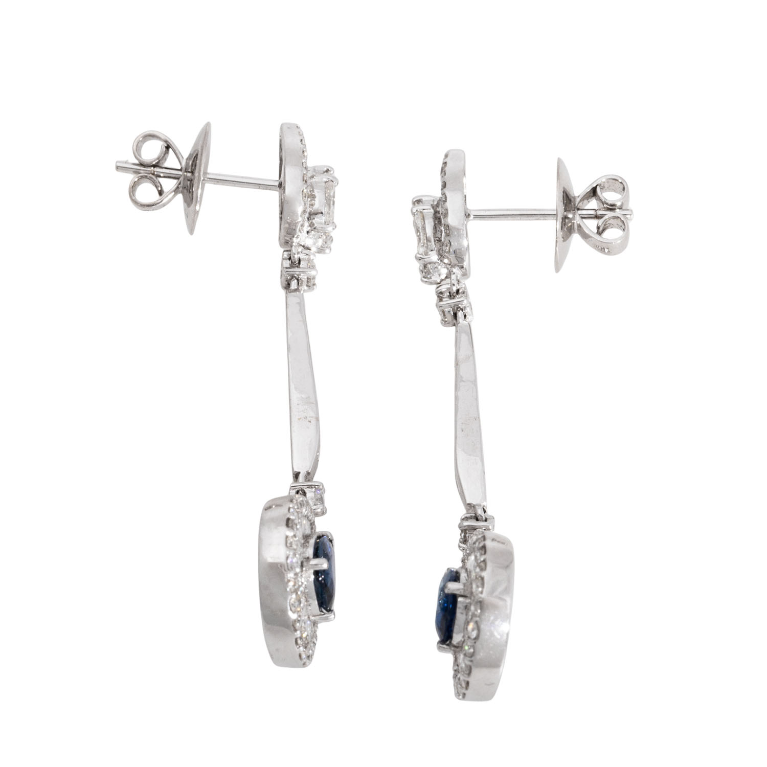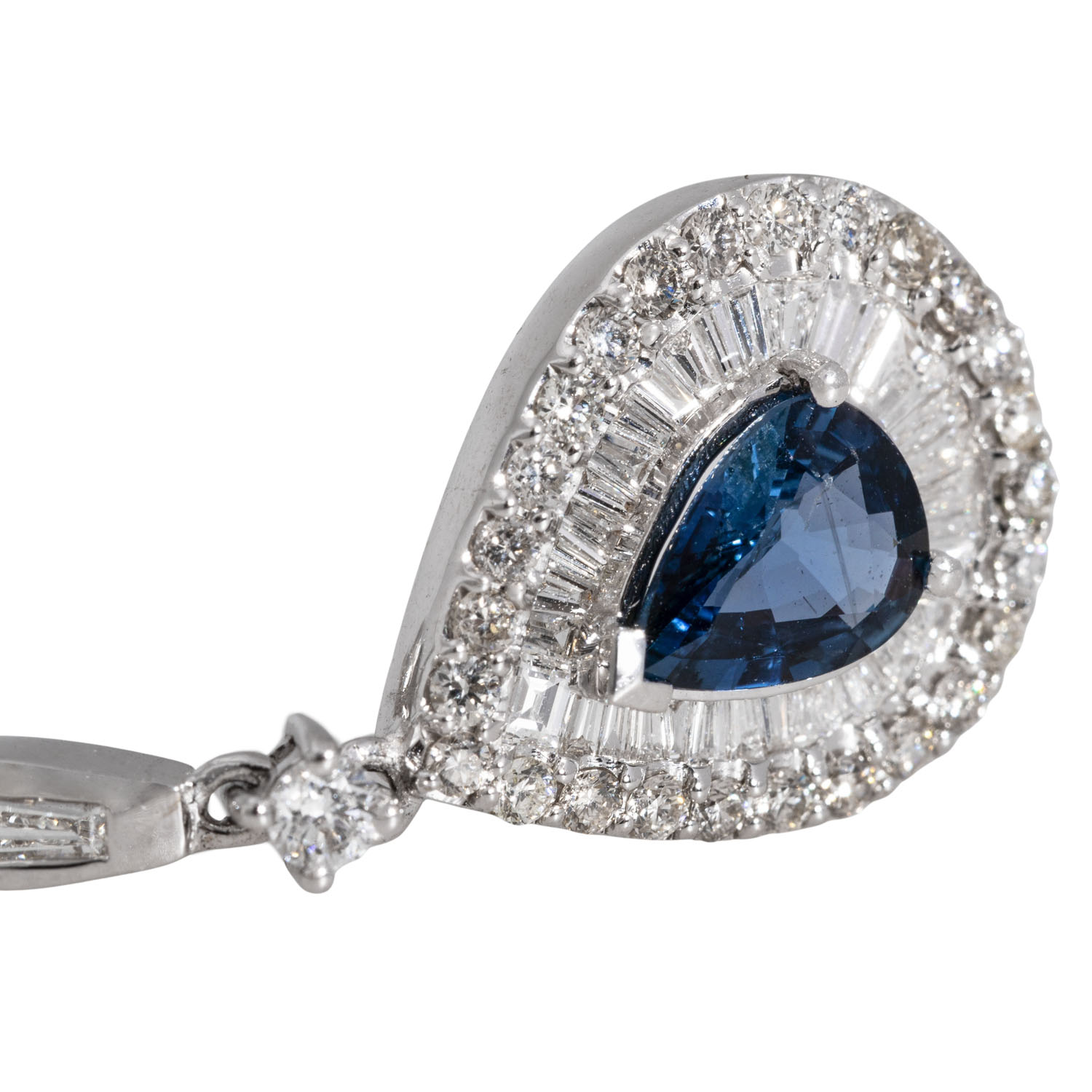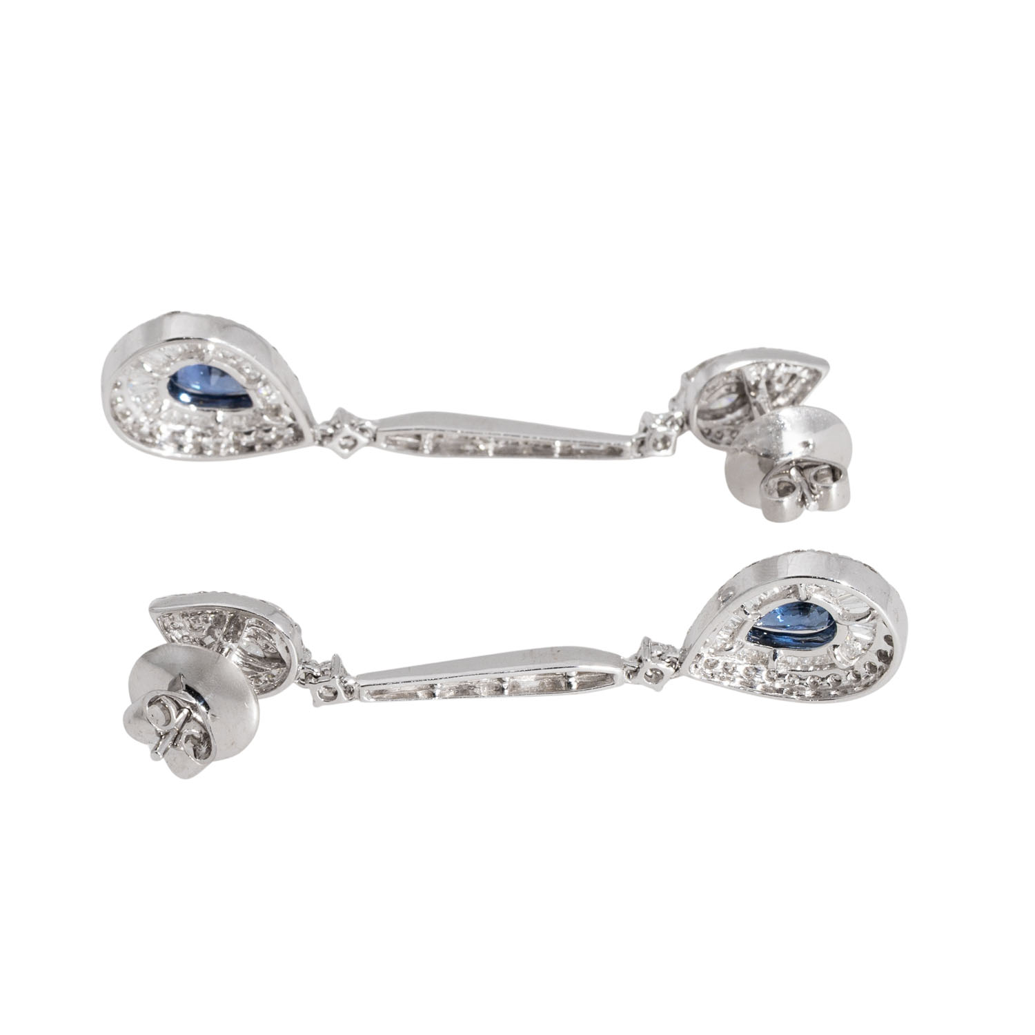 Pair of pendant earrings with 2 pear-cut sapphires totalling 2.65 ct and diamonds in various cuts totalling 2.6 ct, of good colour and clarity, WG 18K, 12.1 g, L: 58 mm, 21st century, mint condition.
