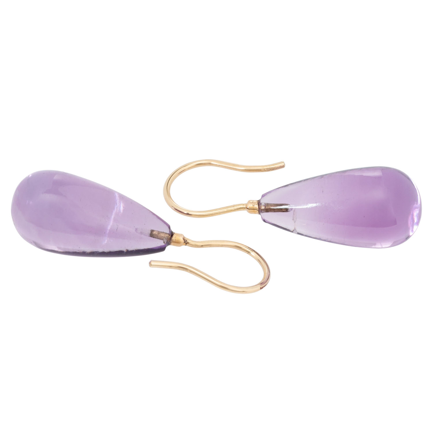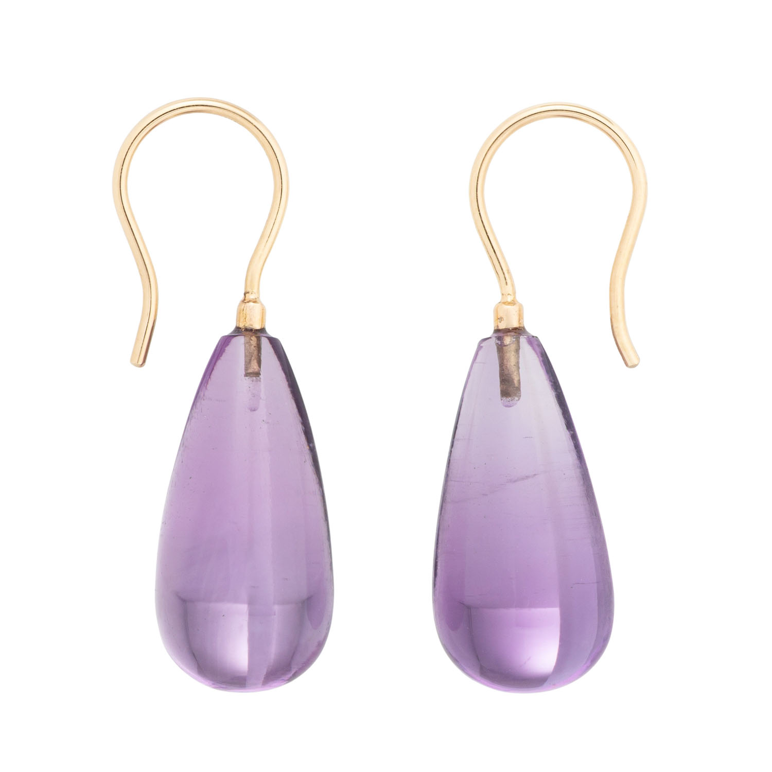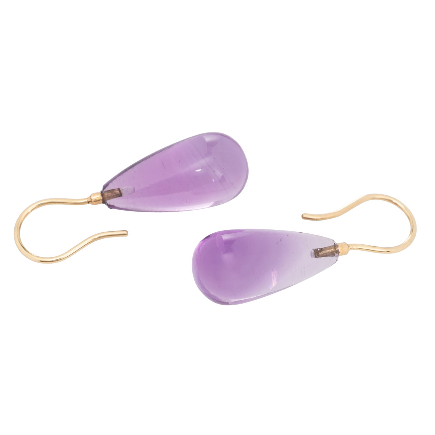Pair of pendant earrings with amethyst, total ca. 27 ct, YG 18K, 6 g. L x W 33 x 10 mm, 21st century, mint condition.