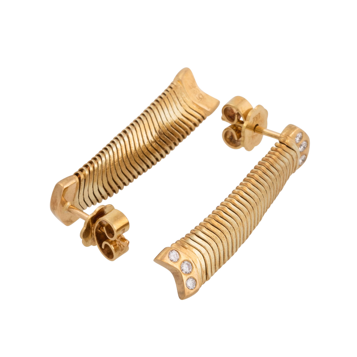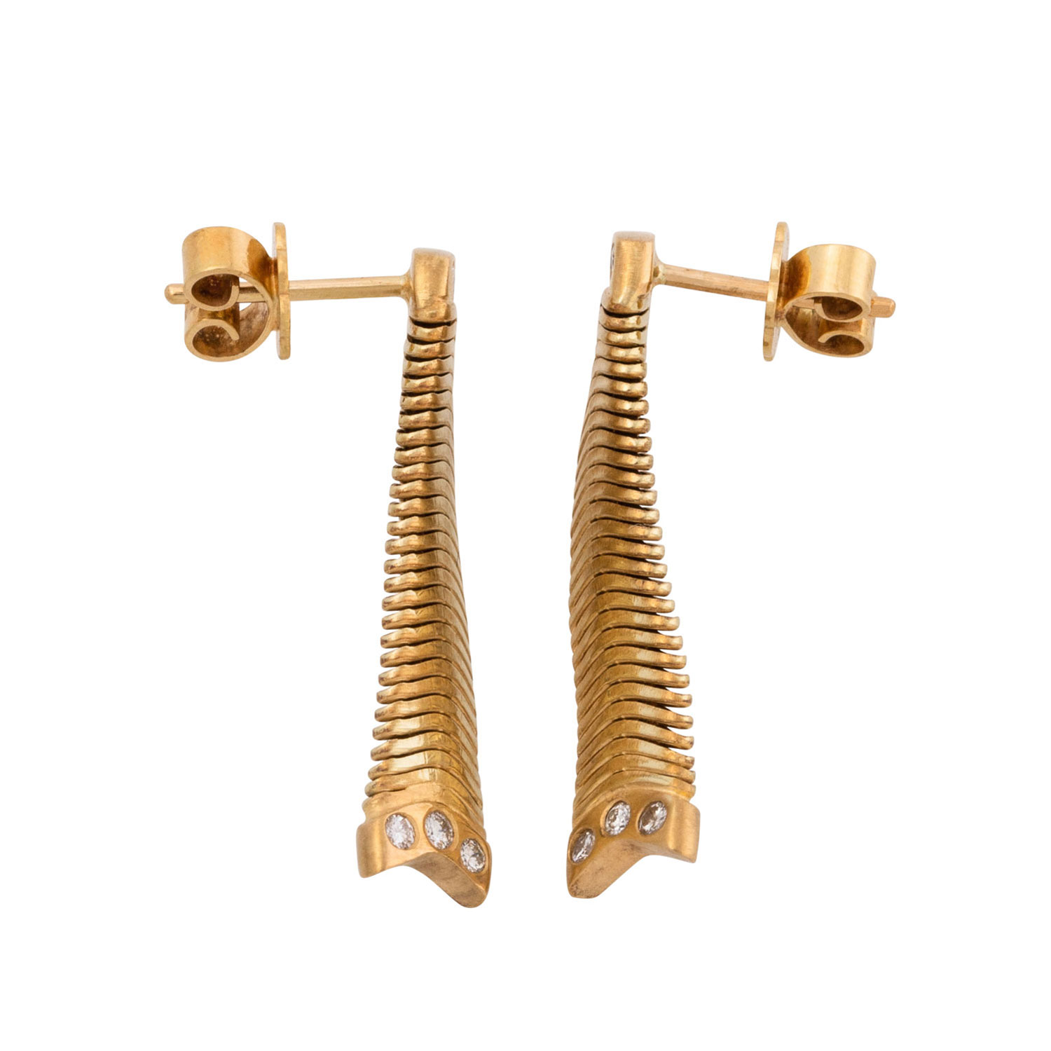 Pair of earrings with flat snake chain, 12 brilliant cut diamonds, totalling ap. 0.06 ct, 14K yellow gold, 5.9 g, L x W: 30 x 7 mm, late 20th century, minimal signs of wear.